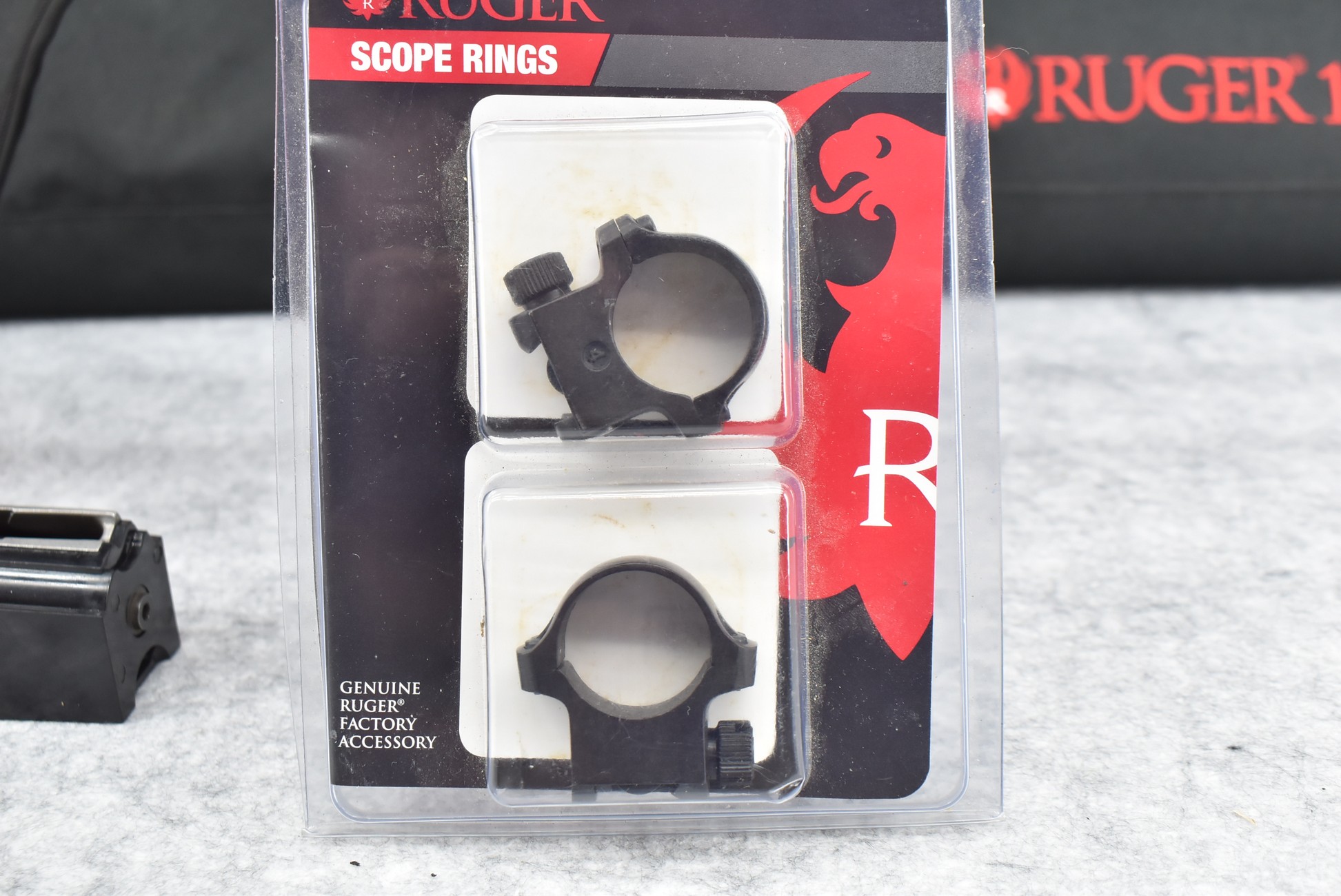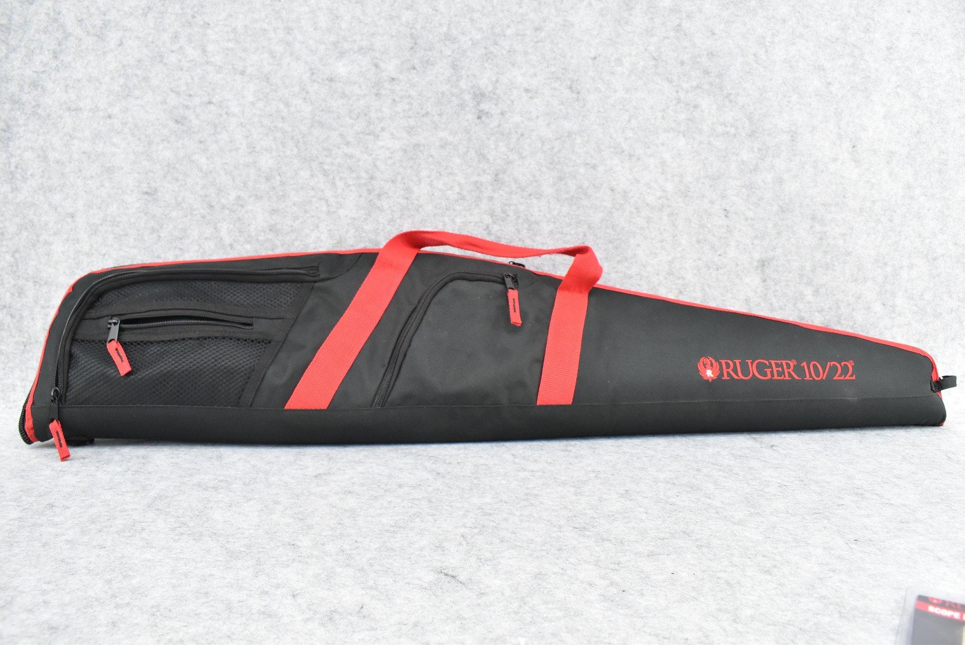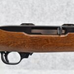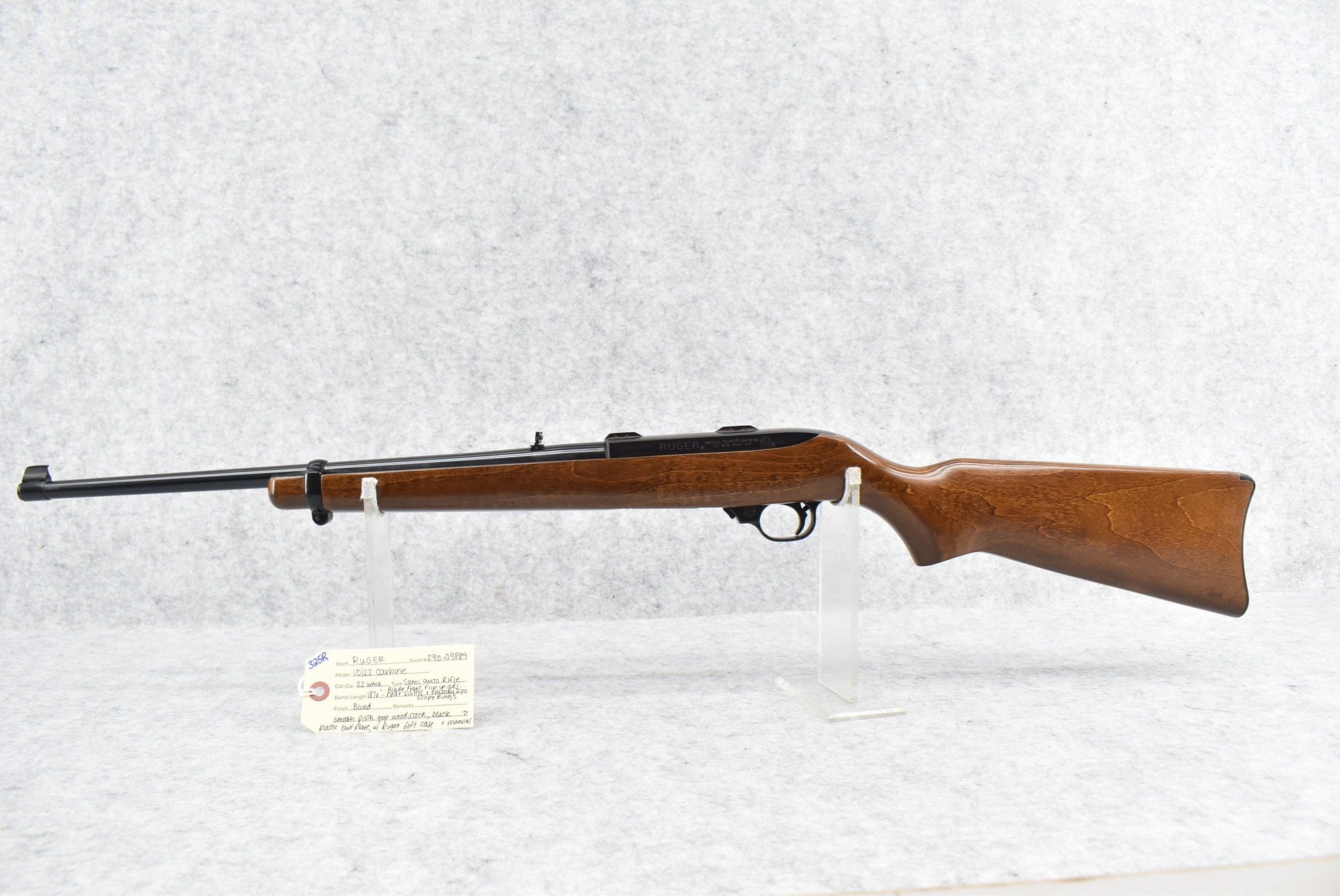 325R. Ruger – Mod 10/22 Carbine – 22 Win. Mag. Cal. Semi-Auto Rifle – w/18 ½” Barrel w/Blade Front & Flip Up Adj. Rear Sights – Blued Finish – w/Smooth Pistol Grip Wood Stock w/Butt Plate – w/Factory 2pc. Scope Rings – w/Ruger Soft Case, Manual & 3 Factory Detachable Magazines – Mfg. Between 1999-2006 Only!