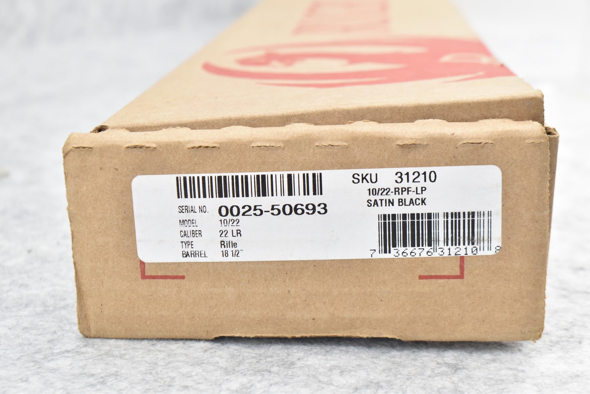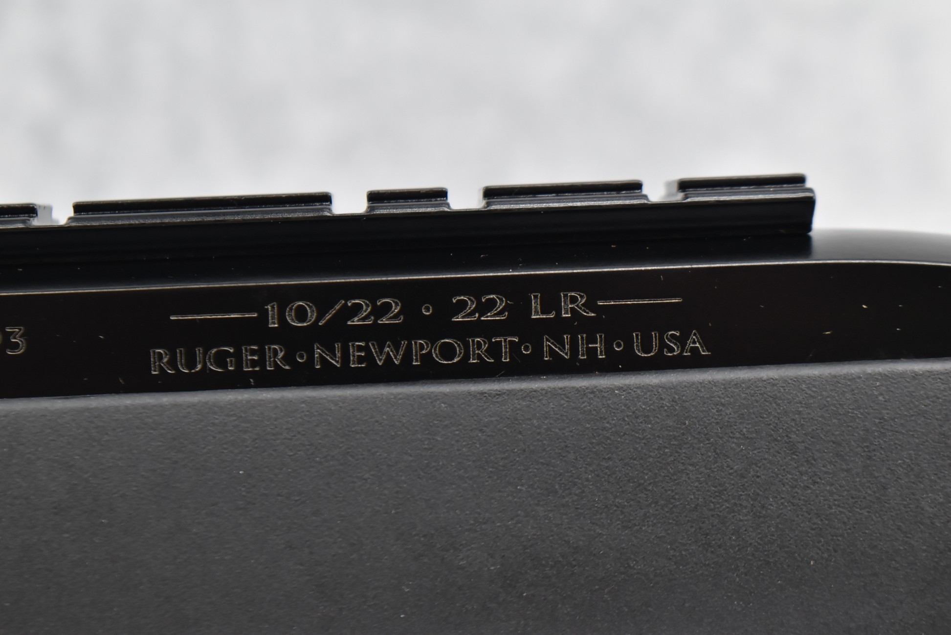 326R.     Ruger – Mod. 10/22 Synthetic – 22 Long Rifle Cal. Semi-Auto Rifle – w/18 ½” Barrel (No Sights) – Blued Finish – w/Checkered Capped Black Synthetic Pistol Grip Stock w/Factory Butt Plate – w/Factory Magazine – Unfired w/Factory Box & Manual