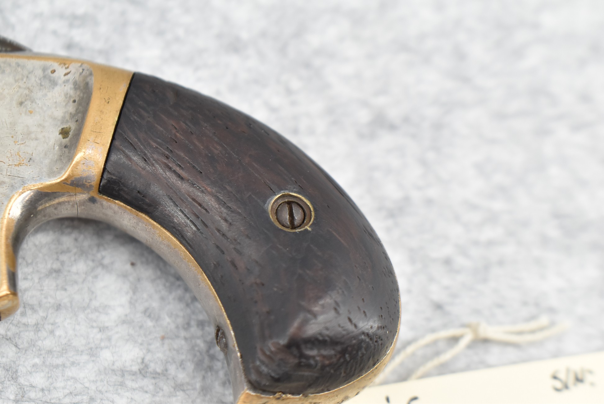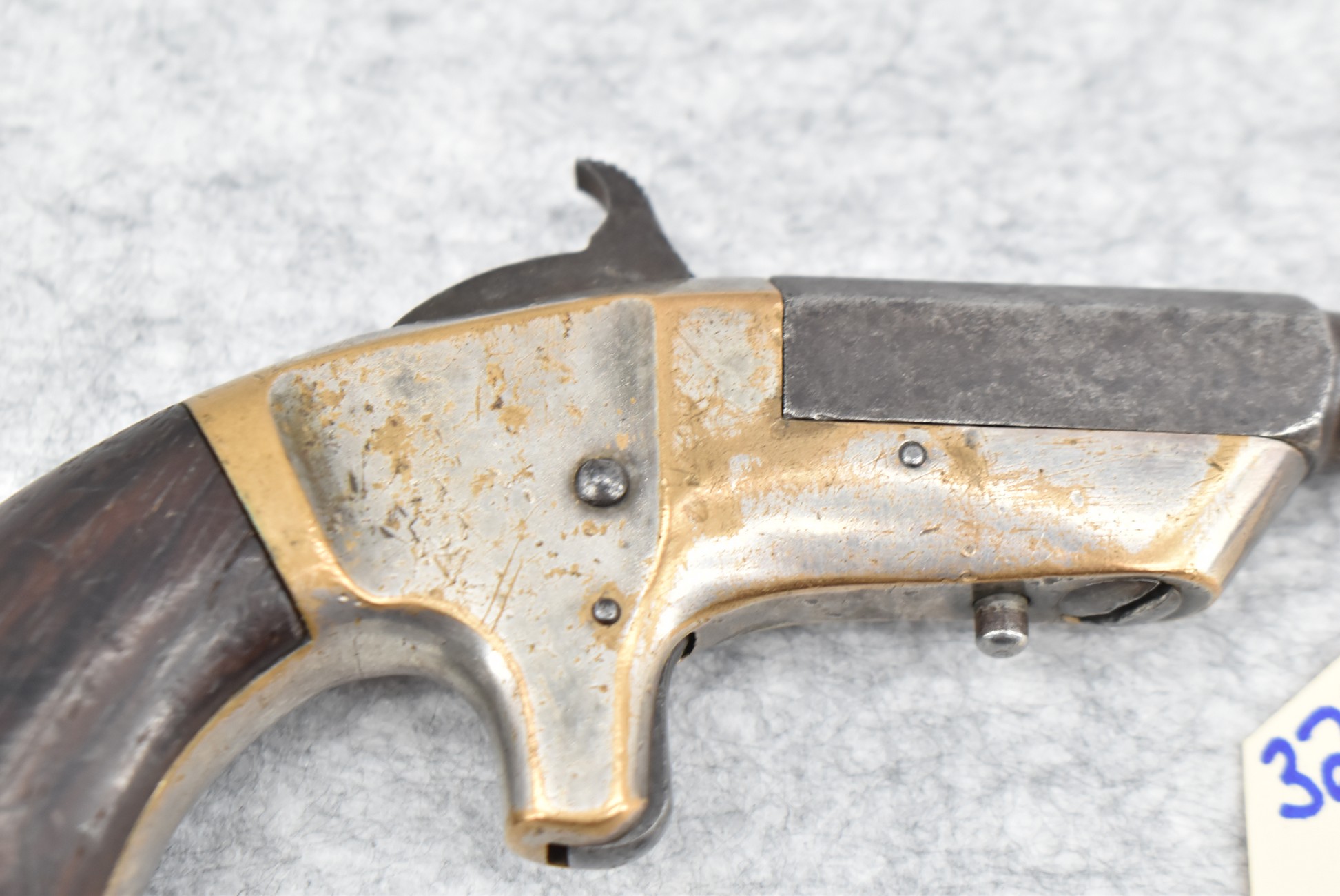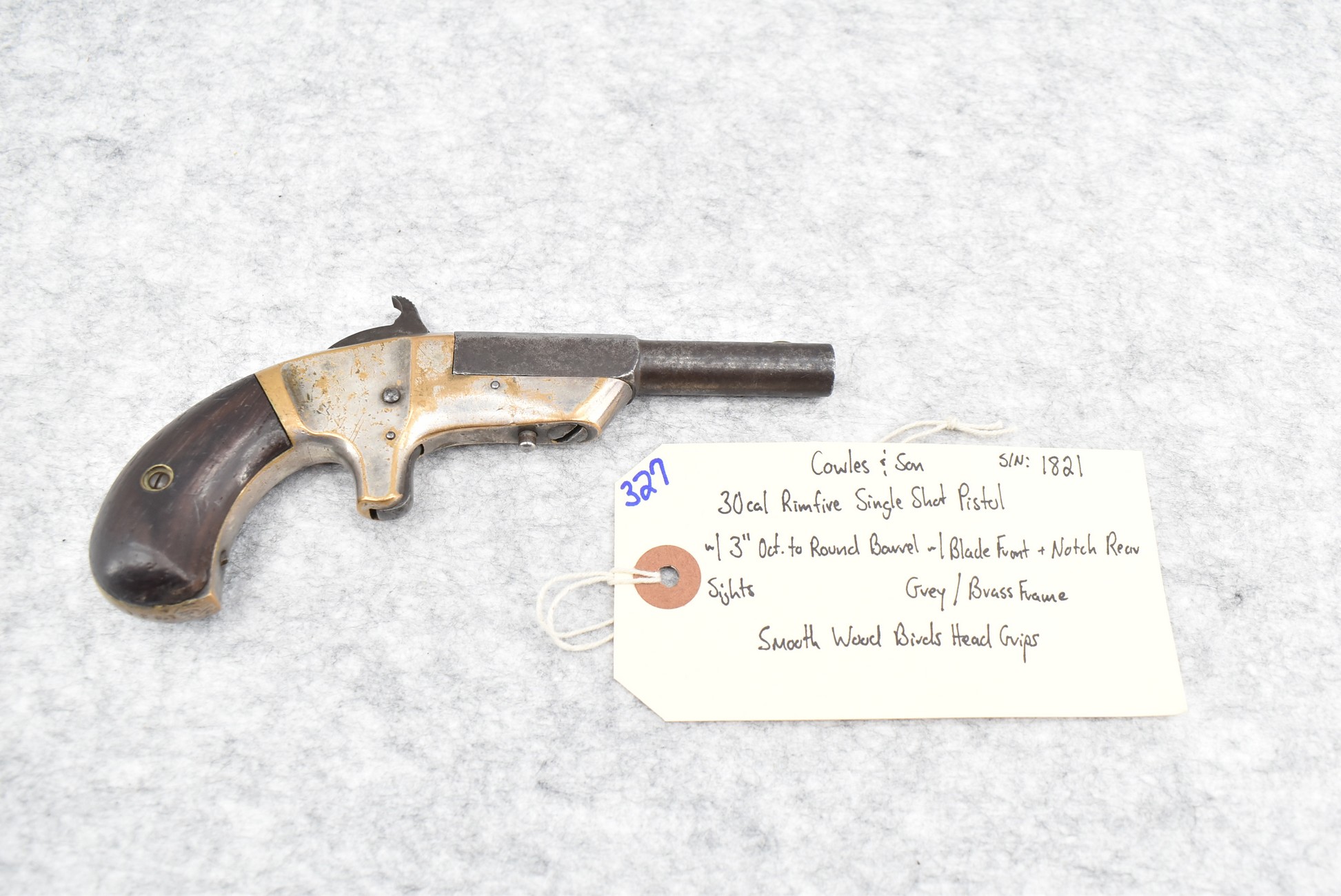 327. Cowles & Son – 30 Cal. RF Single Shot Pistol – w/3” Octagon to Round Barrel w/Blade Front & Notch Rear Sights – Gray Finish w/Brass Frame – w/Smooth Wood Birds Head Grips