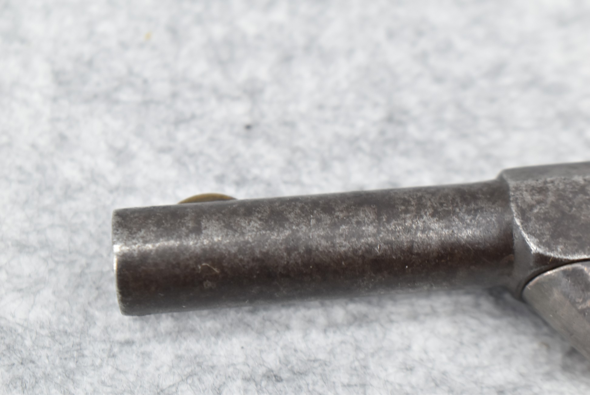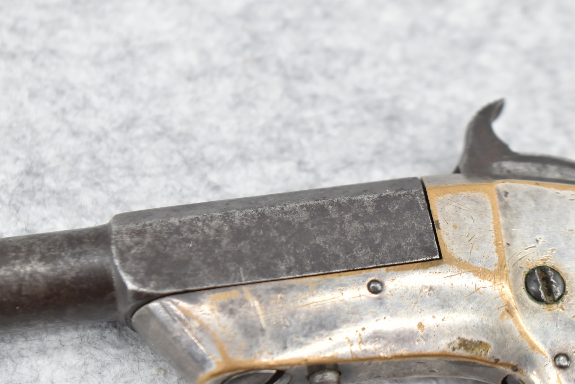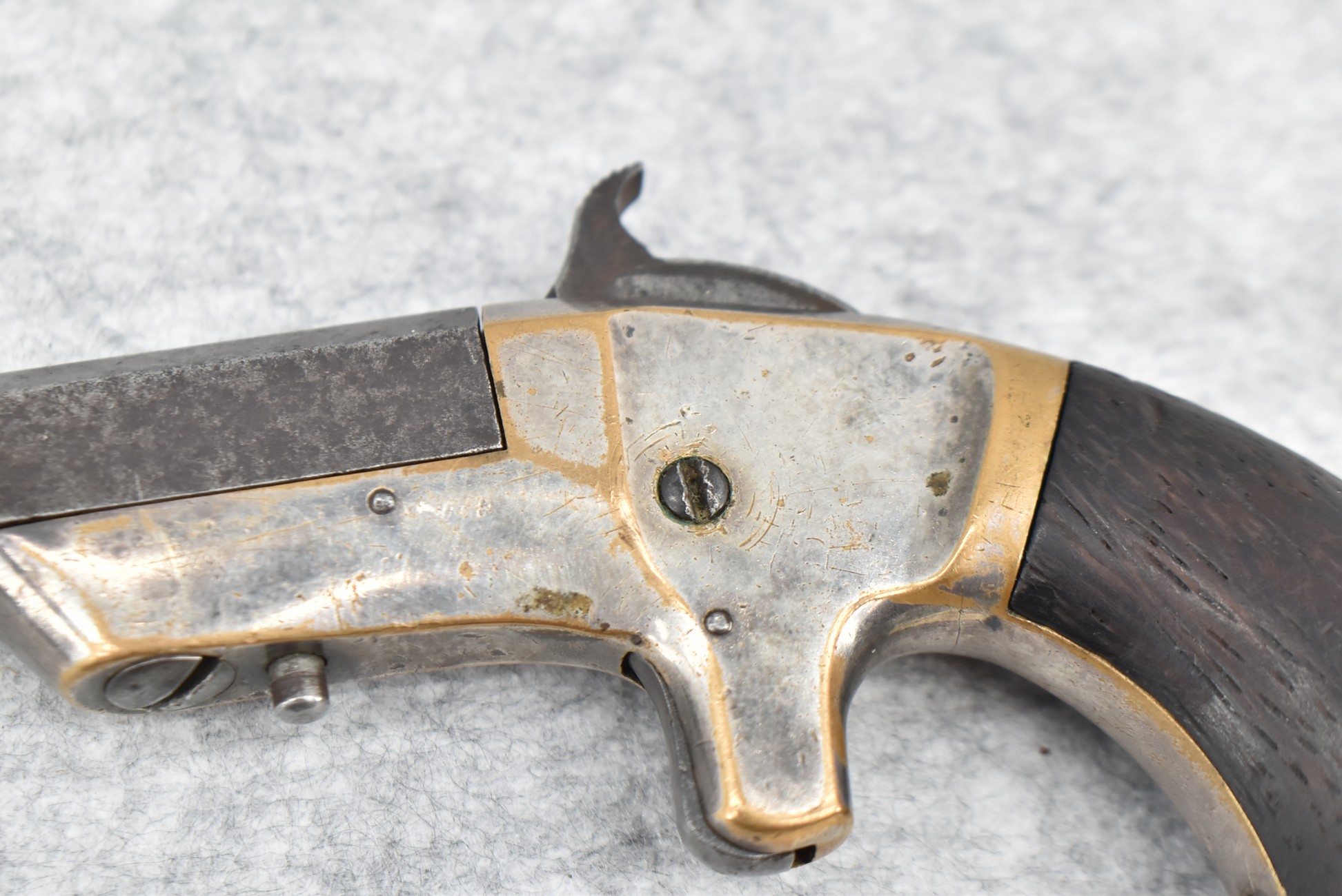 327. Cowles & Son – 30 Cal. RF Single Shot Pistol – w/3” Octagon to Round Barrel w/Blade Front & Notch Rear Sights – Gray Finish w/Brass Frame – w/Smooth Wood Birds Head Grips