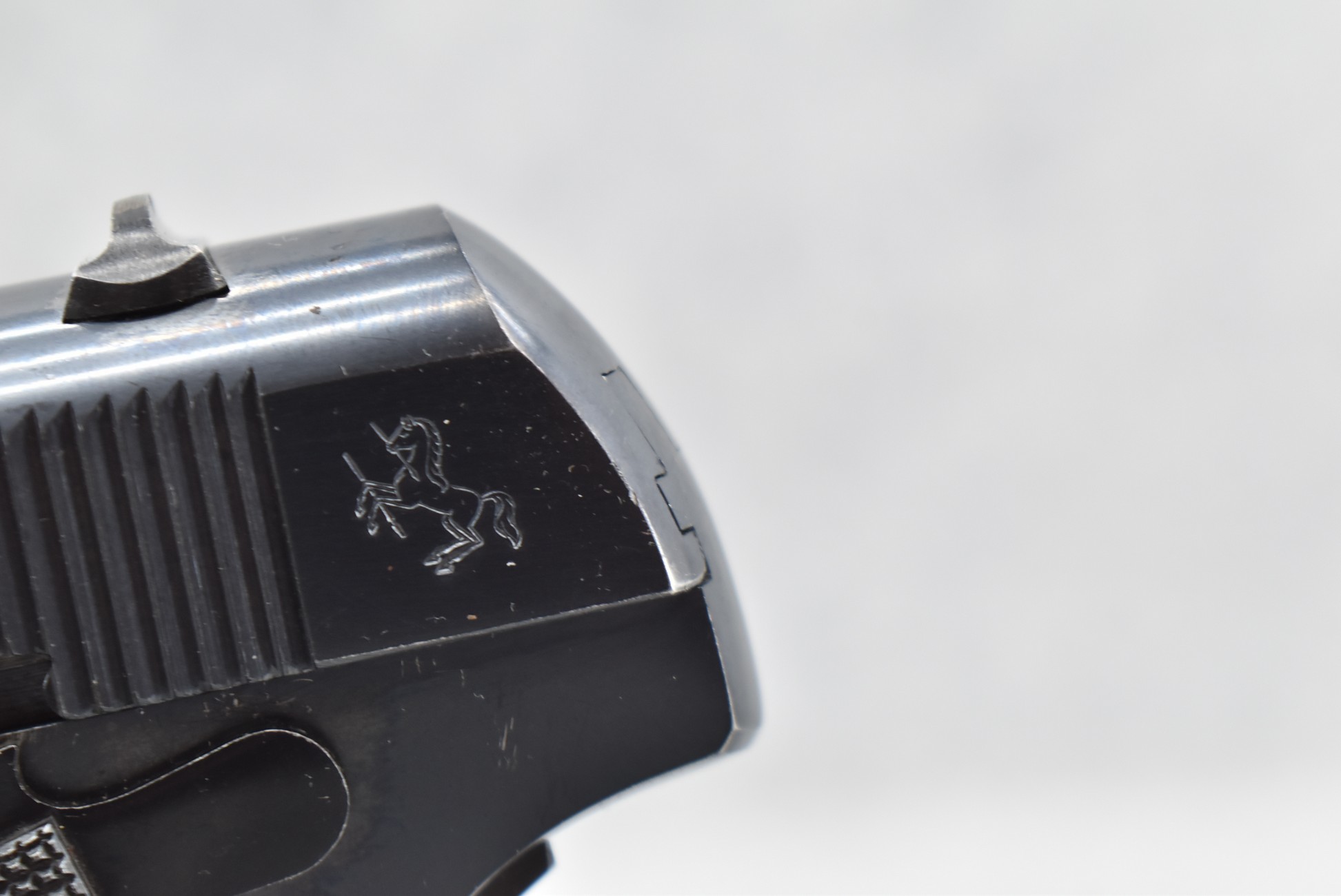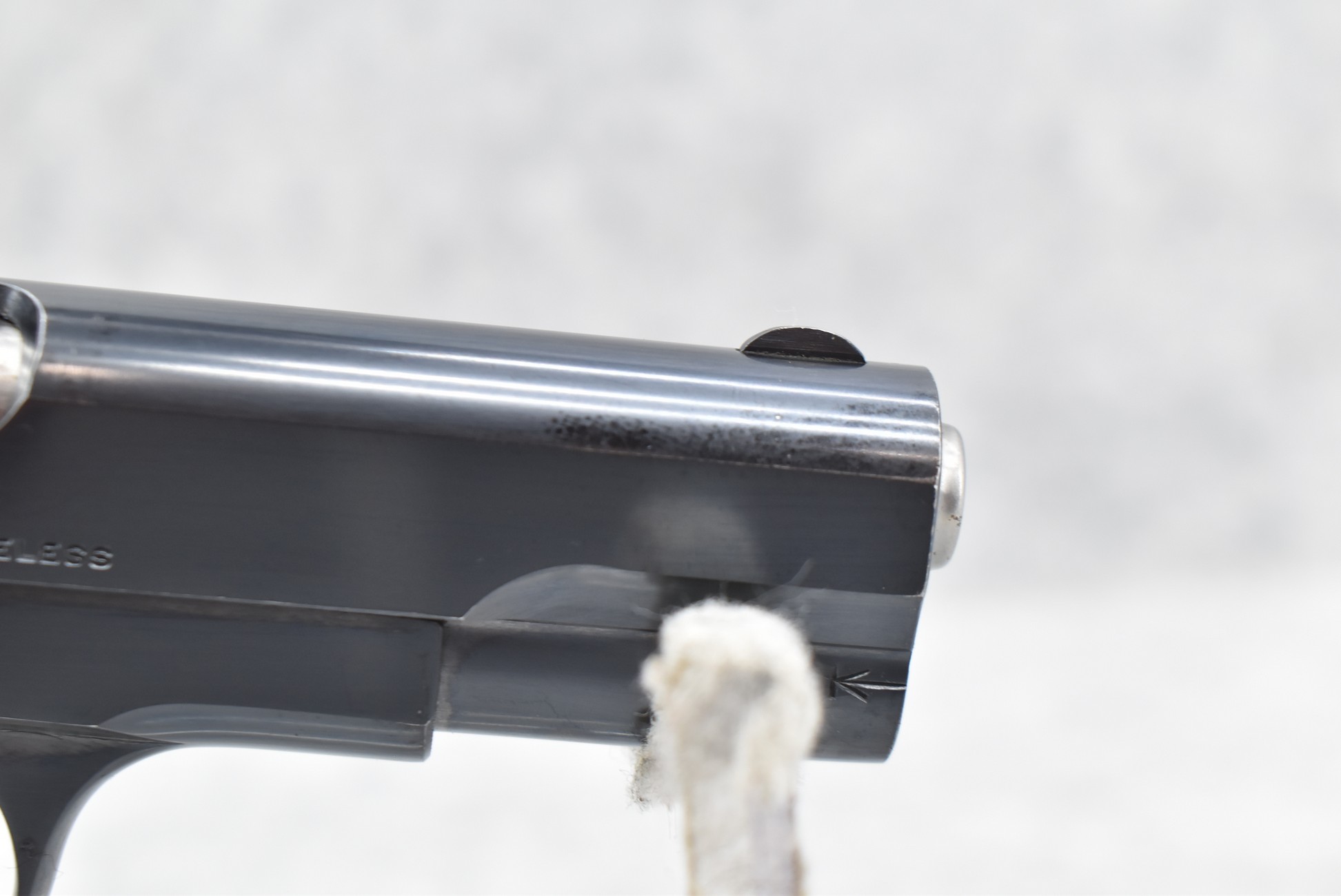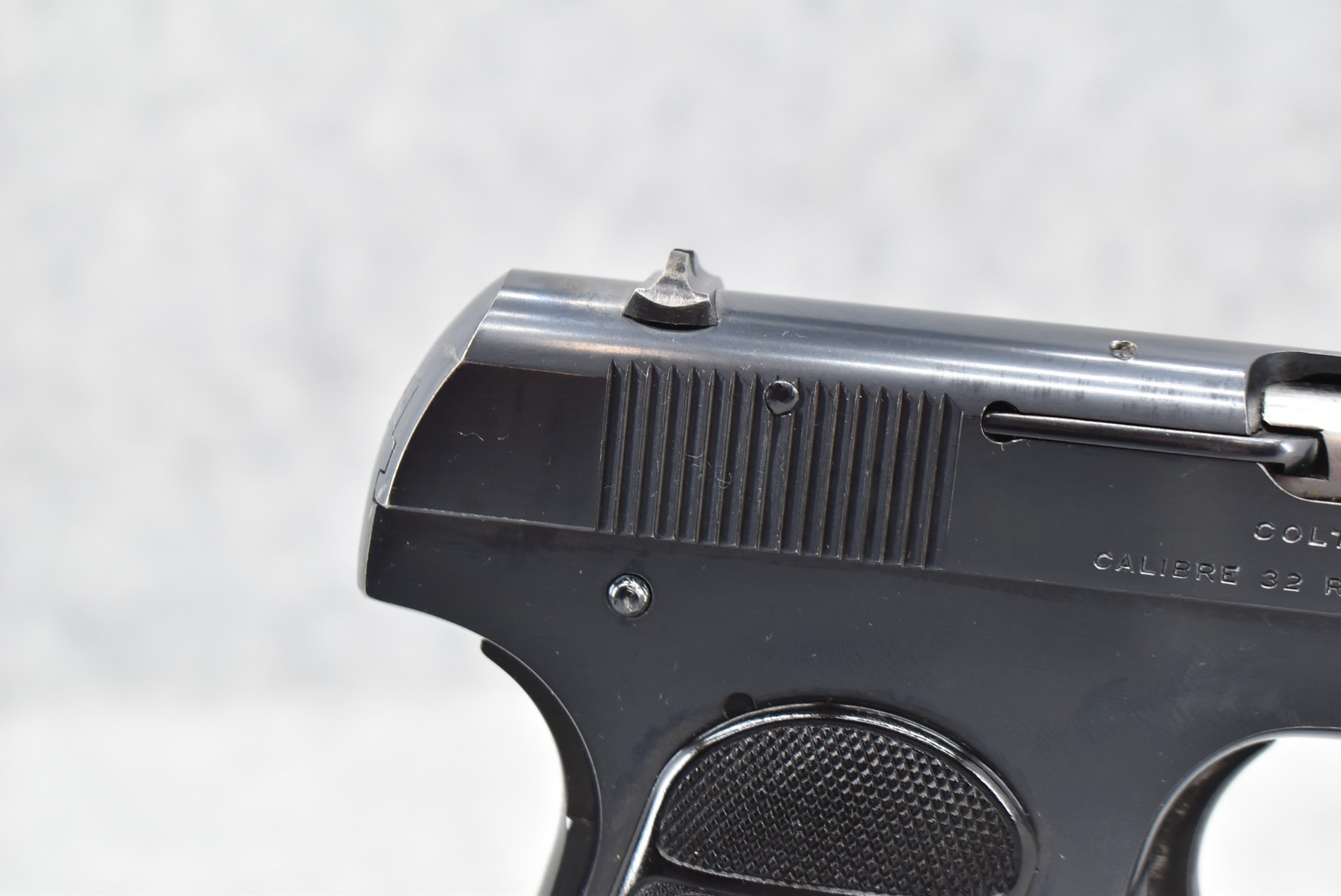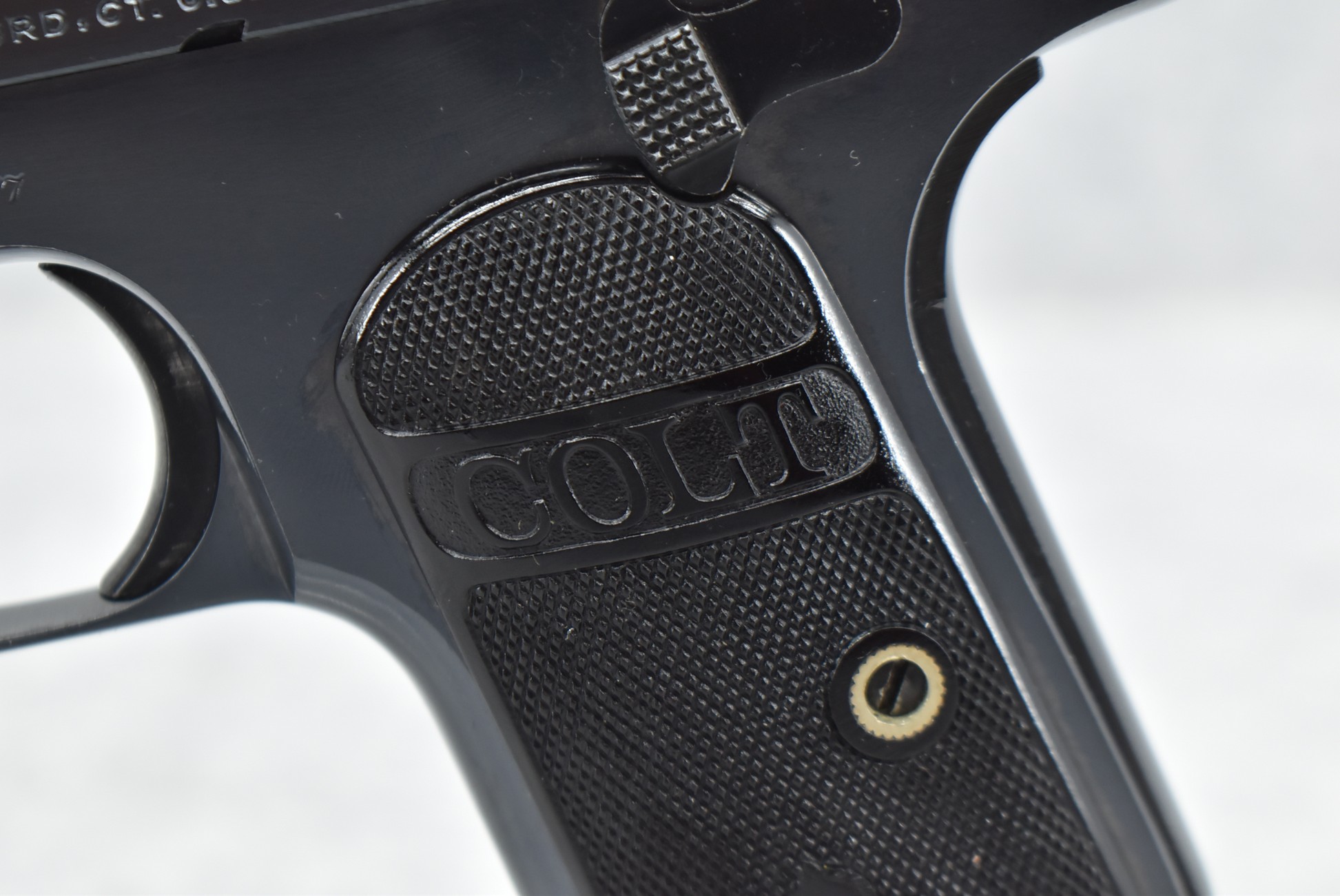 327R. Colt – Mod. 1903 Pocket Hammerless – 32 ACP Cal. Semi-Auto Pistol – w/3 ¾” Barrel w/Round Blade Front & Notch Rear Sights – Strong Blued Finish! – w/Factory Checkered Hard Rubber Grips w/Rampant Colt – w/Factory Two-Tone Magazine – Mfg. 1919 – Excellent Example