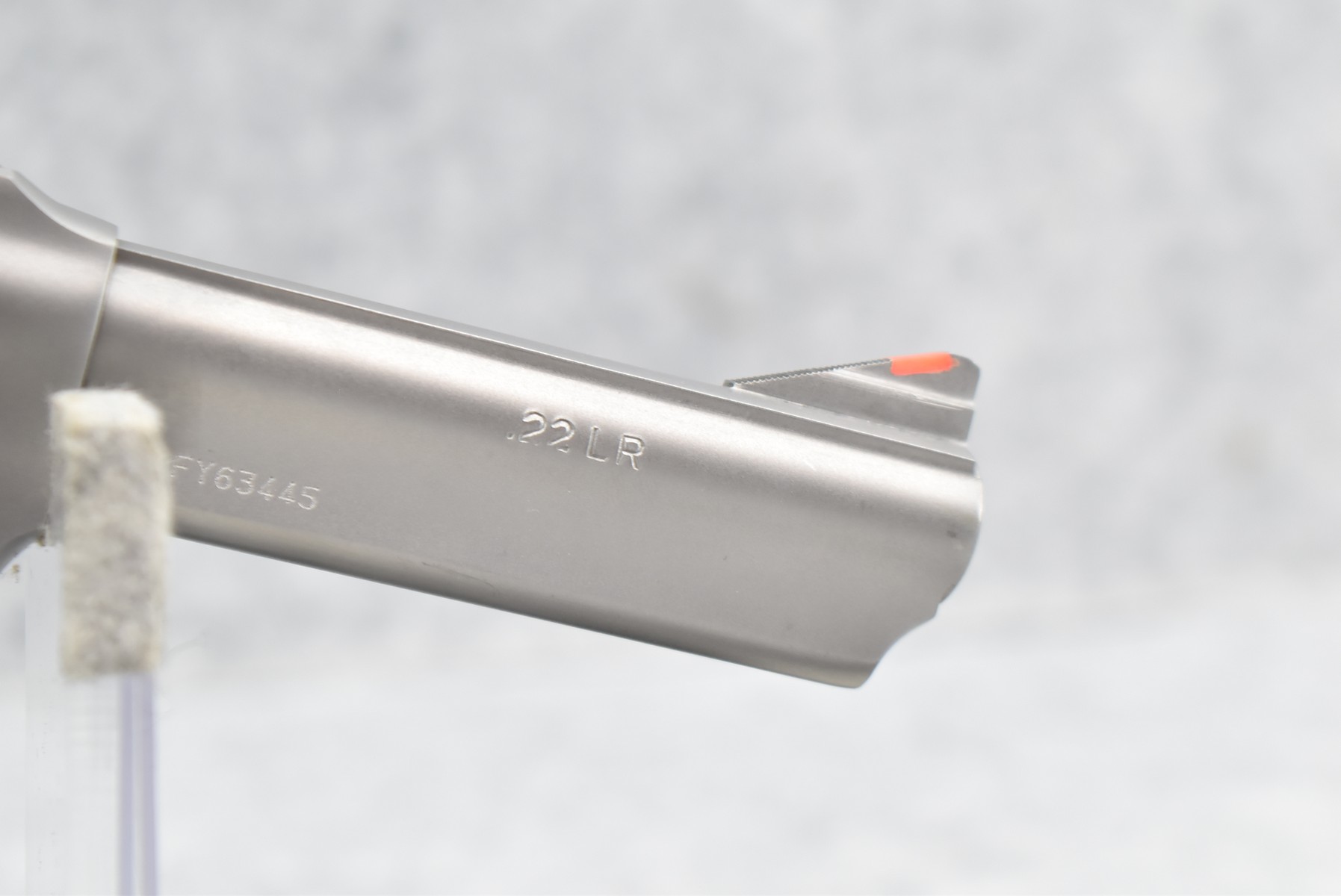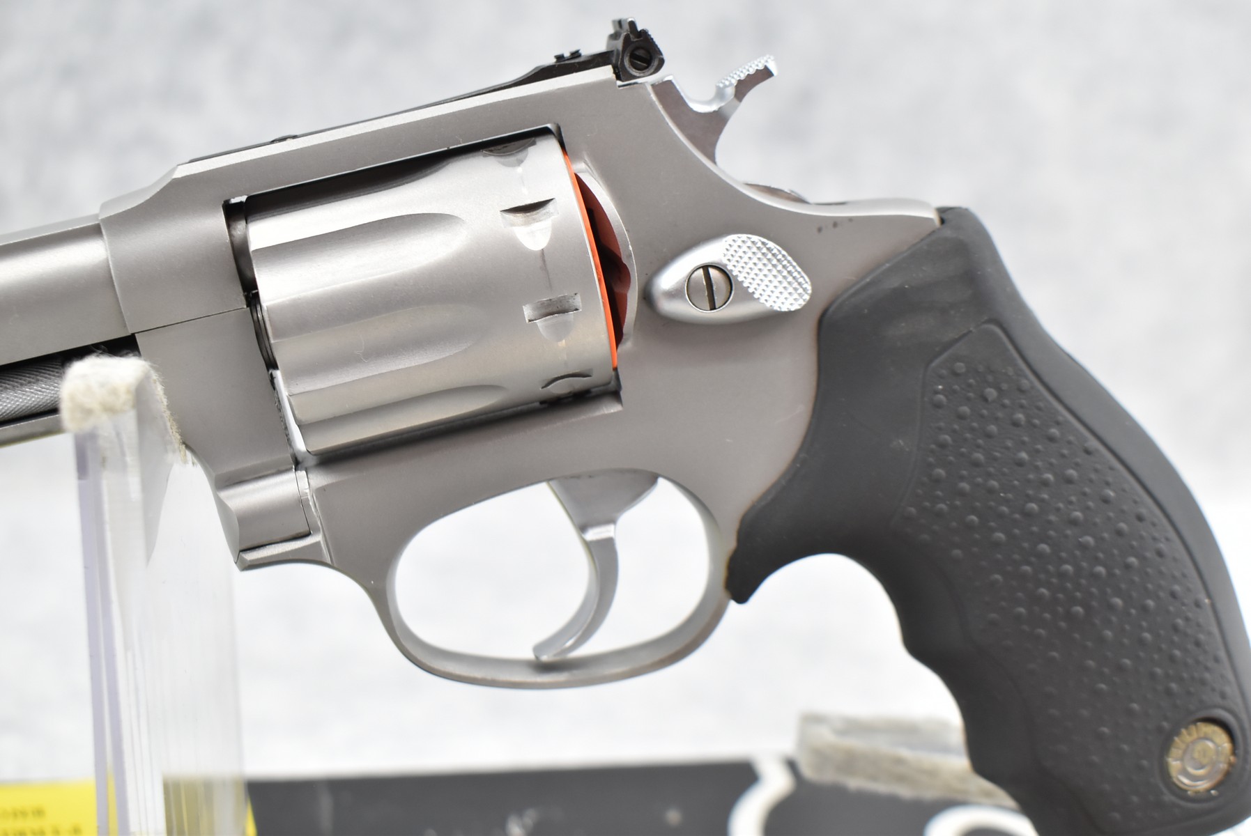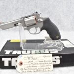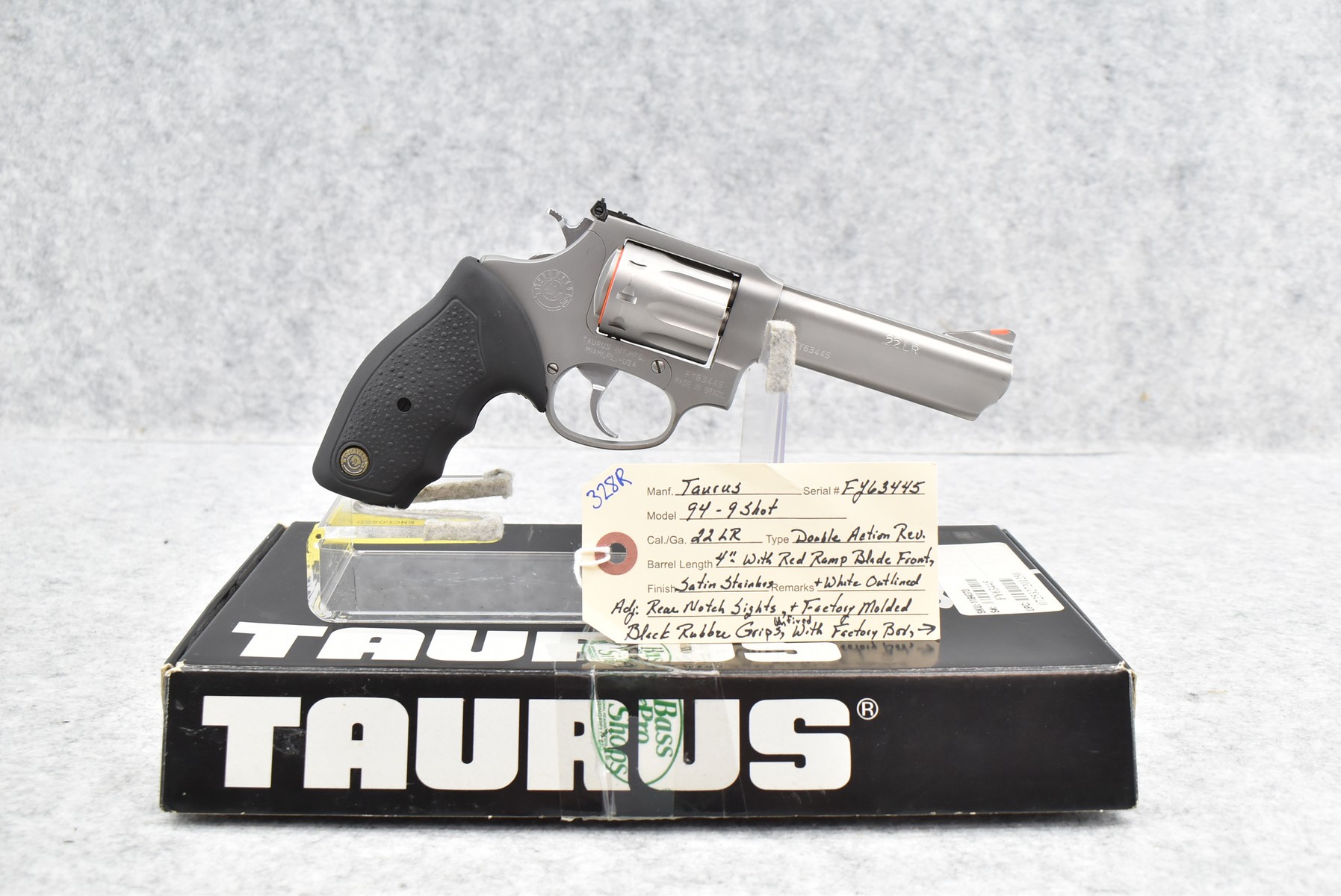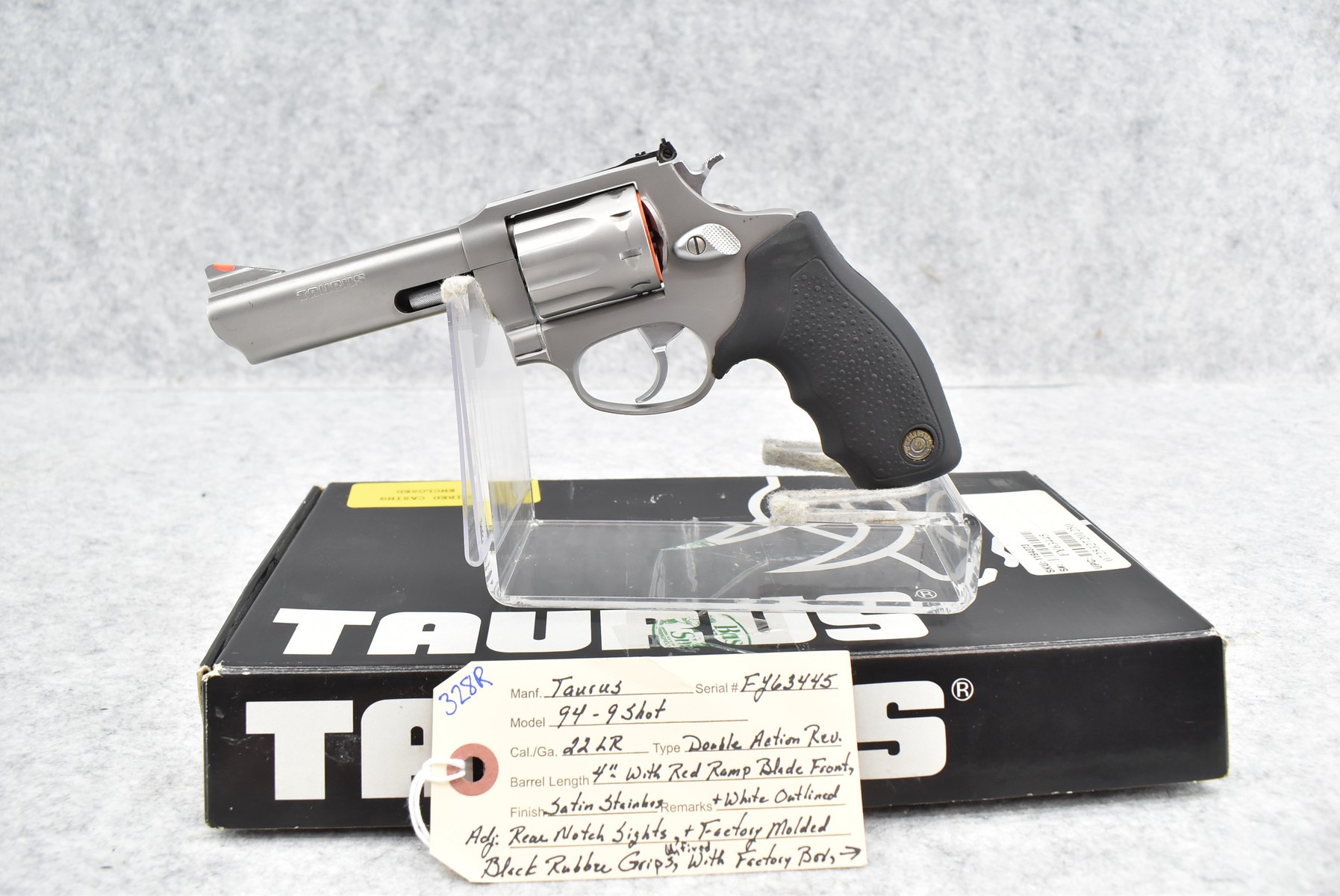 328R. Taurus – Mod. 94 – 22LR Cal. Double Action 9-Shot Revolver – w/4” Barrel w/Red Ramp Blade Front & White Outlined Adj. Rear Notch Sights – Satin Stainless Finish – w/Factory Molded Black Rubber Grips – Unfired w/Factory Box, Manual & Accessories