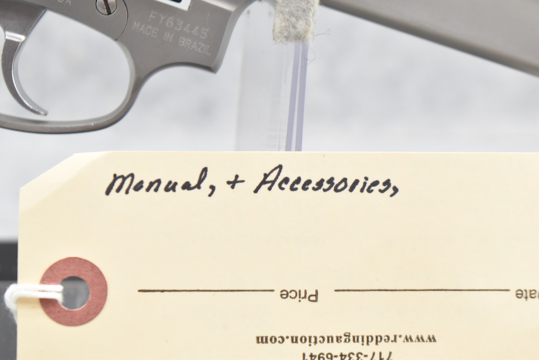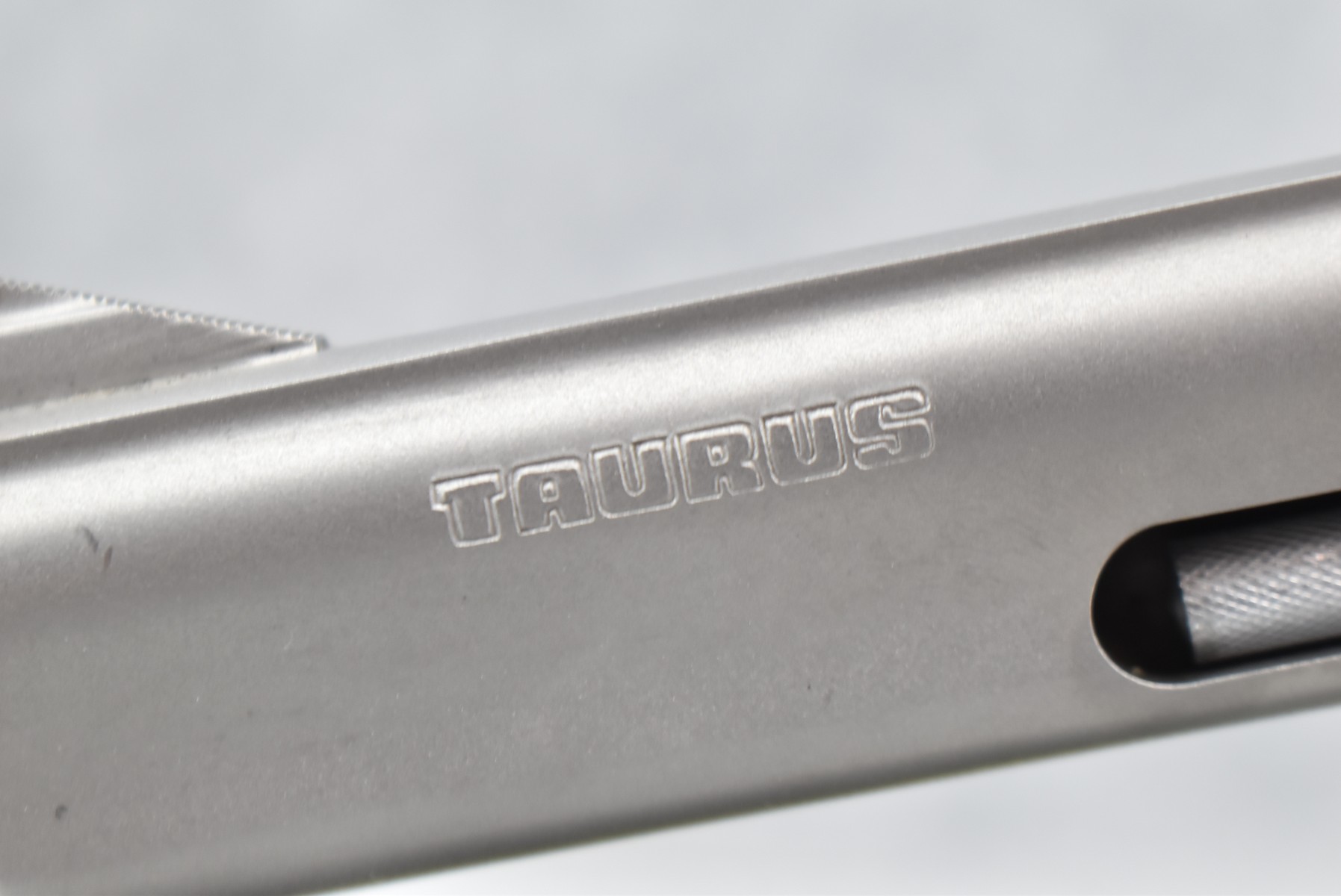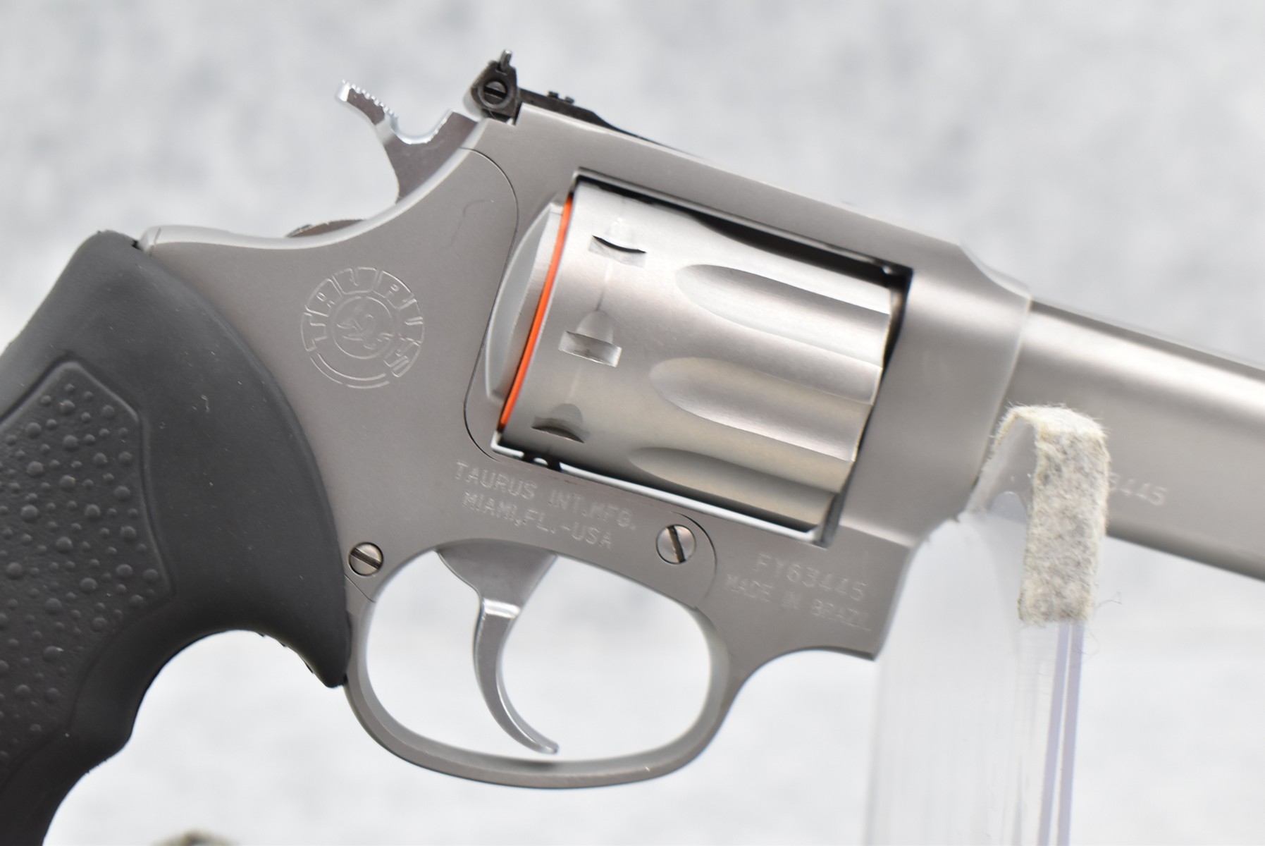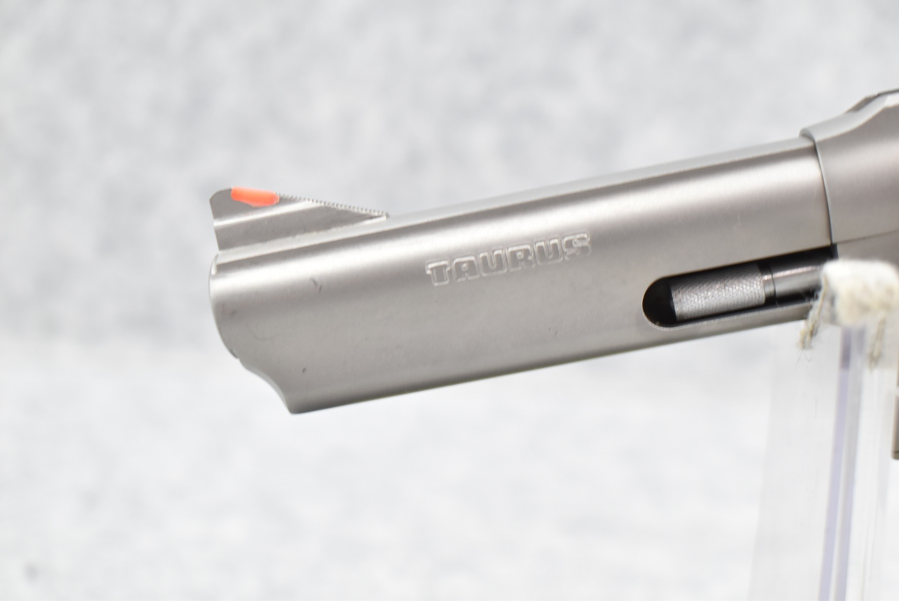 328R. Taurus – Mod. 94 – 22LR Cal. Double Action 9-Shot Revolver – w/4” Barrel w/Red Ramp Blade Front & White Outlined Adj. Rear Notch Sights – Satin Stainless Finish – w/Factory Molded Black Rubber Grips – Unfired w/Factory Box, Manual & Accessories