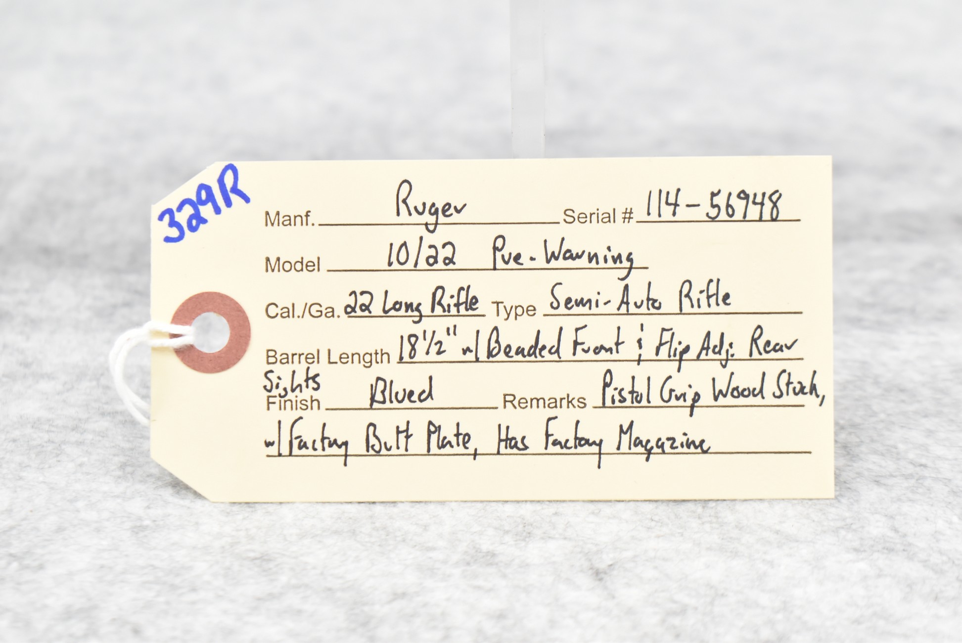 329R. Ruger – Mod. 10/22 (Pre-Warning) – 22 Long Rifle Cal. Semi-Auto Rifle – w/18 ½” Barrel w/Beaded Front & Flip Adj. Rear Sights – Blued Finish – w/Pistol Grip Wood Stock w/Factory Butt Plate – w/Factory Magazine