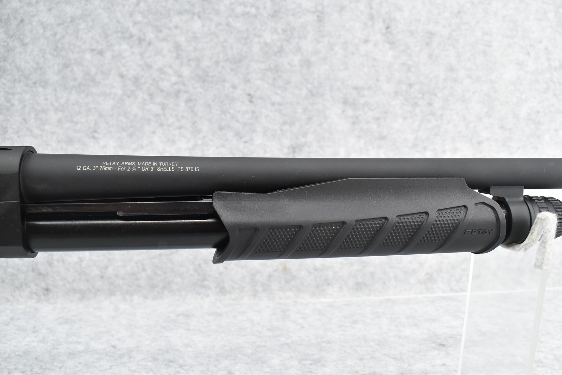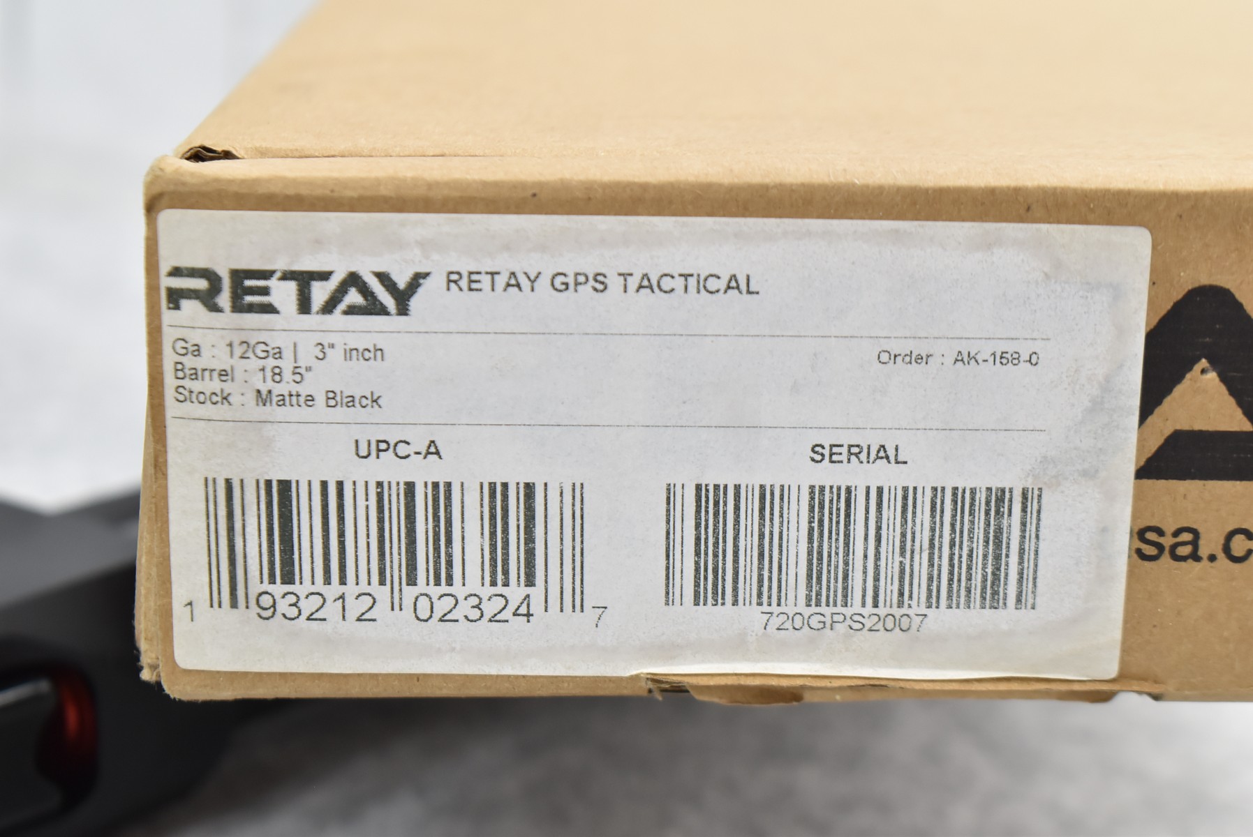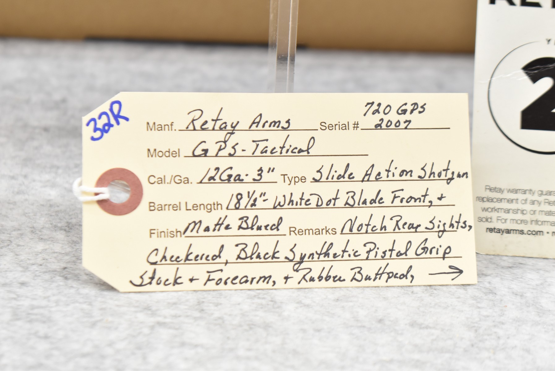 32R. Retay Arms – Mod. GPS Tactical – 12ga. 3” Pump Action Shotgun – w/18 ½” Barrel w/White Dot Blade Front & Notch Rear Sights – Matte Blued Finish – w/Checkered Black Synthetic Pistol Grip Stocks w/Butt Pad – Unfired w/Factory Box, Chokes, Manual & Accessories