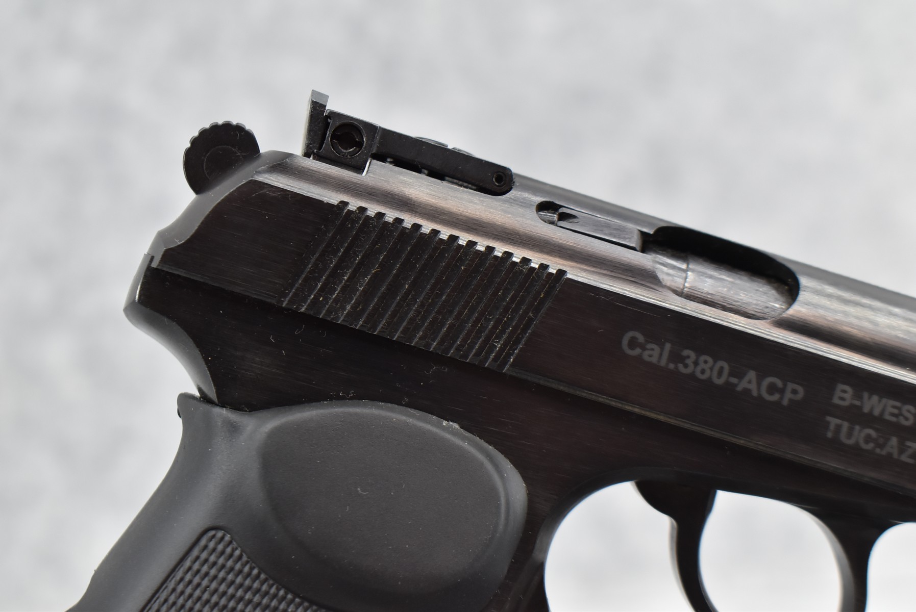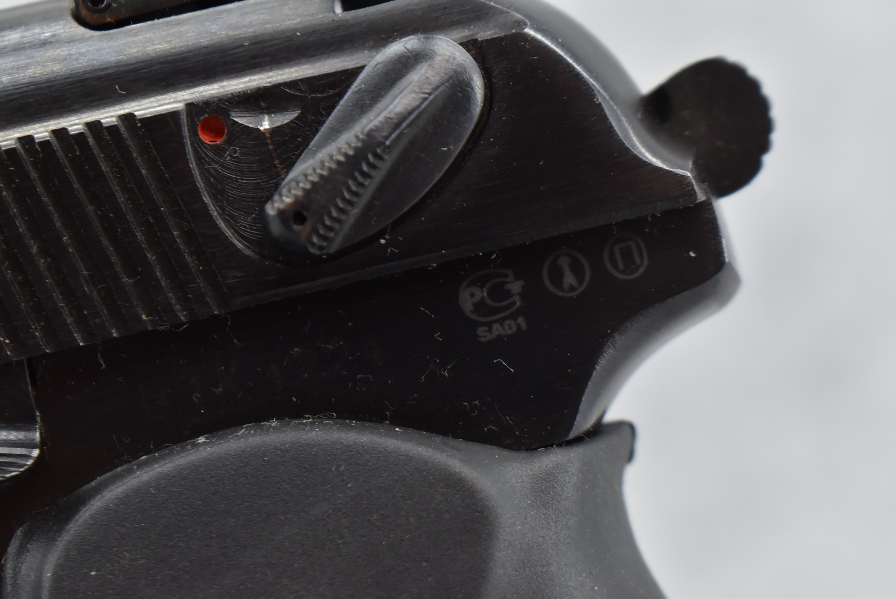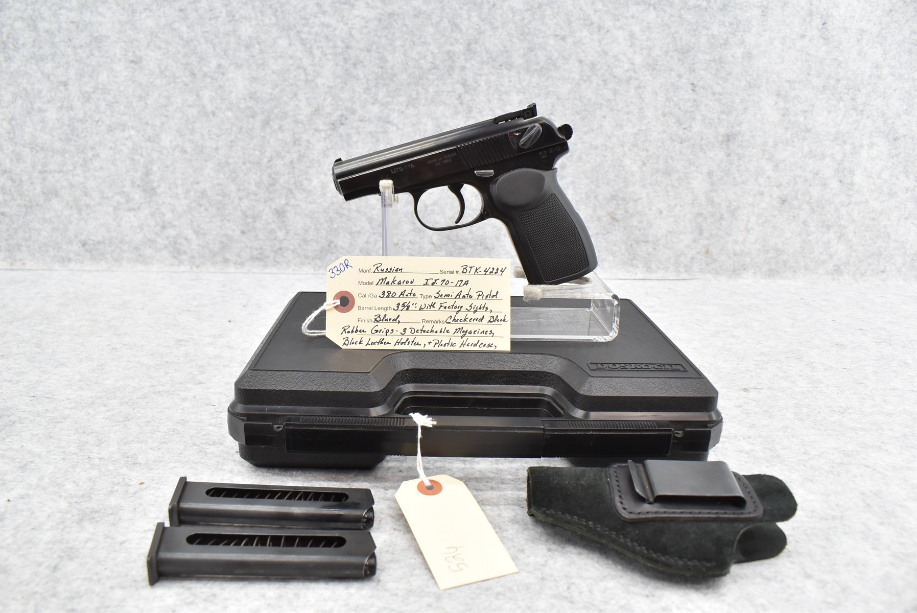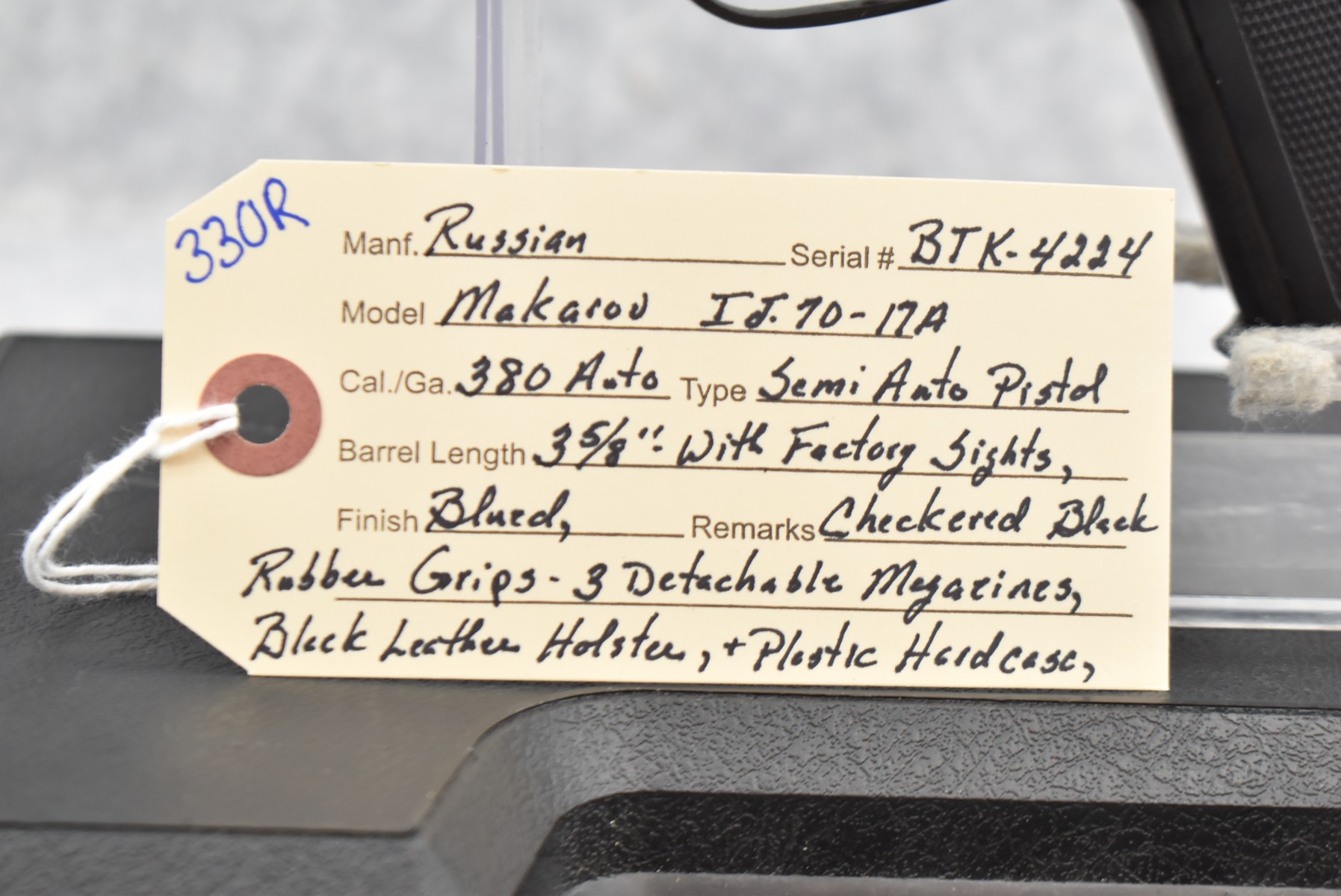 330R. Russian – Mod. Makarov IJ-70-17A – 380 Auto Cal. Semi-Auto Pistol – w/3 5/8” Barrel w/Factory Sights – Blued Finish – w/Checkered Black Rubber Grips – w/3 Detachable Magazines – w/Black Leather Holster – w/Plastic Hard Case