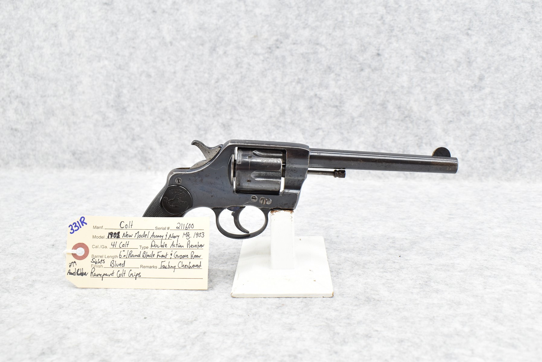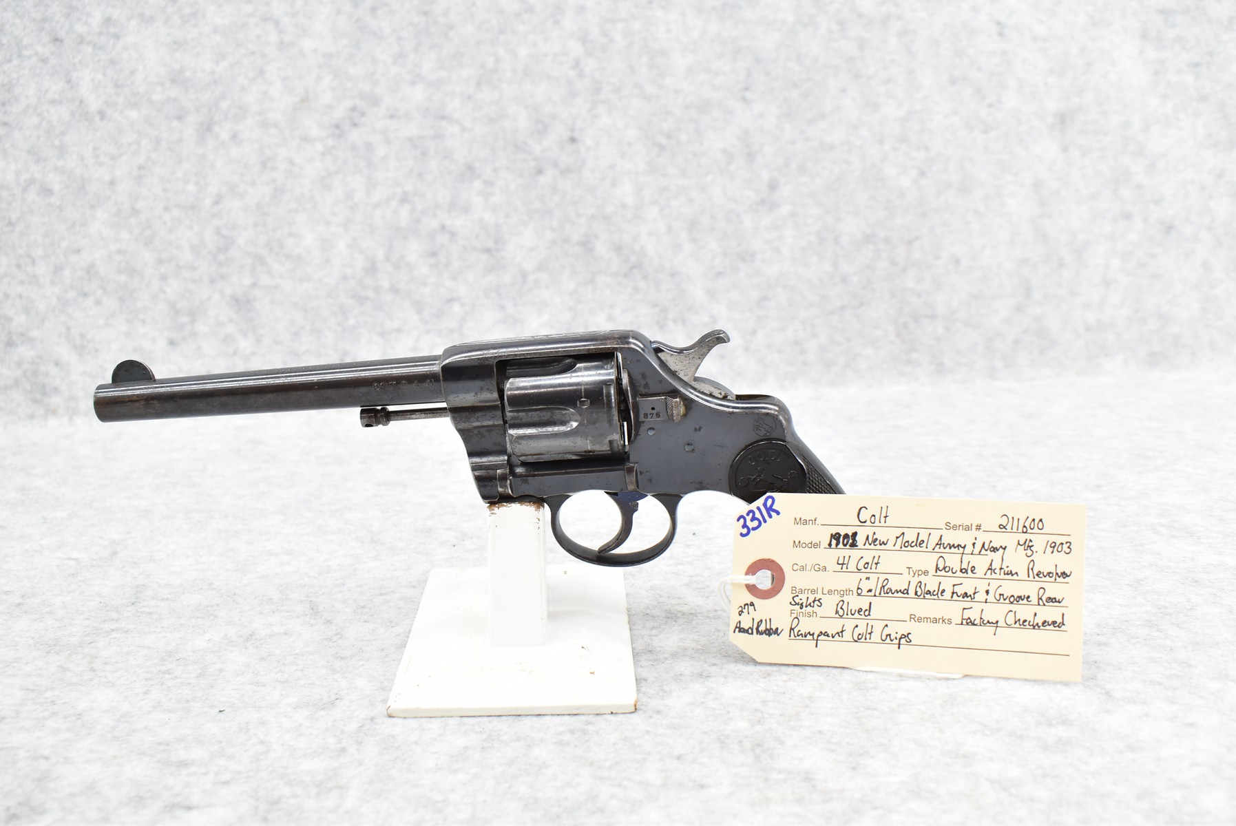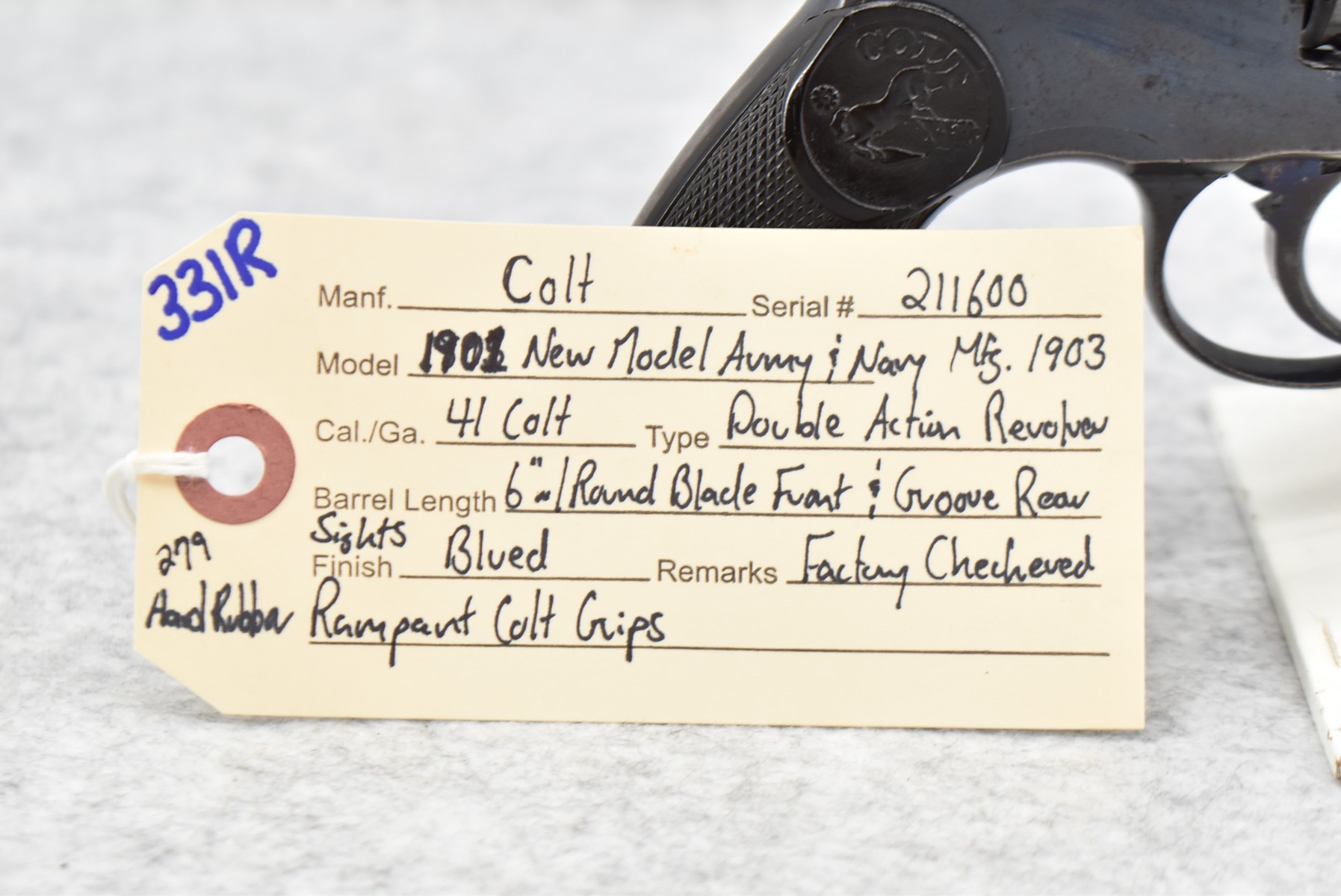 331R. Colt – 1901 New Model Army & Navy – 41 Colt Cal. Double Action Revolver – w/6” Barrel w/Round Blade Front & Groove Rear Sights – Blued Finish – w/Factory Checkered Hard Rubber Rampant Colt Grips – Mfg. 1903