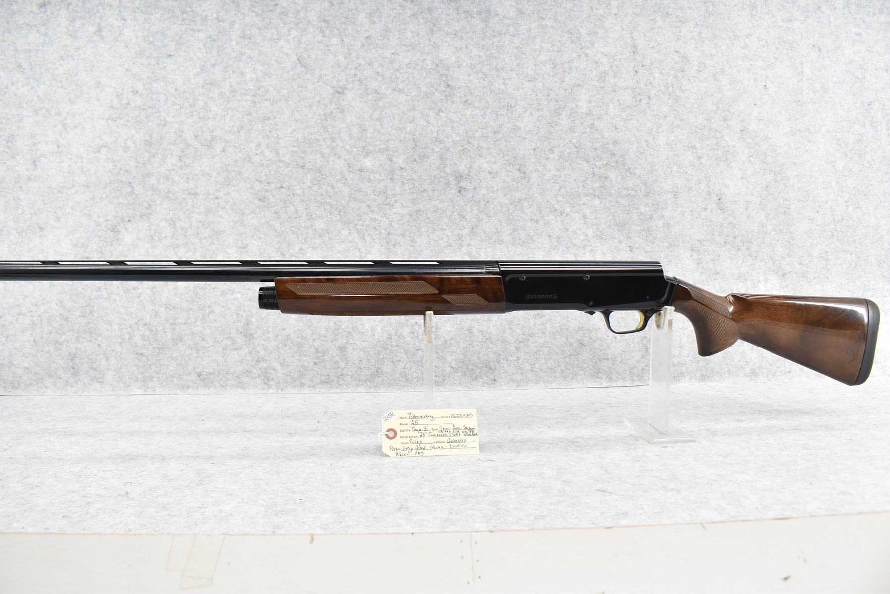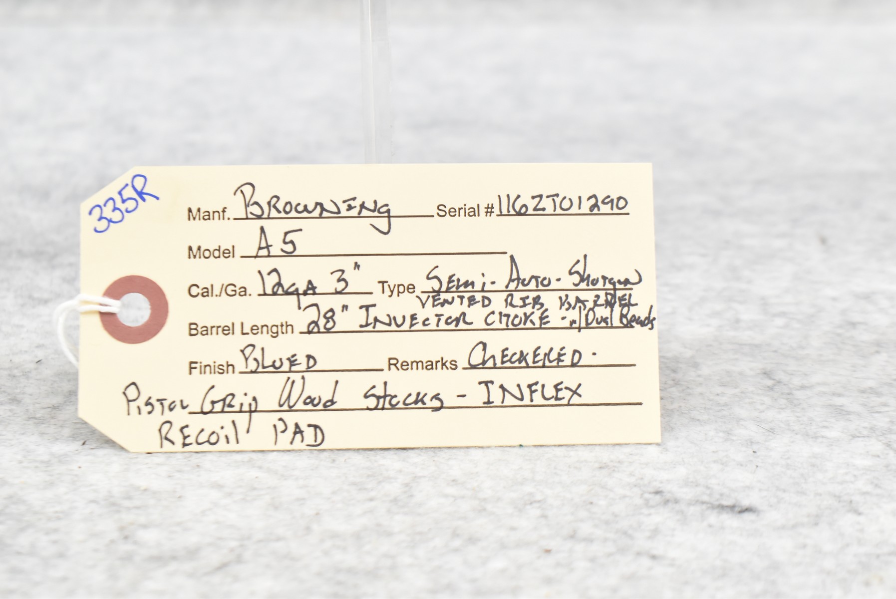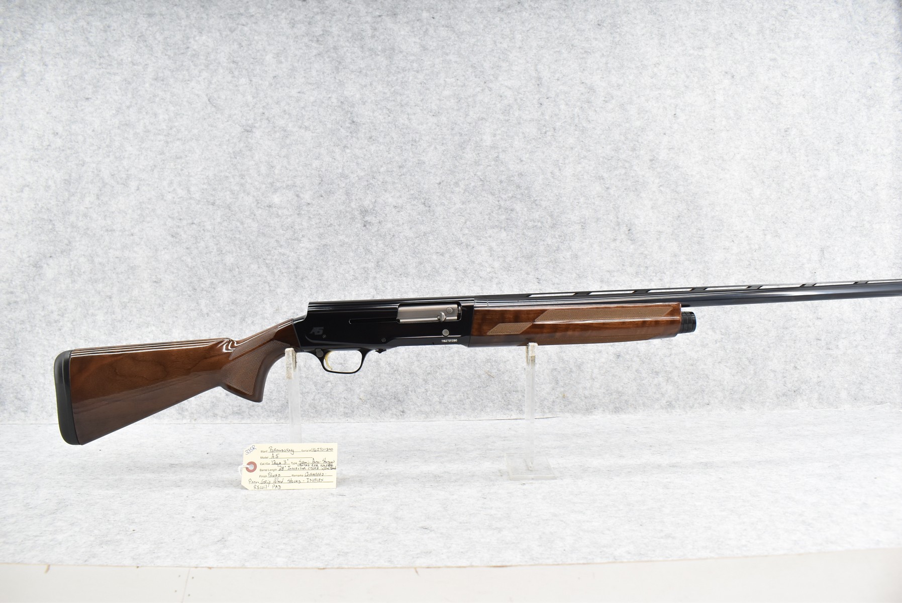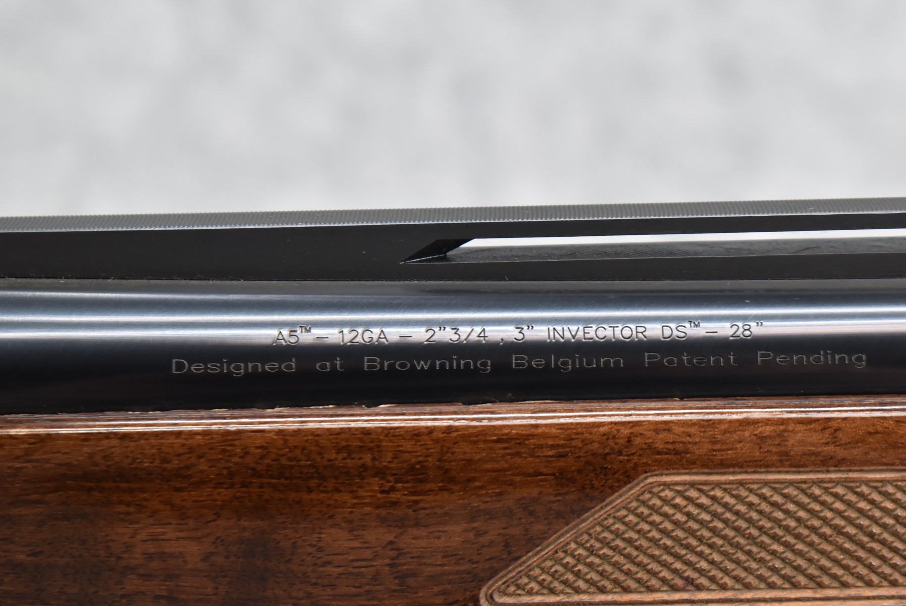 335R. Browning – Mod. A5 – 12ga. 3” Semi-Auto Shotgun – w/28” Invector Choked, Vent-Rib Barrel w/Dual Beads – Blued Finish – w/Checkered Pistol Grip Wood Stocks w/Inflex Recoil Pad
