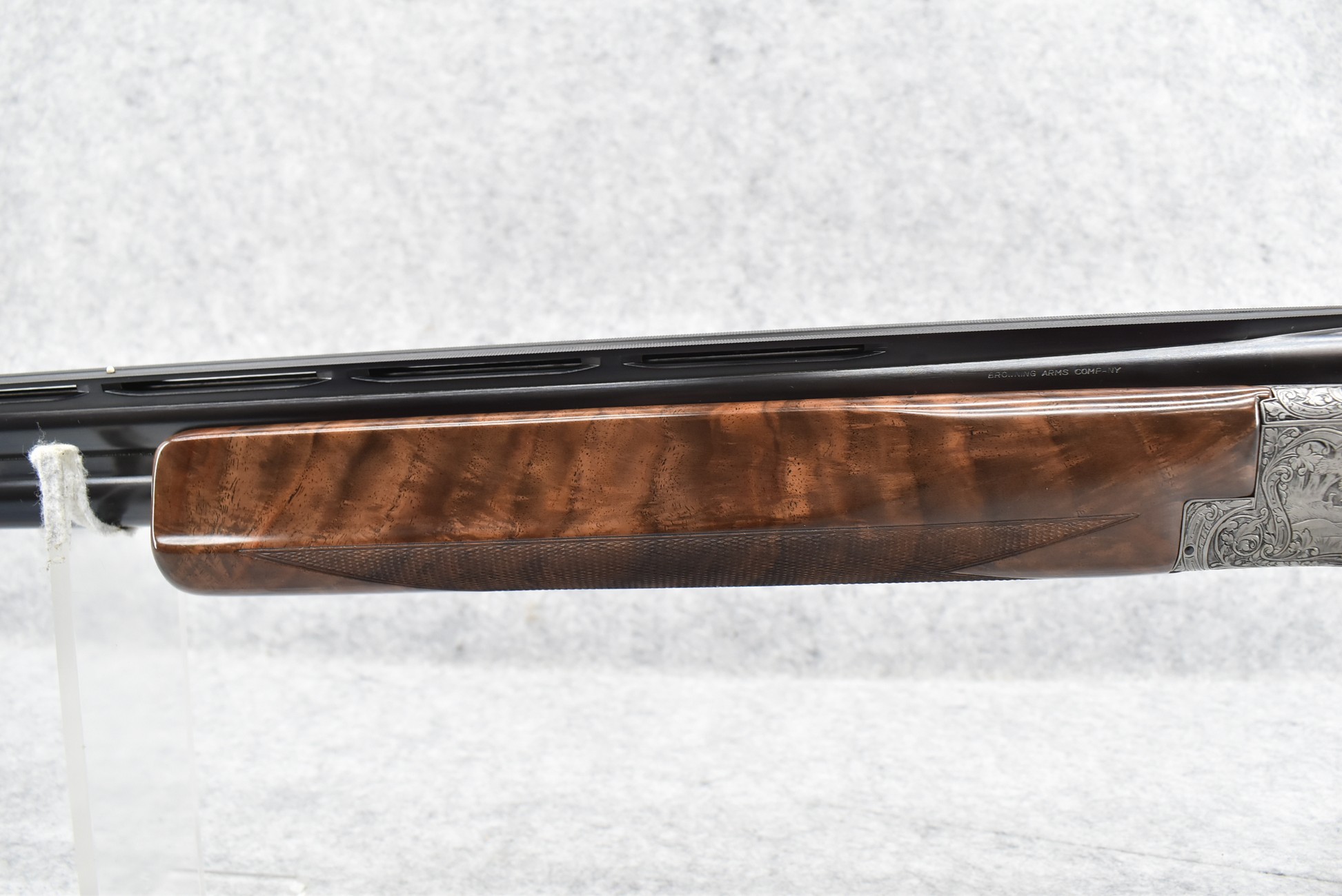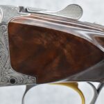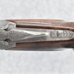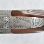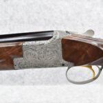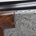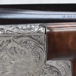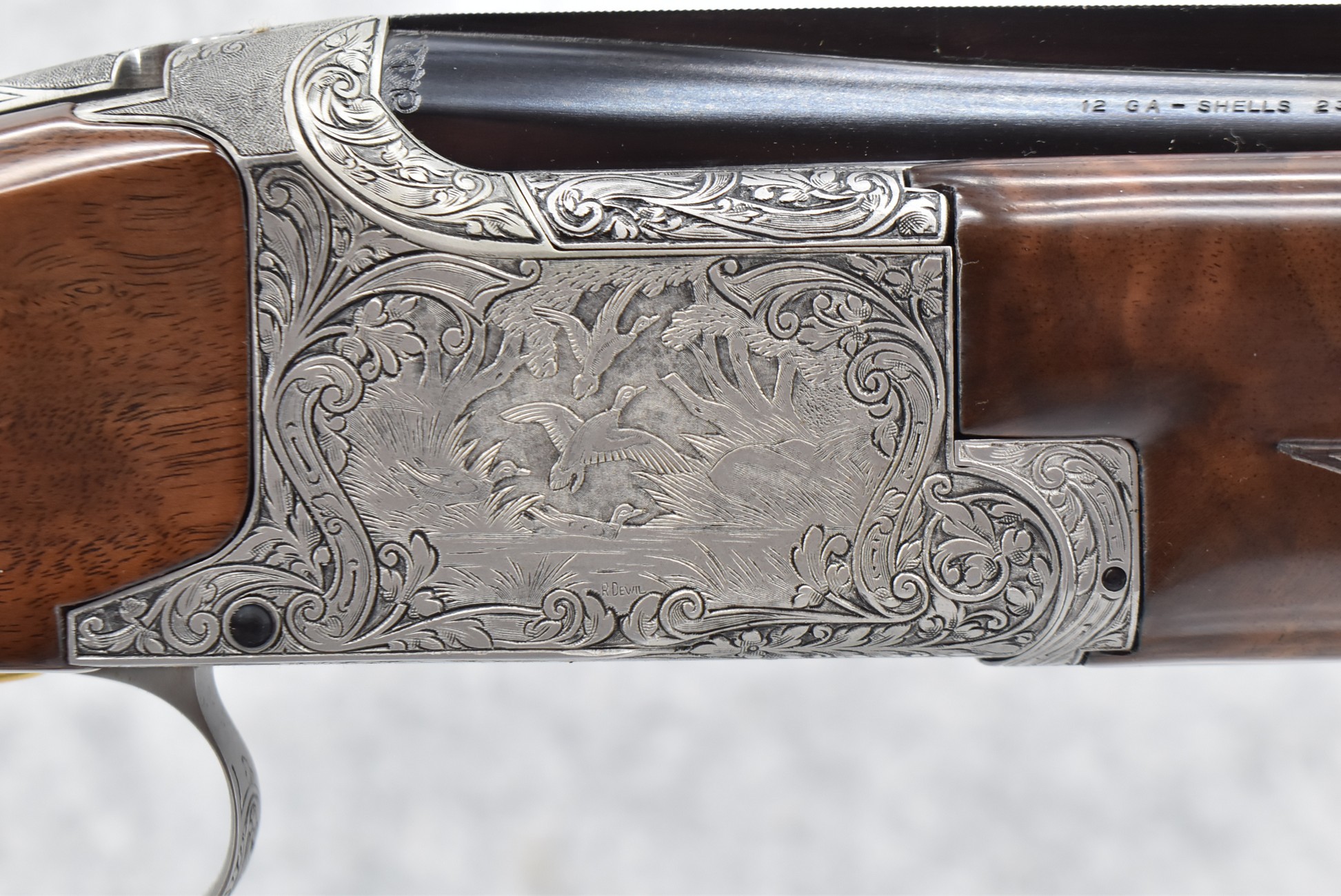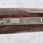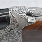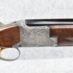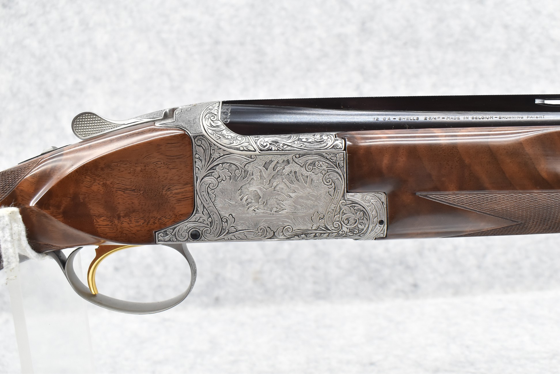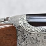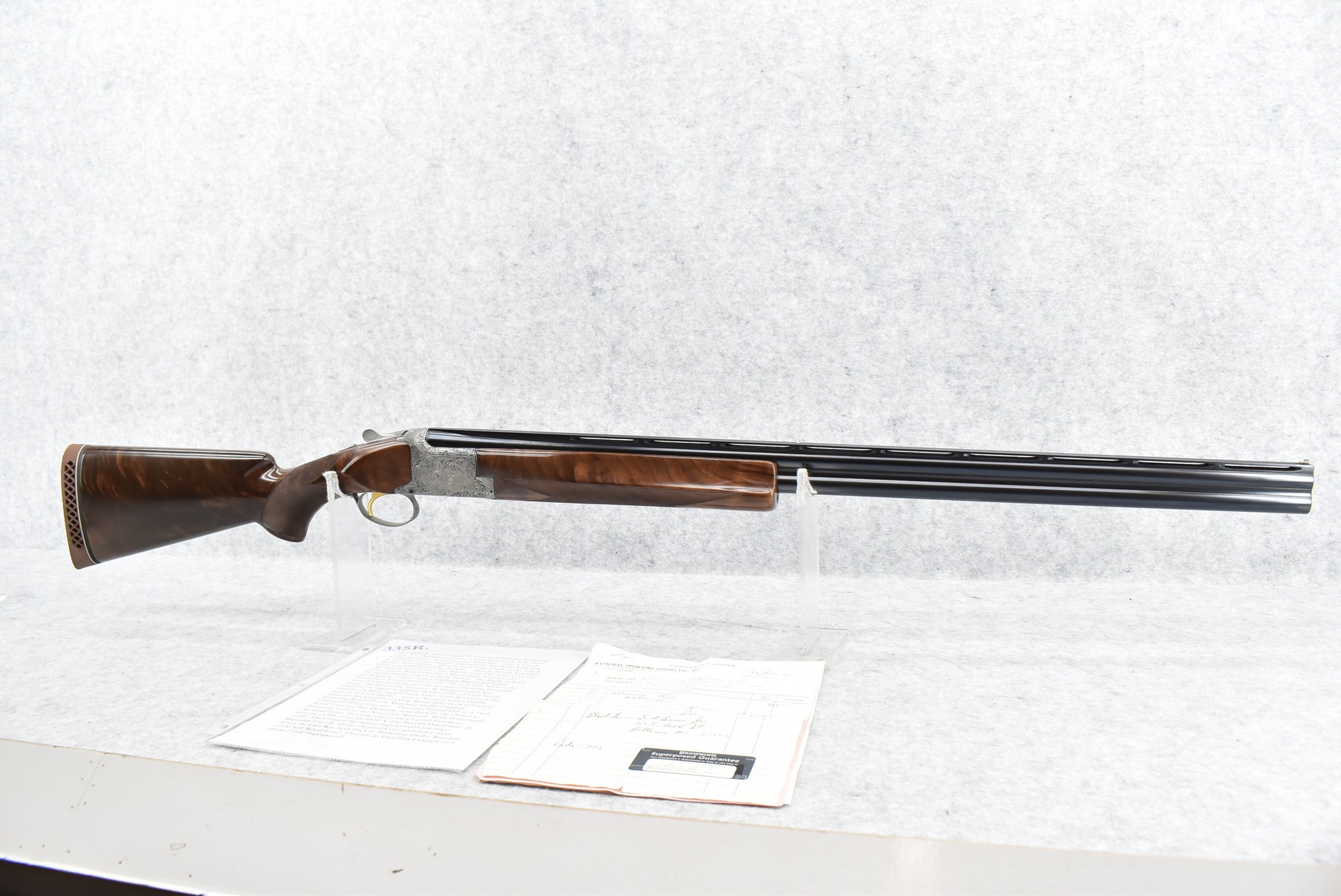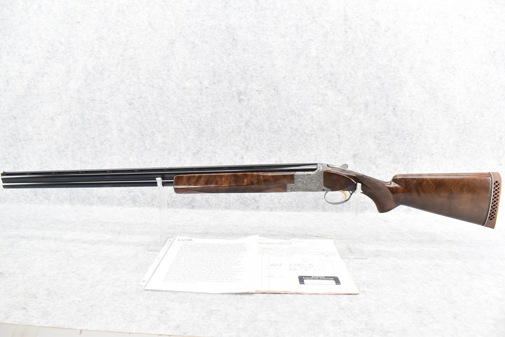 335R. Excellent! R. Dewil Signed & Engraved Belgian Browning 12ga. 2 ¾” Superposed Diana Grade Broadway Trap Over-Under Shotgun – Serial Number 6398569 – Gun is Fitted w/32” Blued Steel Barrels w/Broadway Tap Wide Vent-Rib & Dual Bead Sights – Barrels Are Choked Full on the Top & Improved Modified on the Bottom – Barrels Retain Virtually All Their Blued Finish – The Receiver on This Gun is a Coin Silver Finish Which Has Been Masterfully Engraved by Browning Master Engraver Rene Dewil. The Right Side of the Receiver is Done with a Flushing Waterfowl Scene Bordered w/Floral Pattern Scroll, The Left Side Mimics the Same Floral Scroll Broder but Around a Flushing Pheasant Scene. Bottom of the Receiver & Trigger Guard Are Engraved w/Quail & Rabbits Bordered by a Floral Scroll Pattern. DeWil’s Signed Both Sides of the Receiver at the Bottom of Each Scene! – Gun is Stocked with a Highly Figured Checkered Pistol Grip Wood Butt Stock w/Factory Browning Recoil Pad & Matching Highly Figured Checkered Wood Forearm – This Gun Started Out as a “Salt Wood” Gun but Was Promptly Sent Back by the Owner to Browning to Have the Necessary Warranty Work Performed! Accompanying This Fine Gun is the Original Purchase Receipt of This Gun for $850 & The Receipt Dated June 26, 1970! The Original Browning Superposed Guarantee Warranty Card & All the Original Correspondence from When the Gun Was Sent Back to Browning for the Warranty of the Salt Wood Issue! Overall, an Excellent Example of a Diana Grade Superposed!