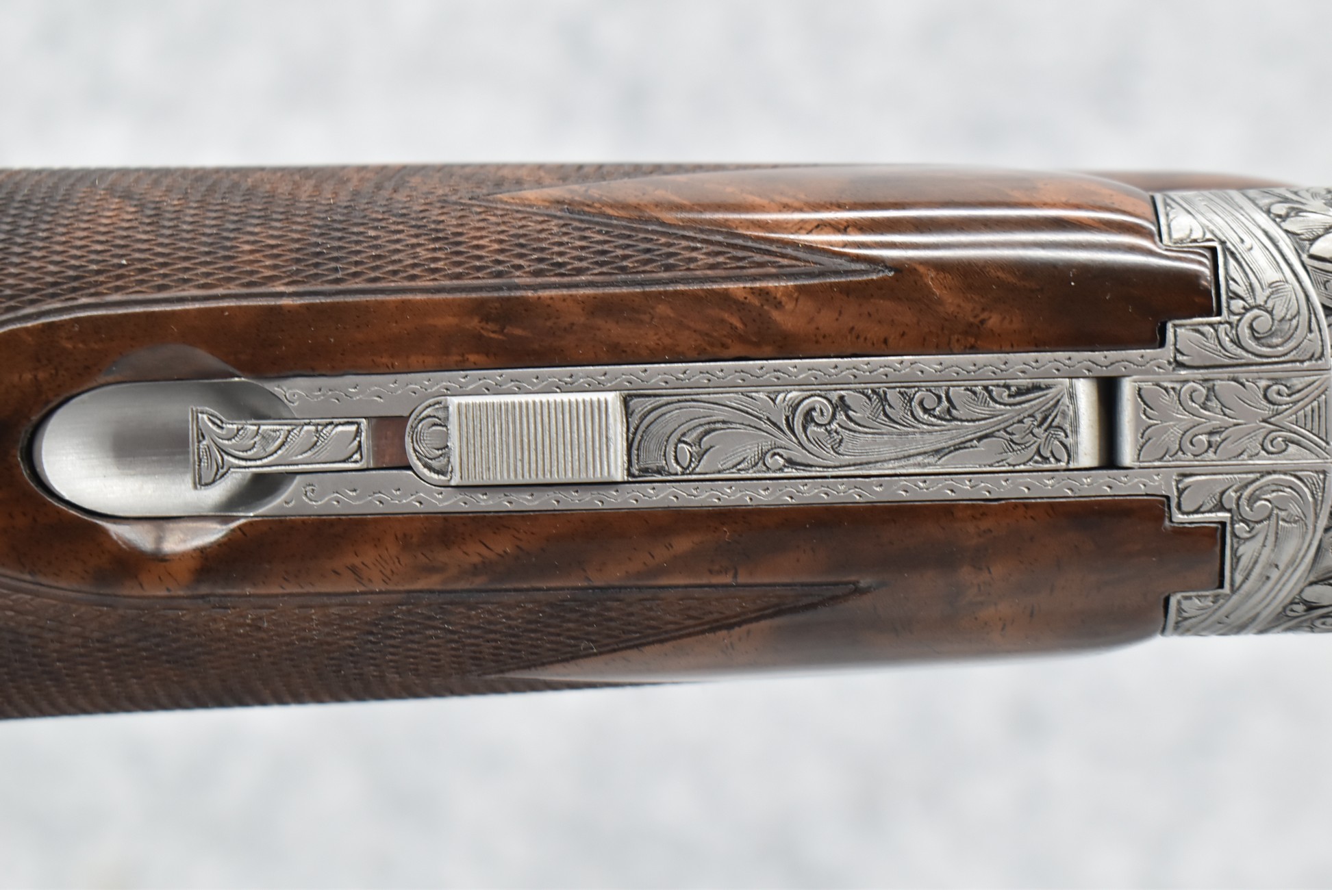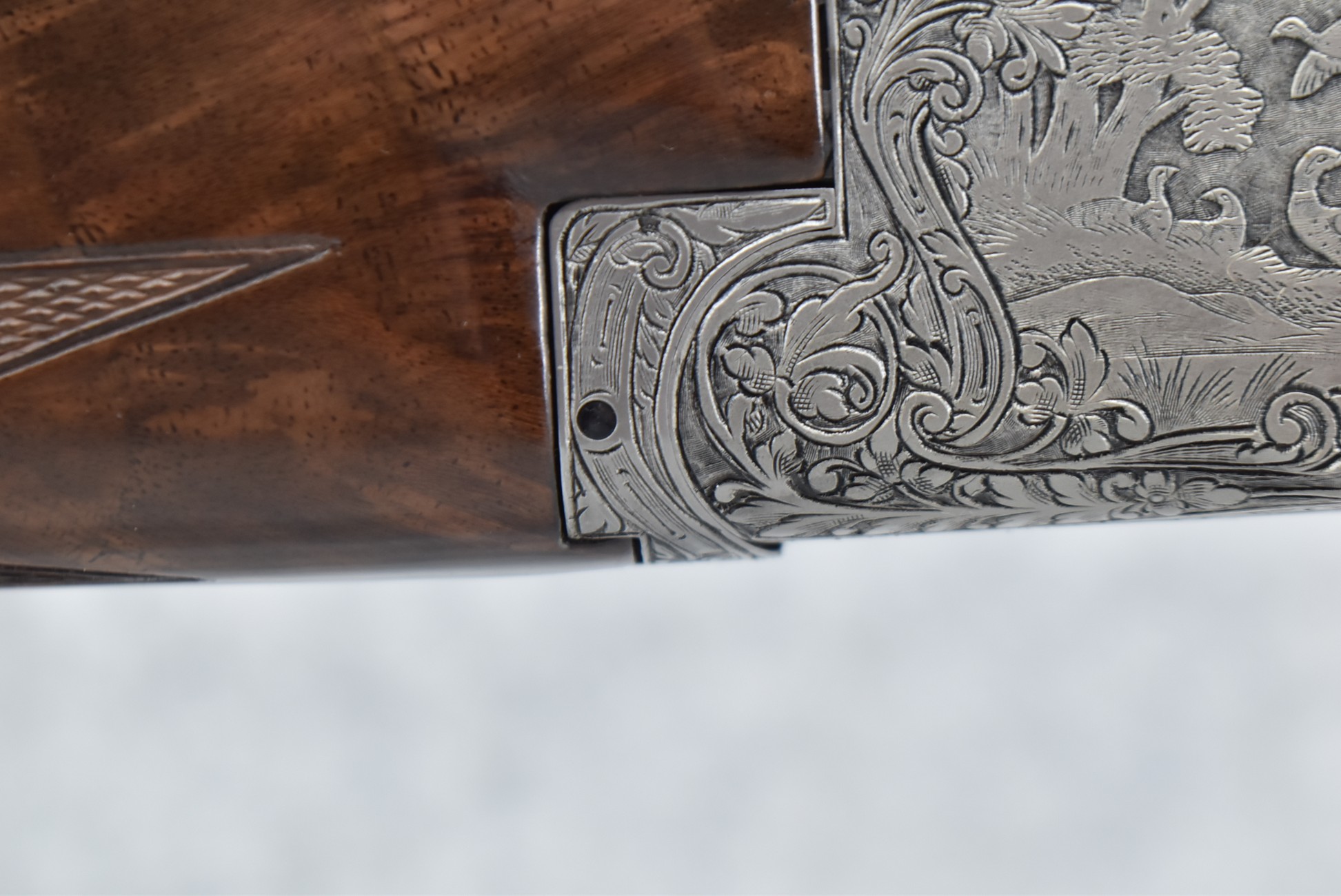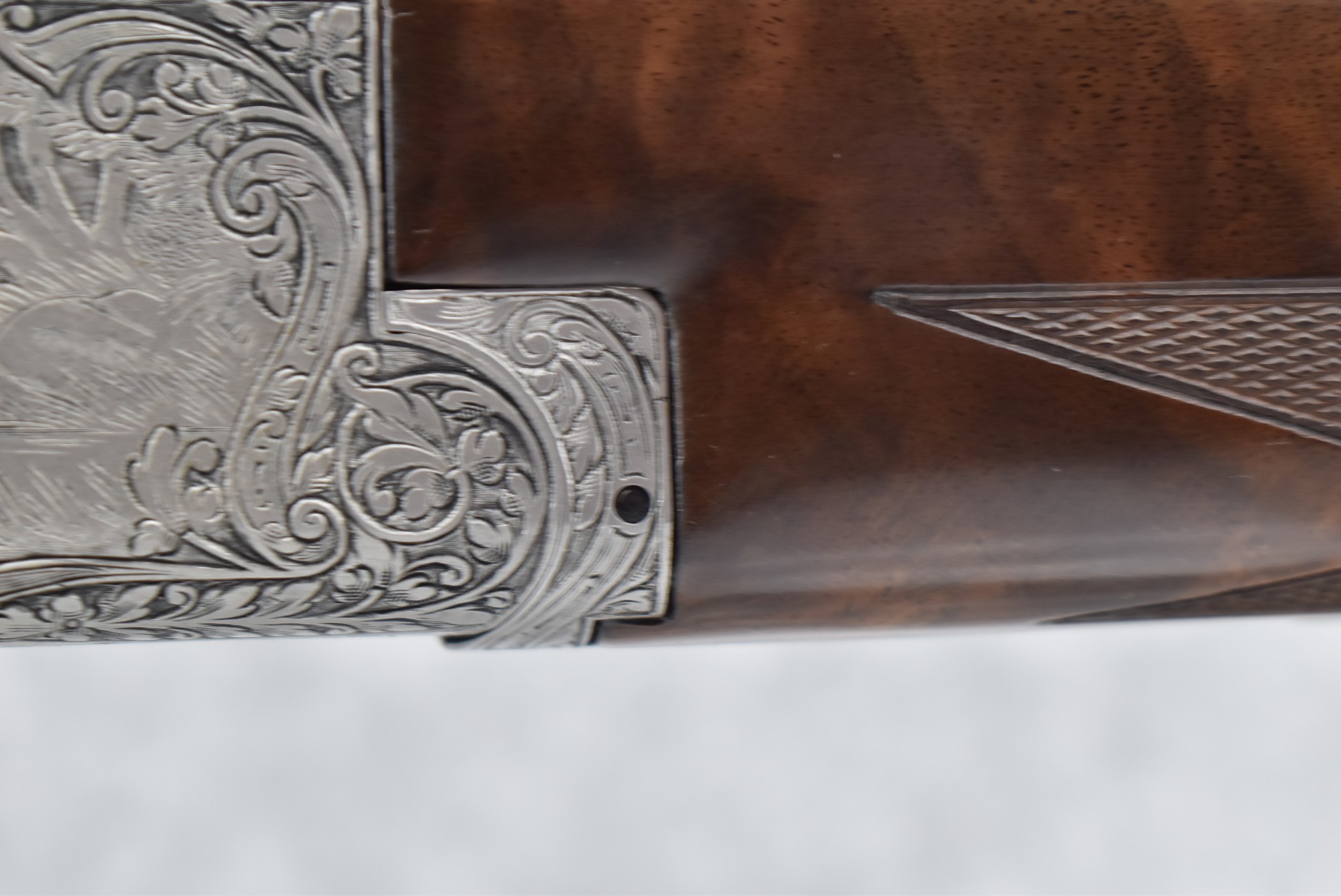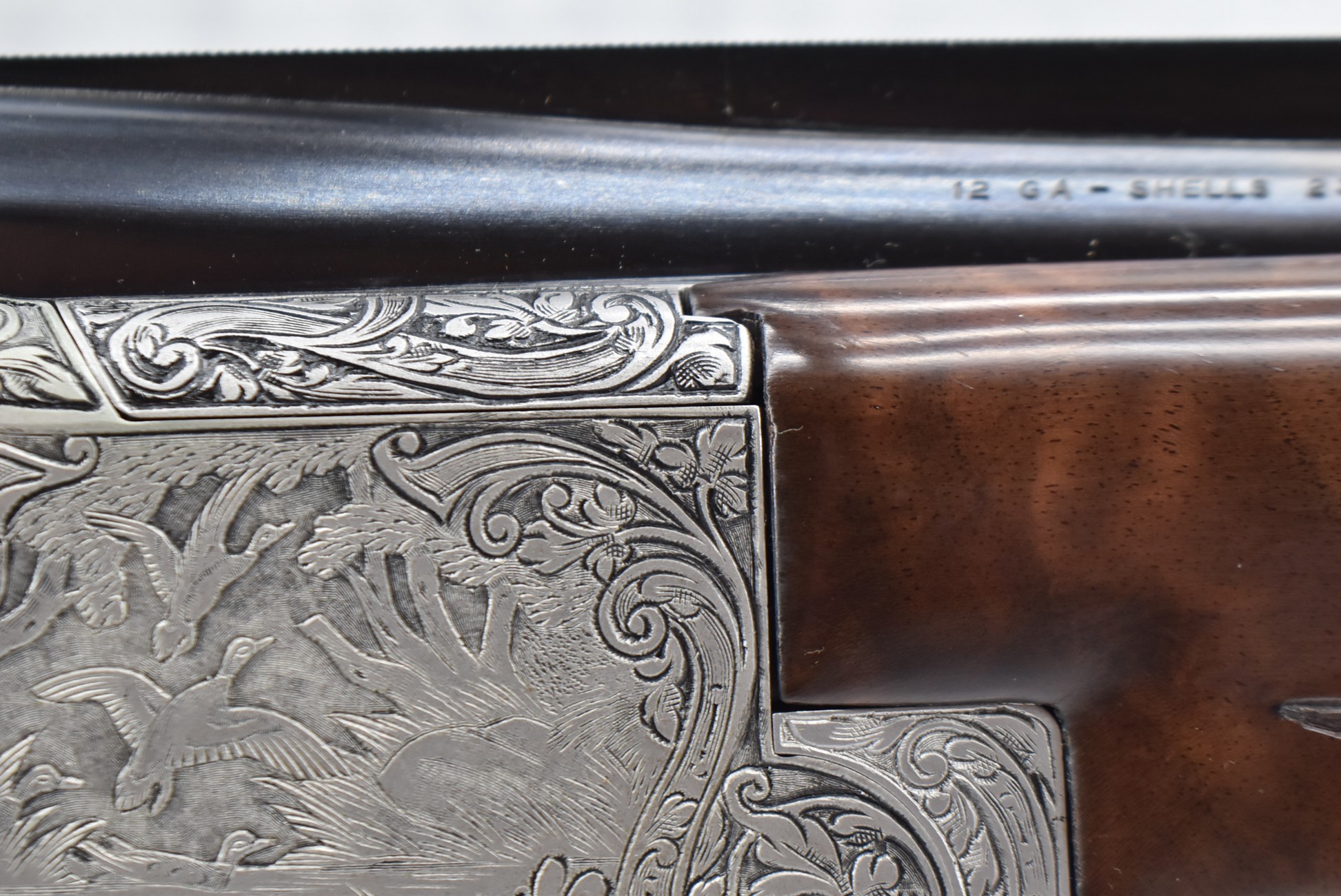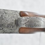 335R. Excellent! R. Dewil Signed & Engraved Belgian Browning 12ga. 2 ¾” Superposed Diana Grade Broadway Trap Over-Under Shotgun – Serial Number 6398569 – Gun is Fitted w/32” Blued Steel Barrels w/Broadway Tap Wide Vent-Rib & Dual Bead Sights – Barrels Are Choked Full on the Top & Improved Modified on the Bottom – Barrels Retain Virtually All Their Blued Finish – The Receiver on This Gun is a Coin Silver Finish Which Has Been Masterfully Engraved by Browning Master Engraver Rene Dewil. The Right Side of the Receiver is Done with a Flushing Waterfowl Scene Bordered w/Floral Pattern Scroll, The Left Side Mimics the Same Floral Scroll Broder but Around a Flushing Pheasant Scene. Bottom of the Receiver & Trigger Guard Are Engraved w/Quail & Rabbits Bordered by a Floral Scroll Pattern. DeWil’s Signed Both Sides of the Receiver at the Bottom of Each Scene! – Gun is Stocked with a Highly Figured Checkered Pistol Grip Wood Butt Stock w/Factory Browning Recoil Pad & Matching Highly Figured Checkered Wood Forearm – This Gun Started Out as a “Salt Wood” Gun but Was Promptly Sent Back by the Owner to Browning to Have the Necessary Warranty Work Performed! Accompanying This Fine Gun is the Original Purchase Receipt of This Gun for $850 & The Receipt Dated June 26, 1970! The Original Browning Superposed Guarantee Warranty Card & All the Original Correspondence from When the Gun Was Sent Back to Browning for the Warranty of the Salt Wood Issue! Overall, an Excellent Example of a Diana Grade Superposed!