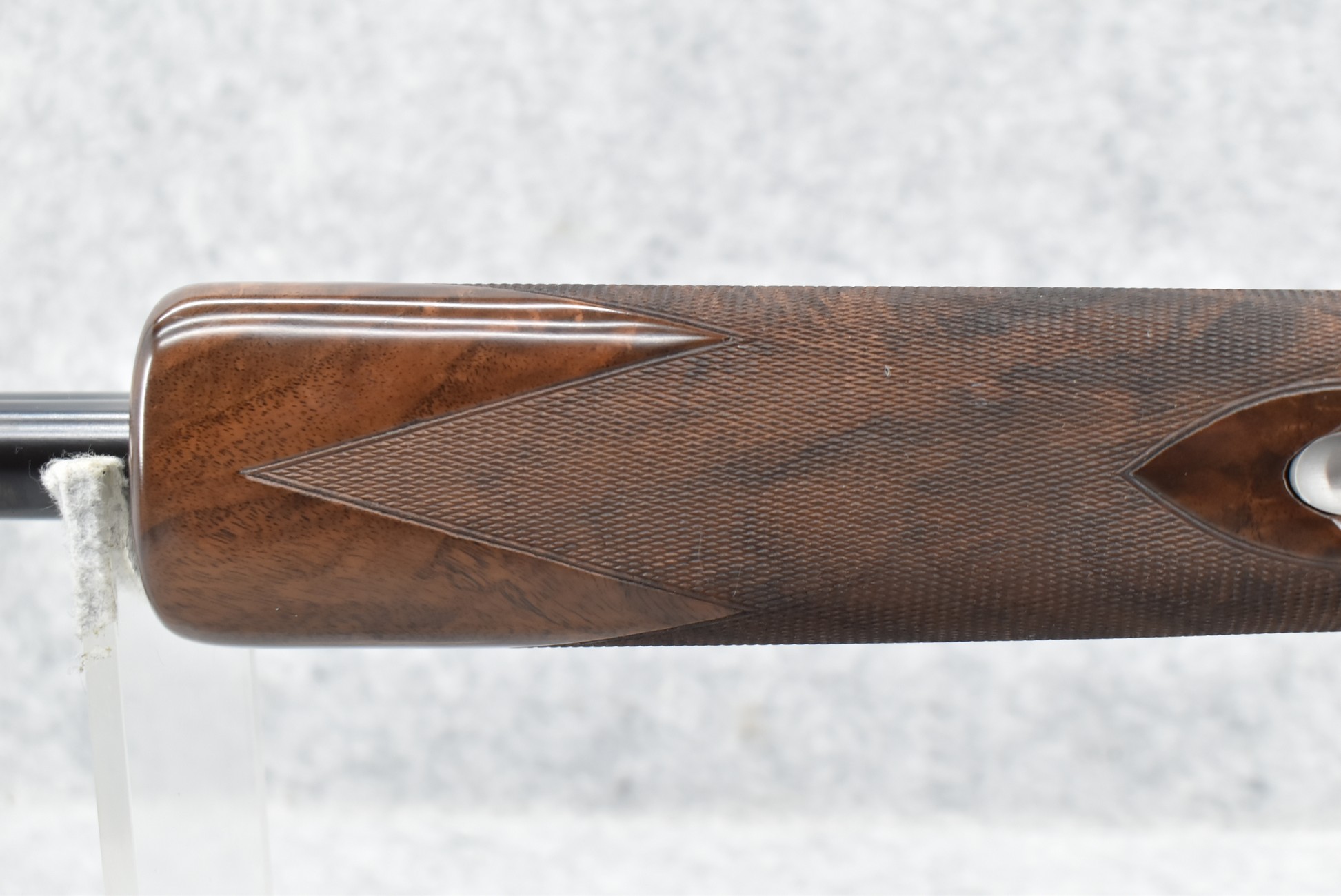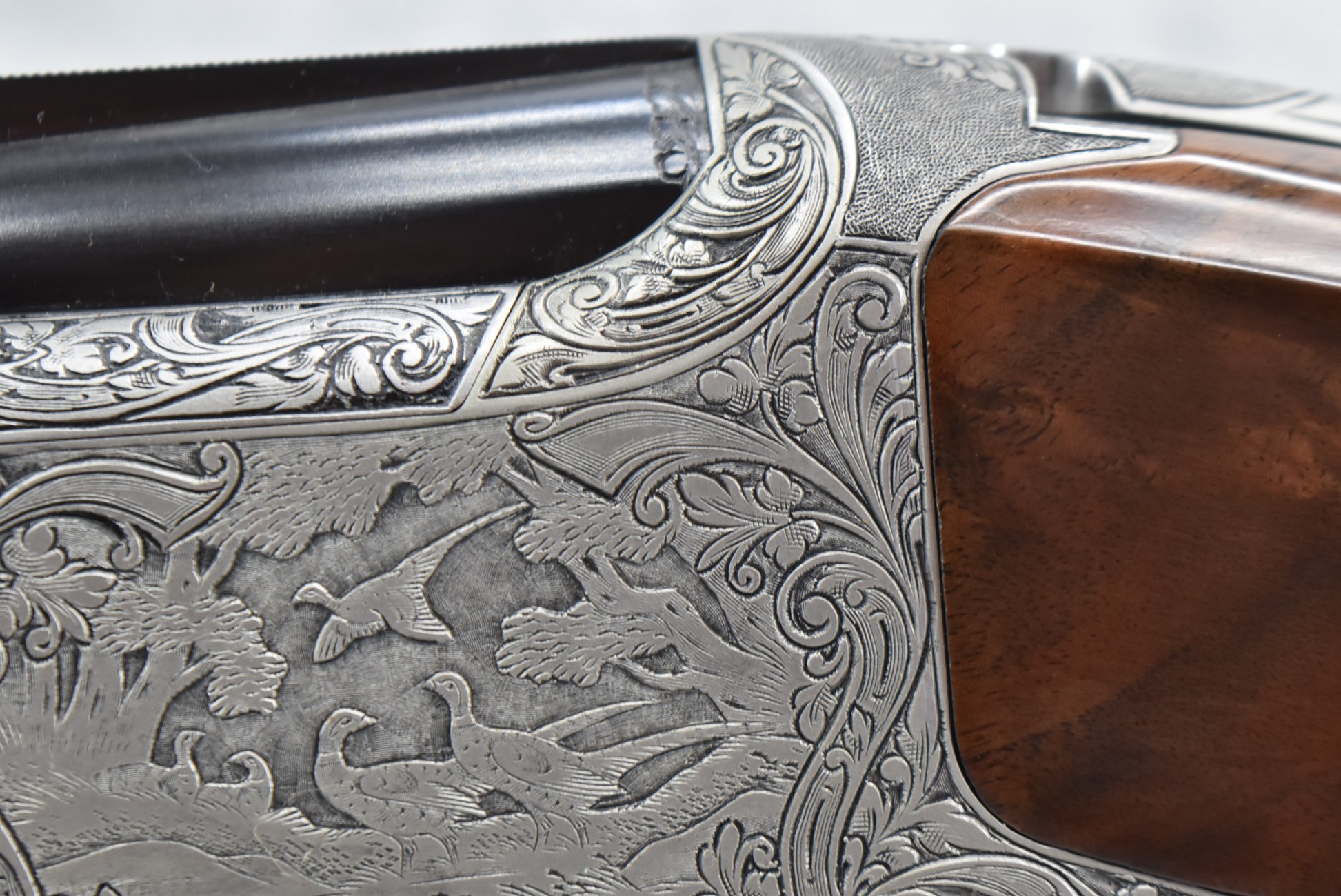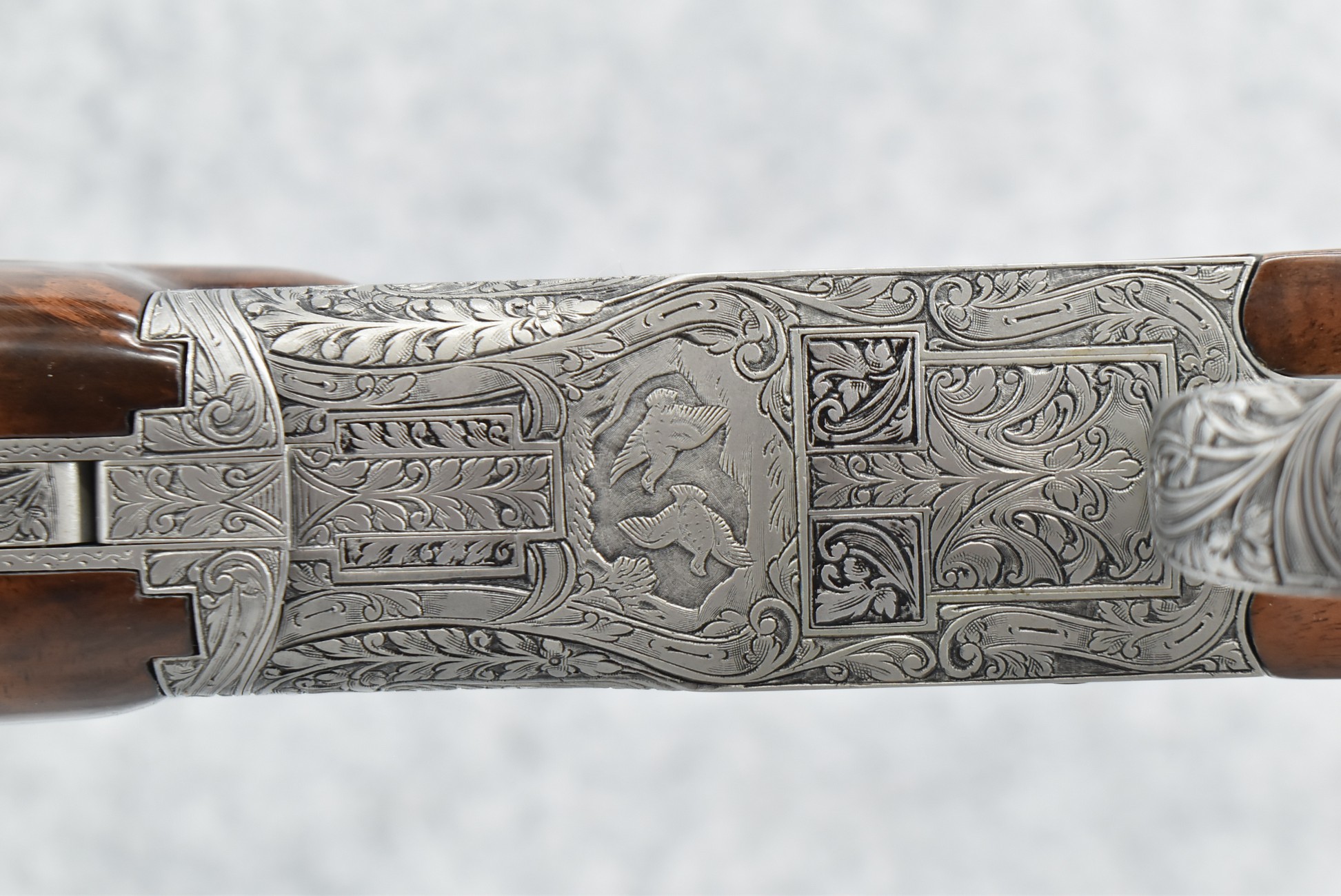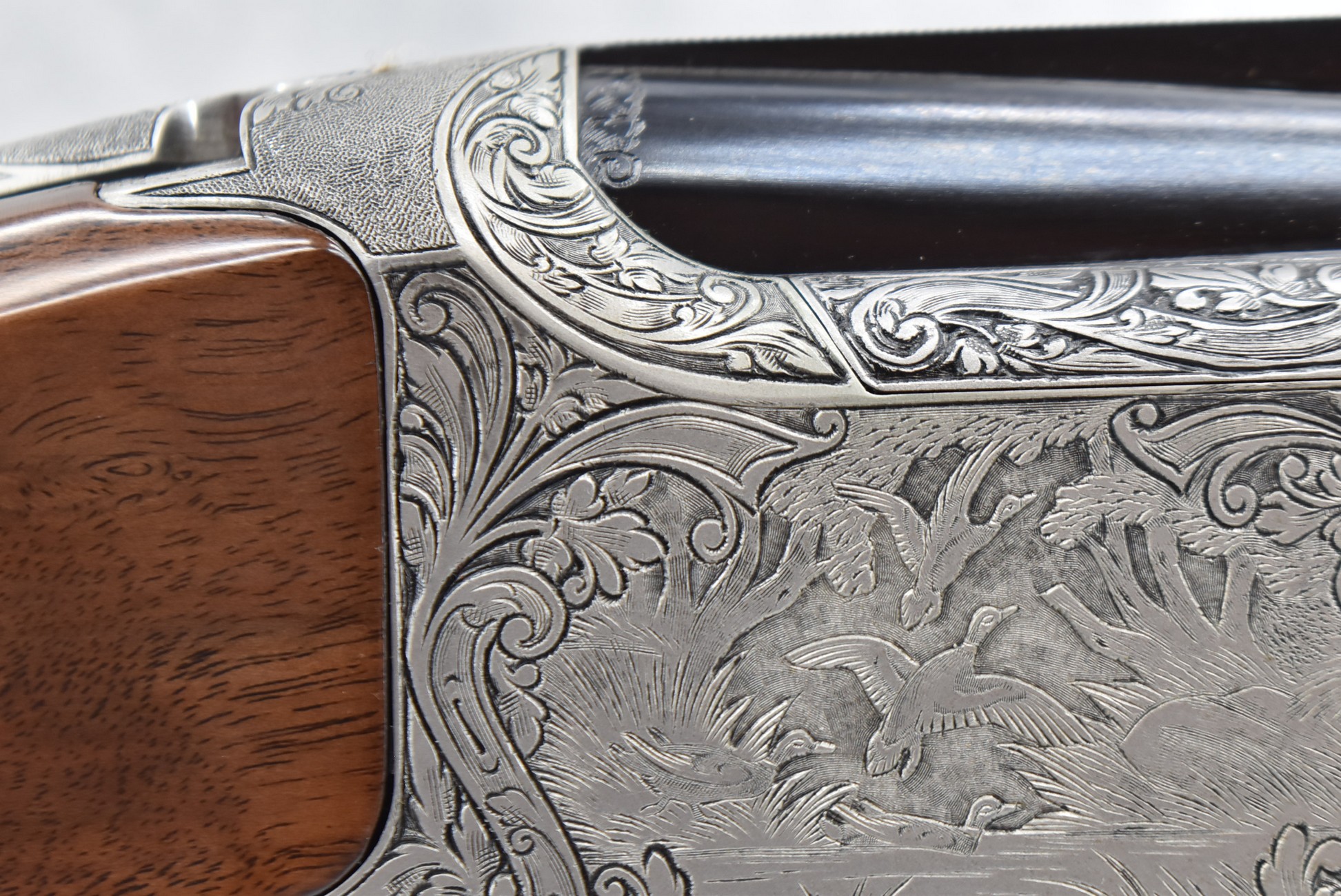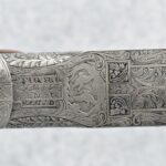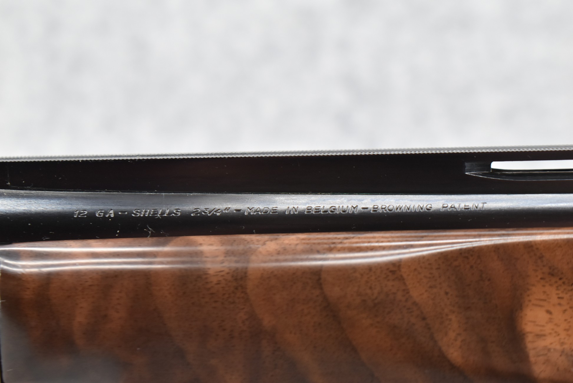 335R. Excellent! R. Dewil Signed & Engraved Belgian Browning 12ga. 2 ¾” Superposed Diana Grade Broadway Trap Over-Under Shotgun – Serial Number 6398569 – Gun is Fitted w/32” Blued Steel Barrels w/Broadway Tap Wide Vent-Rib & Dual Bead Sights – Barrels Are Choked Full on the Top & Improved Modified on the Bottom – Barrels Retain Virtually All Their Blued Finish – The Receiver on This Gun is a Coin Silver Finish Which Has Been Masterfully Engraved by Browning Master Engraver Rene Dewil. The Right Side of the Receiver is Done with a Flushing Waterfowl Scene Bordered w/Floral Pattern Scroll, The Left Side Mimics the Same Floral Scroll Broder but Around a Flushing Pheasant Scene. Bottom of the Receiver & Trigger Guard Are Engraved w/Quail & Rabbits Bordered by a Floral Scroll Pattern. DeWil’s Signed Both Sides of the Receiver at the Bottom of Each Scene! – Gun is Stocked with a Highly Figured Checkered Pistol Grip Wood Butt Stock w/Factory Browning Recoil Pad & Matching Highly Figured Checkered Wood Forearm – This Gun Started Out as a “Salt Wood” Gun but Was Promptly Sent Back by the Owner to Browning to Have the Necessary Warranty Work Performed! Accompanying This Fine Gun is the Original Purchase Receipt of This Gun for $850 & The Receipt Dated June 26, 1970! The Original Browning Superposed Guarantee Warranty Card & All the Original Correspondence from When the Gun Was Sent Back to Browning for the Warranty of the Salt Wood Issue! Overall, an Excellent Example of a Diana Grade Superposed!