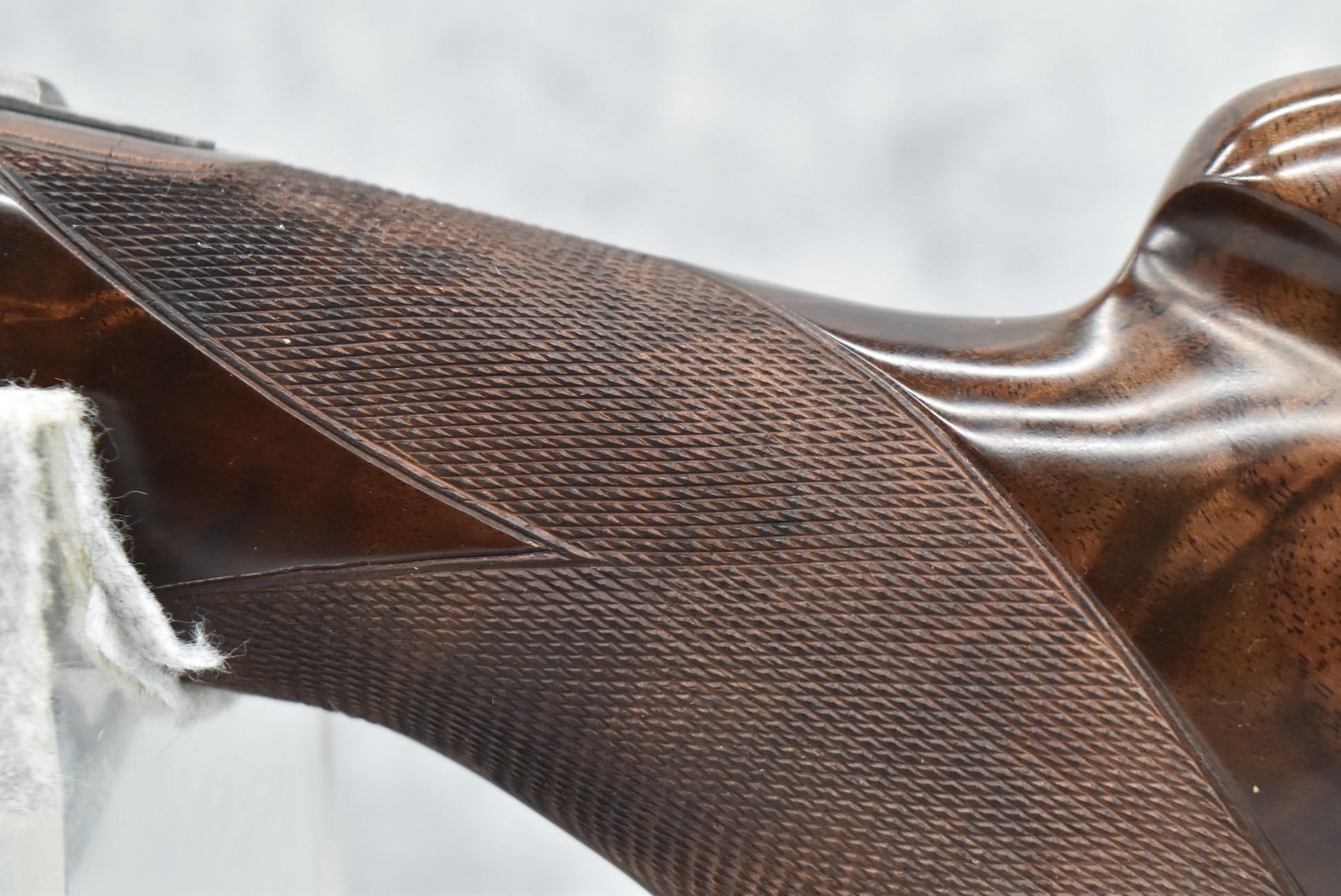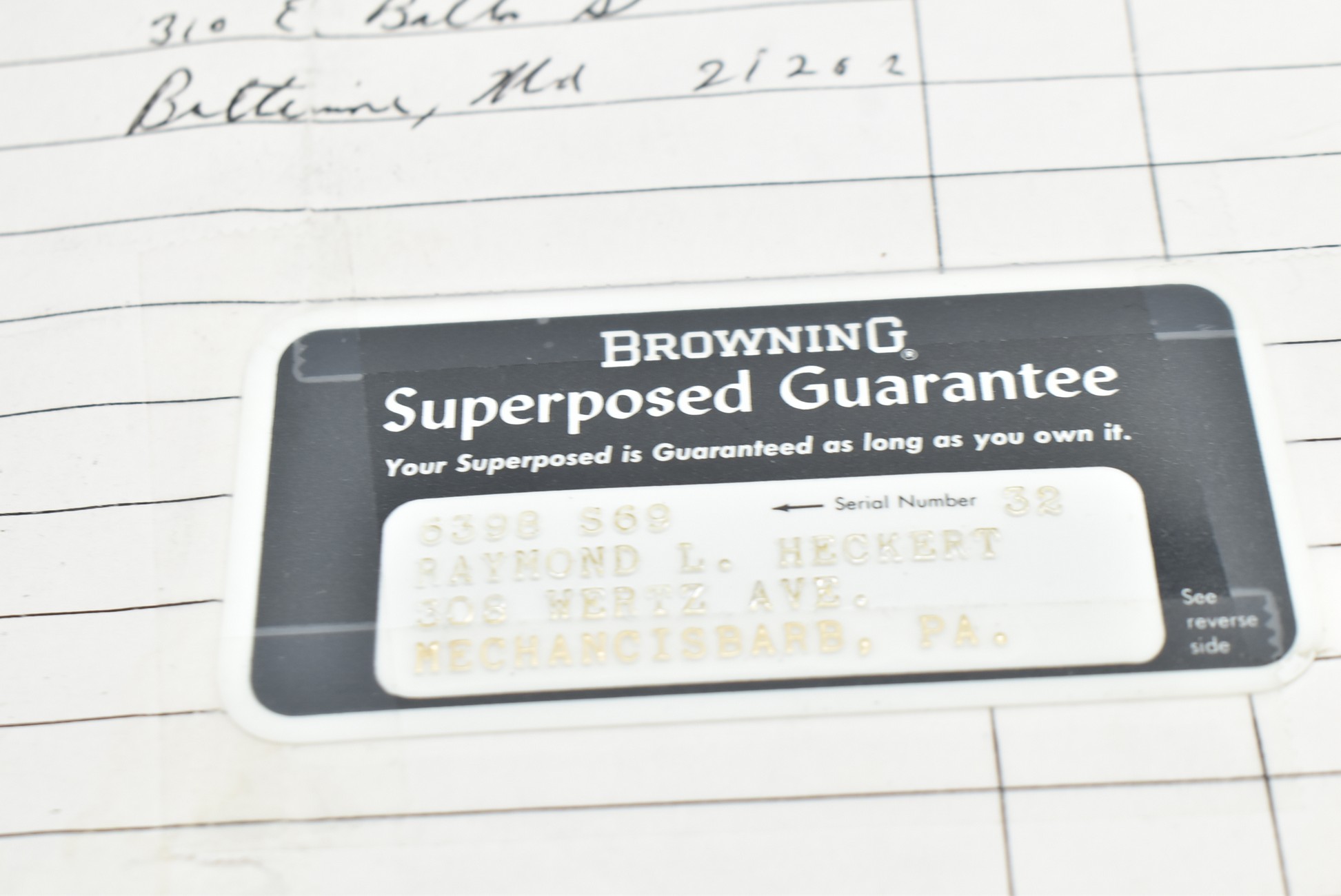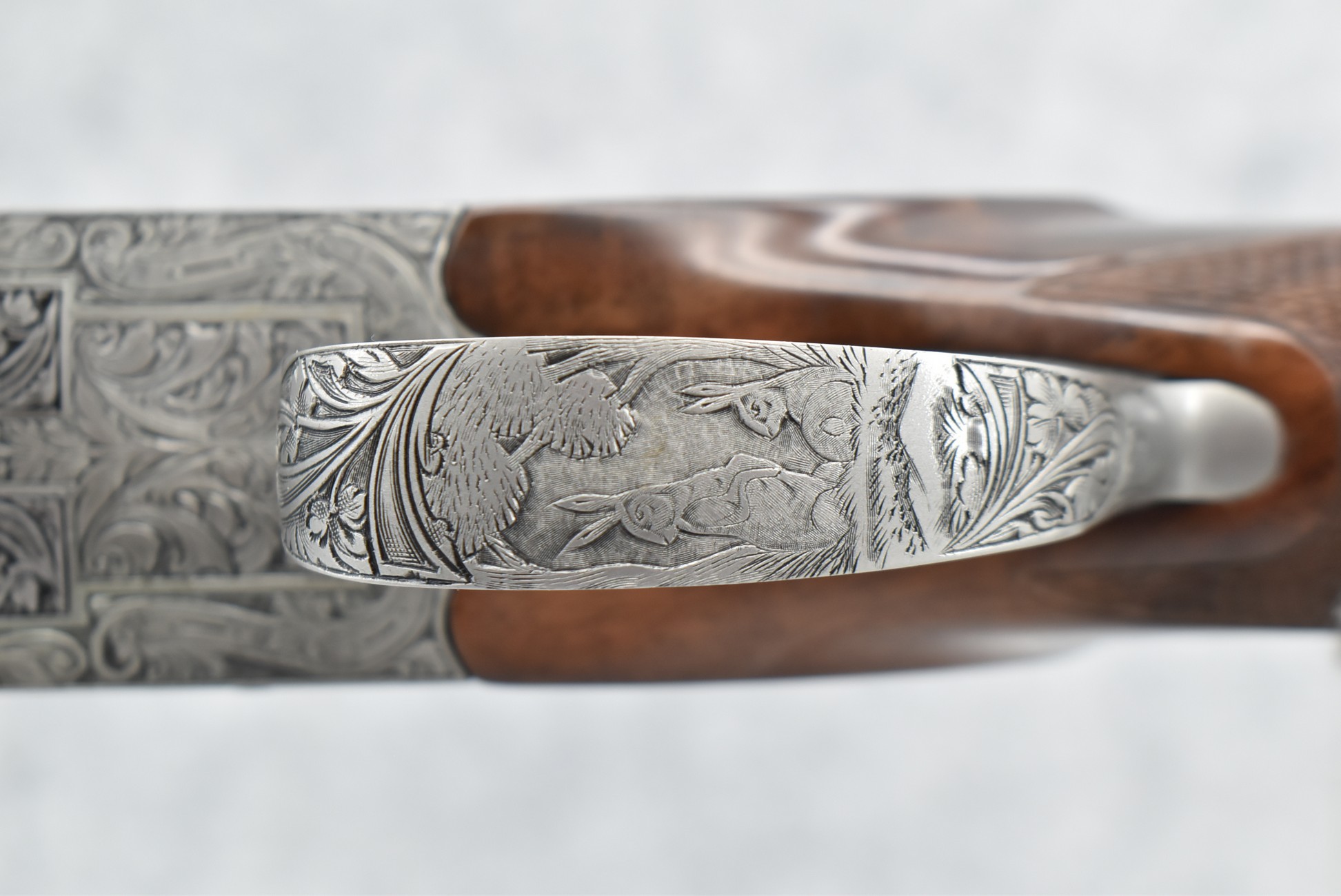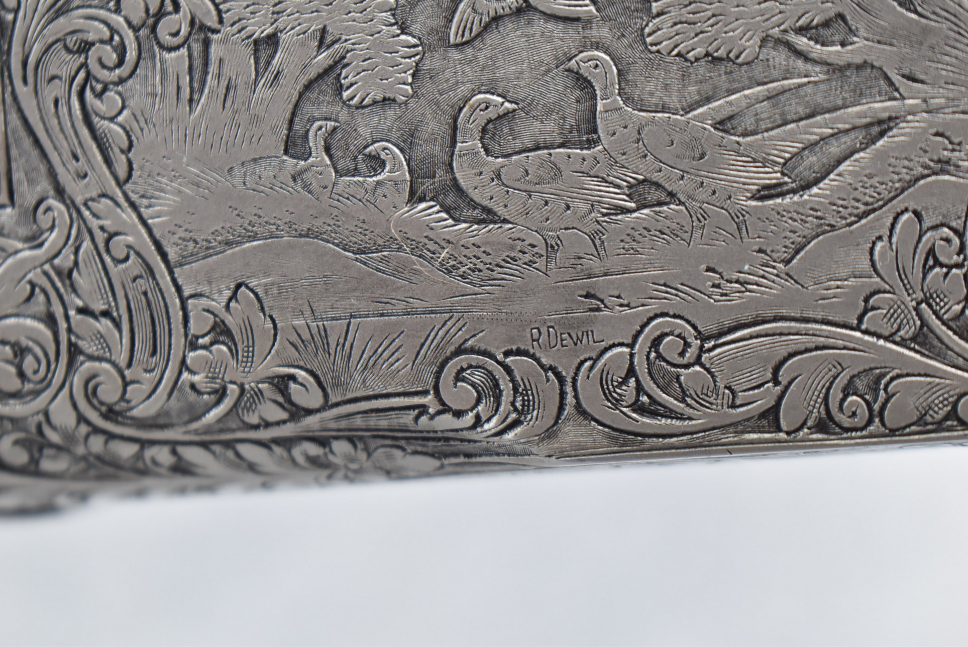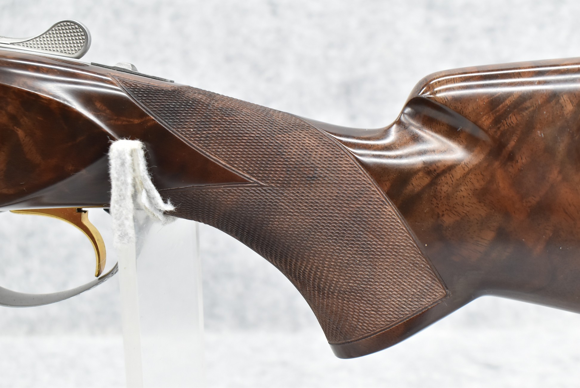 335R. Excellent! R. Dewil Signed & Engraved Belgian Browning 12ga. 2 ¾” Superposed Diana Grade Broadway Trap Over-Under Shotgun – Serial Number 6398569 – Gun is Fitted w/32” Blued Steel Barrels w/Broadway Tap Wide Vent-Rib & Dual Bead Sights – Barrels Are Choked Full on the Top & Improved Modified on the Bottom – Barrels Retain Virtually All Their Blued Finish – The Receiver on This Gun is a Coin Silver Finish Which Has Been Masterfully Engraved by Browning Master Engraver Rene Dewil. The Right Side of the Receiver is Done with a Flushing Waterfowl Scene Bordered w/Floral Pattern Scroll, The Left Side Mimics the Same Floral Scroll Broder but Around a Flushing Pheasant Scene. Bottom of the Receiver & Trigger Guard Are Engraved w/Quail & Rabbits Bordered by a Floral Scroll Pattern. DeWil’s Signed Both Sides of the Receiver at the Bottom of Each Scene! – Gun is Stocked with a Highly Figured Checkered Pistol Grip Wood Butt Stock w/Factory Browning Recoil Pad & Matching Highly Figured Checkered Wood Forearm – This Gun Started Out as a “Salt Wood” Gun but Was Promptly Sent Back by the Owner to Browning to Have the Necessary Warranty Work Performed! Accompanying This Fine Gun is the Original Purchase Receipt of This Gun for $850 & The Receipt Dated June 26, 1970! The Original Browning Superposed Guarantee Warranty Card & All the Original Correspondence from When the Gun Was Sent Back to Browning for the Warranty of the Salt Wood Issue! Overall, an Excellent Example of a Diana Grade Superposed!