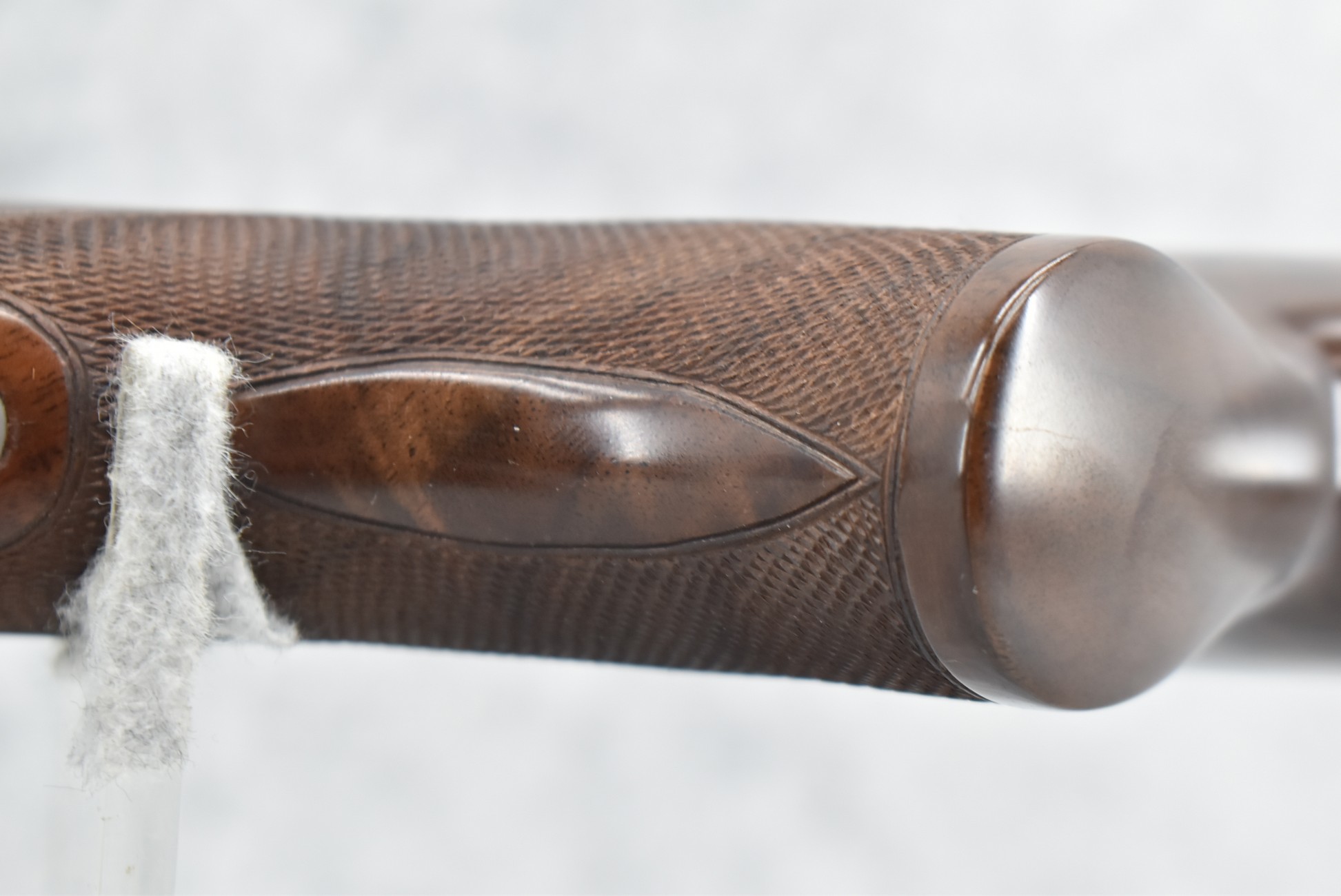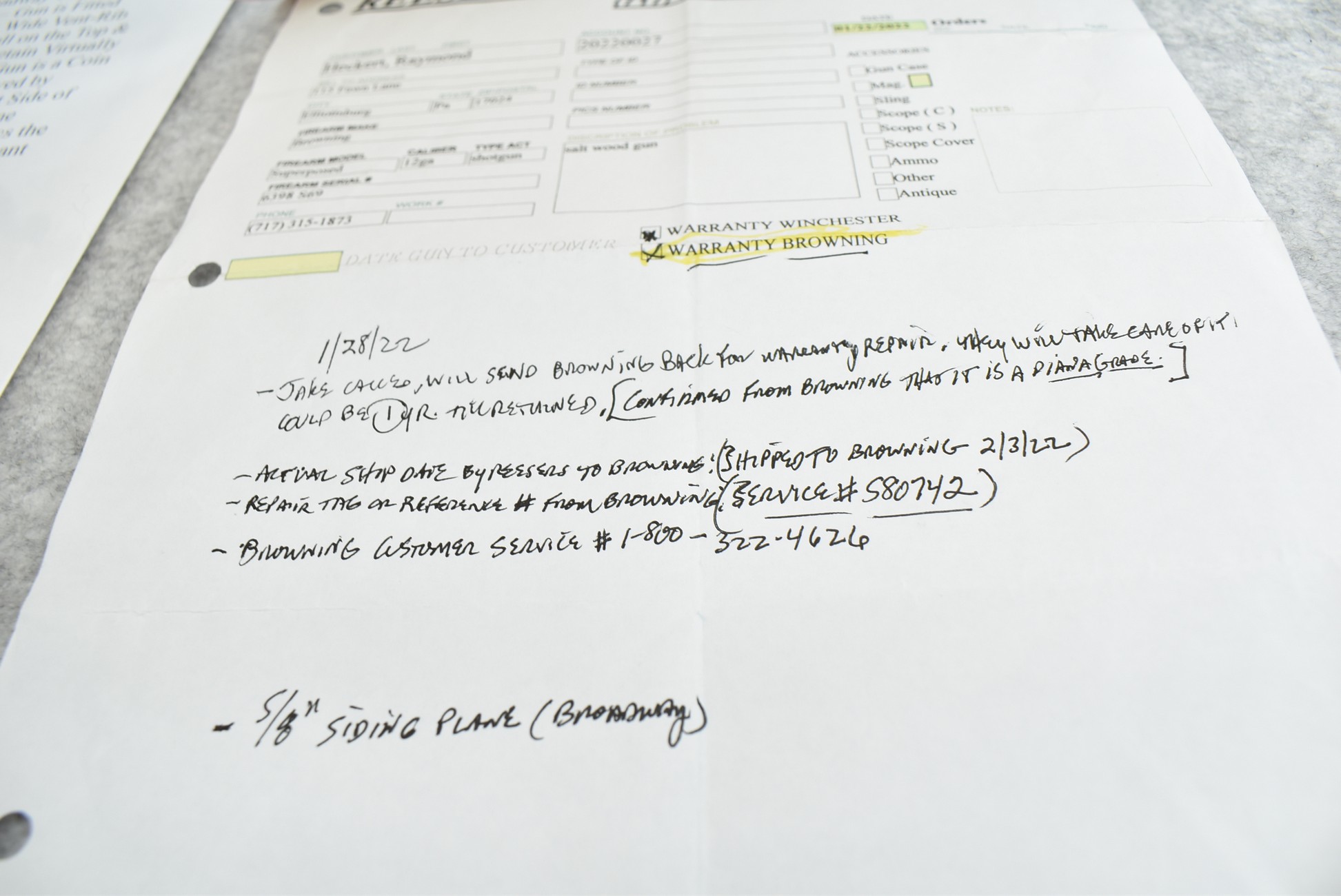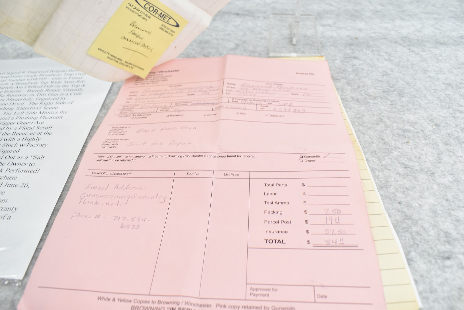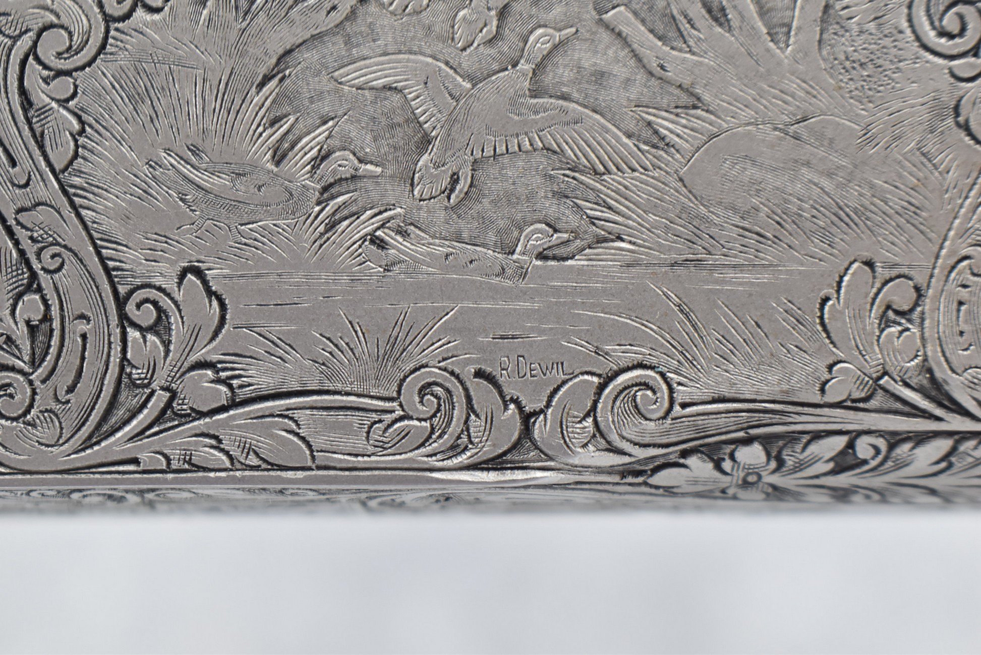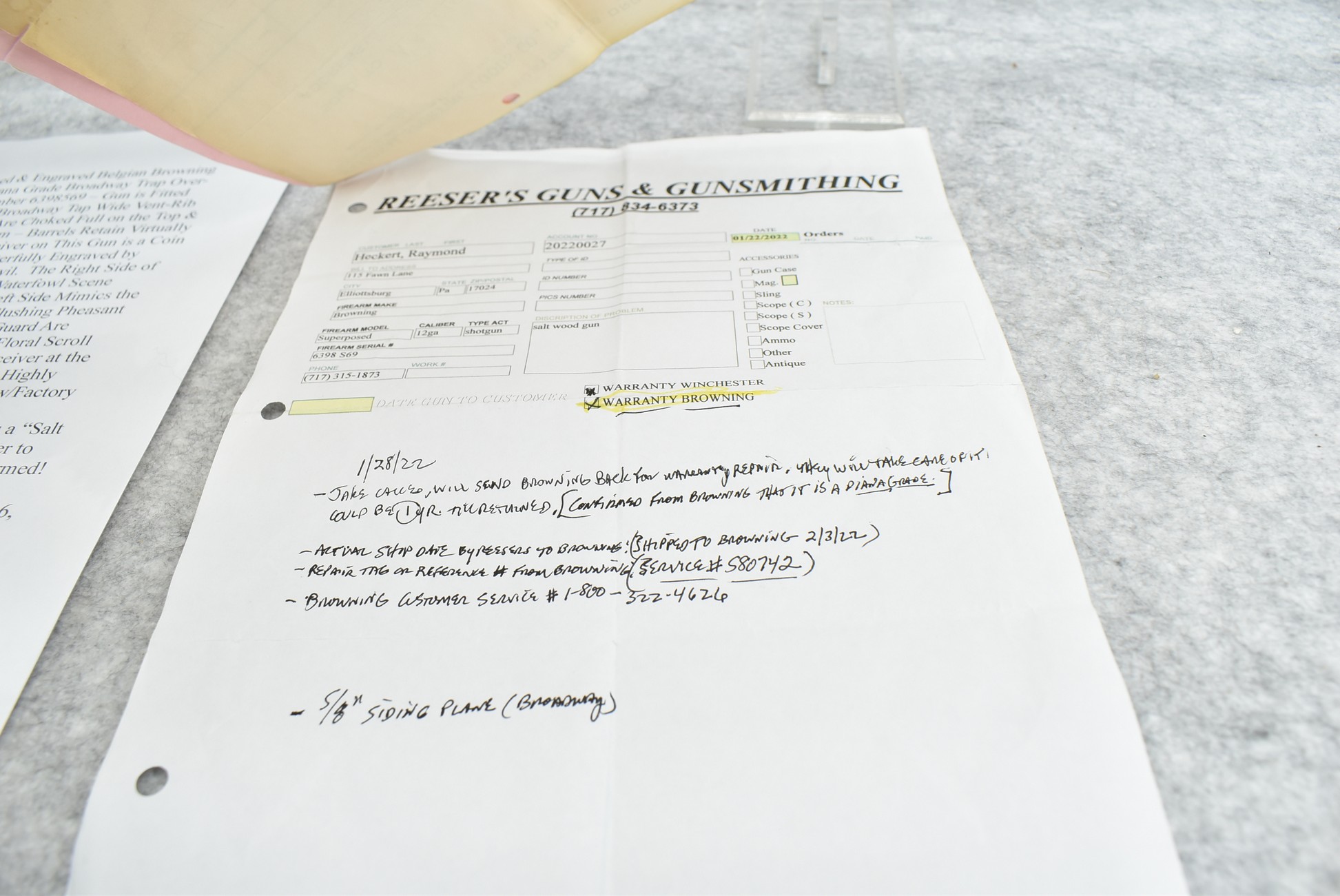 335R. Excellent! R. Dewil Signed & Engraved Belgian Browning 12ga. 2 ¾” Superposed Diana Grade Broadway Trap Over-Under Shotgun – Serial Number 6398569 – Gun is Fitted w/32” Blued Steel Barrels w/Broadway Tap Wide Vent-Rib & Dual Bead Sights – Barrels Are Choked Full on the Top & Improved Modified on the Bottom – Barrels Retain Virtually All Their Blued Finish – The Receiver on This Gun is a Coin Silver Finish Which Has Been Masterfully Engraved by Browning Master Engraver Rene Dewil. The Right Side of the Receiver is Done with a Flushing Waterfowl Scene Bordered w/Floral Pattern Scroll, The Left Side Mimics the Same Floral Scroll Broder but Around a Flushing Pheasant Scene. Bottom of the Receiver & Trigger Guard Are Engraved w/Quail & Rabbits Bordered by a Floral Scroll Pattern. DeWil’s Signed Both Sides of the Receiver at the Bottom of Each Scene! – Gun is Stocked with a Highly Figured Checkered Pistol Grip Wood Butt Stock w/Factory Browning Recoil Pad & Matching Highly Figured Checkered Wood Forearm – This Gun Started Out as a “Salt Wood” Gun but Was Promptly Sent Back by the Owner to Browning to Have the Necessary Warranty Work Performed! Accompanying This Fine Gun is the Original Purchase Receipt of This Gun for $850 & The Receipt Dated June 26, 1970! The Original Browning Superposed Guarantee Warranty Card & All the Original Correspondence from When the Gun Was Sent Back to Browning for the Warranty of the Salt Wood Issue! Overall, an Excellent Example of a Diana Grade Superposed!