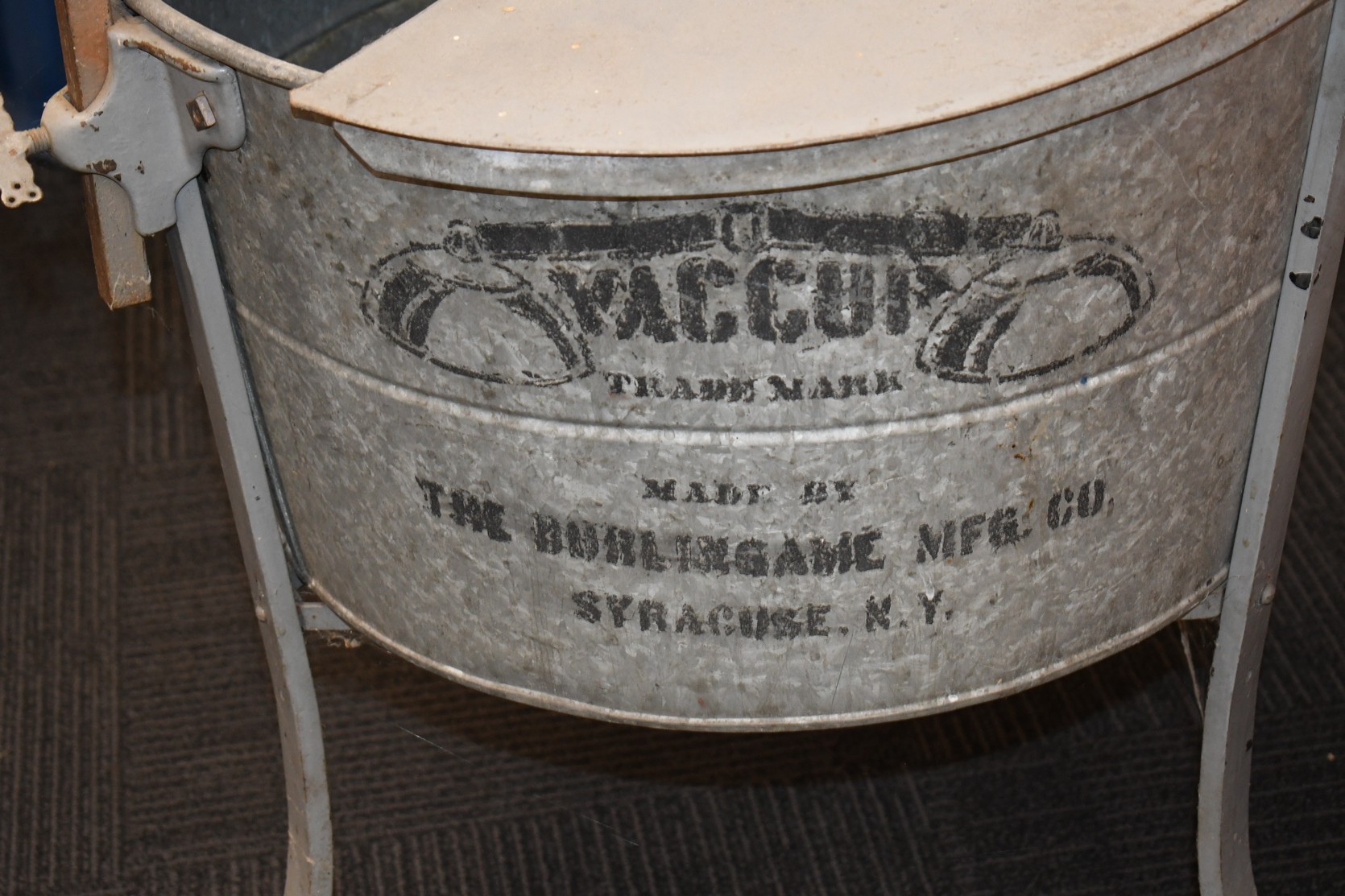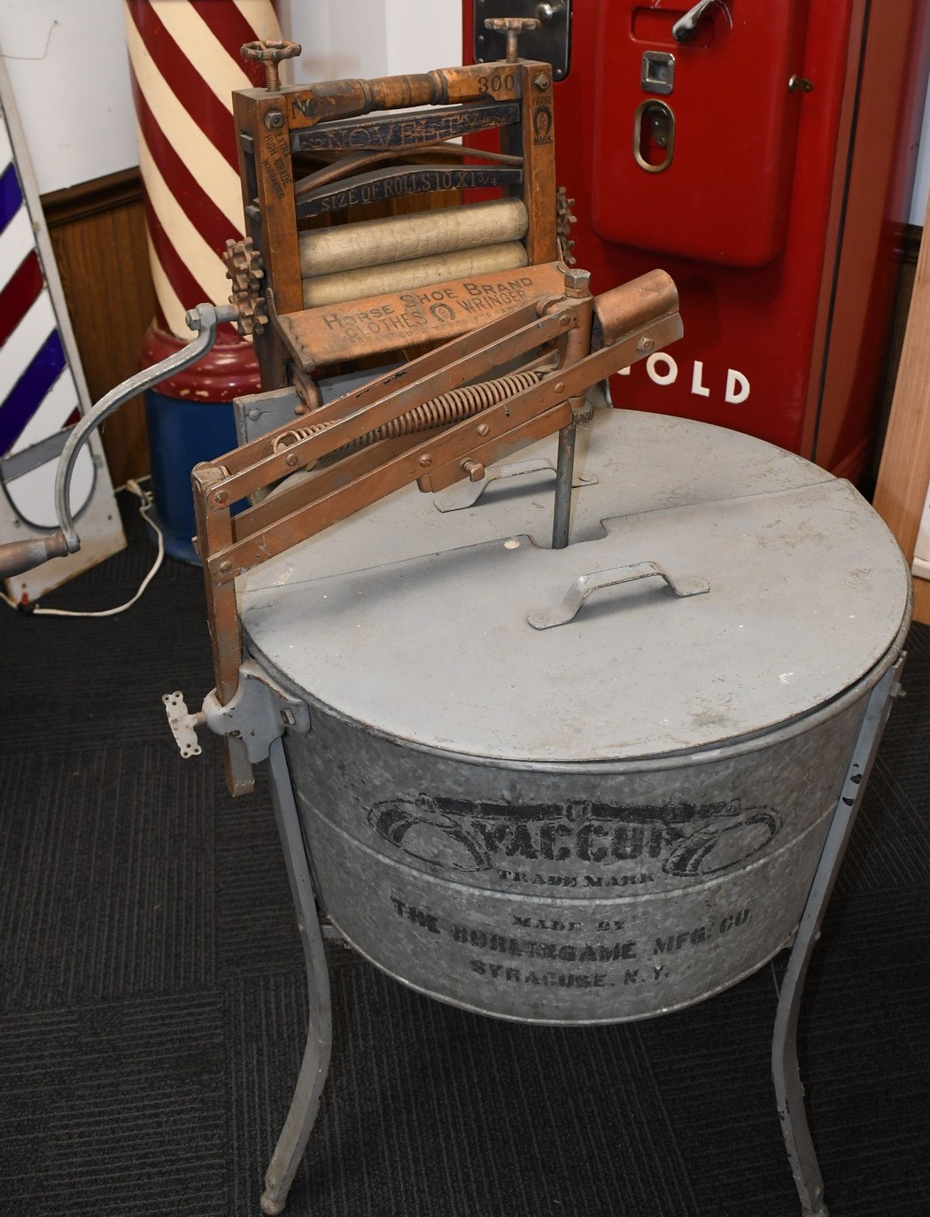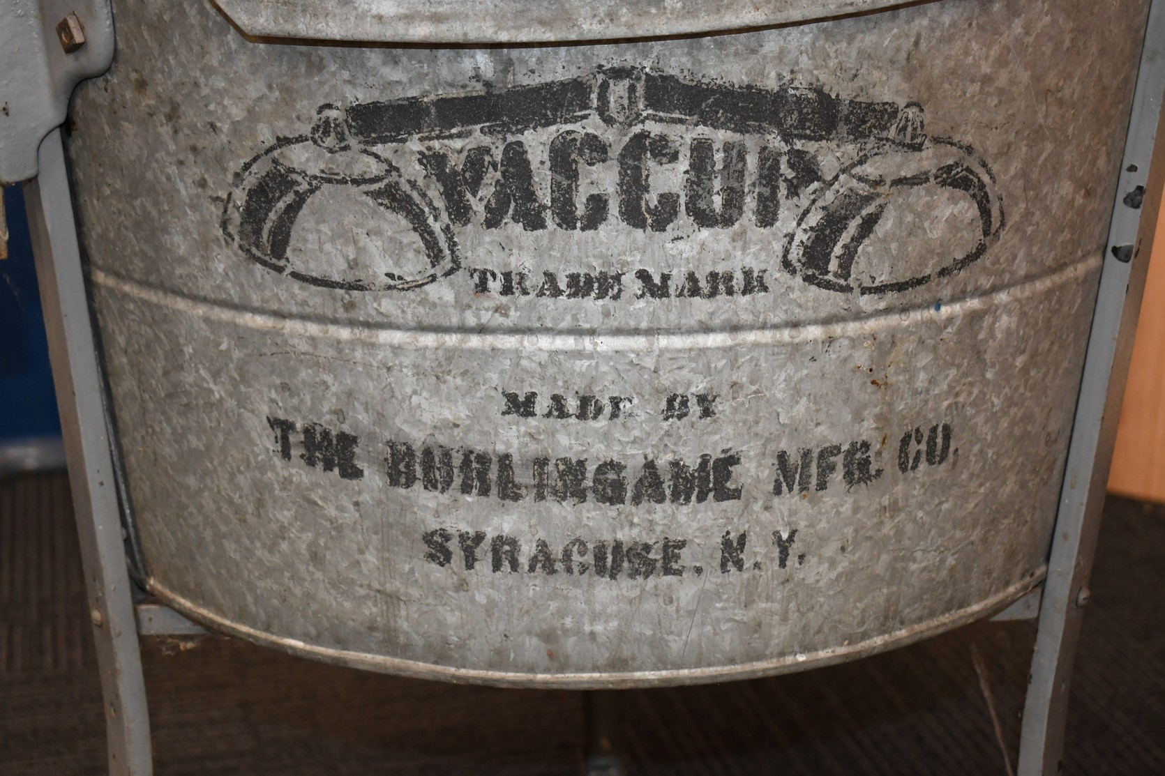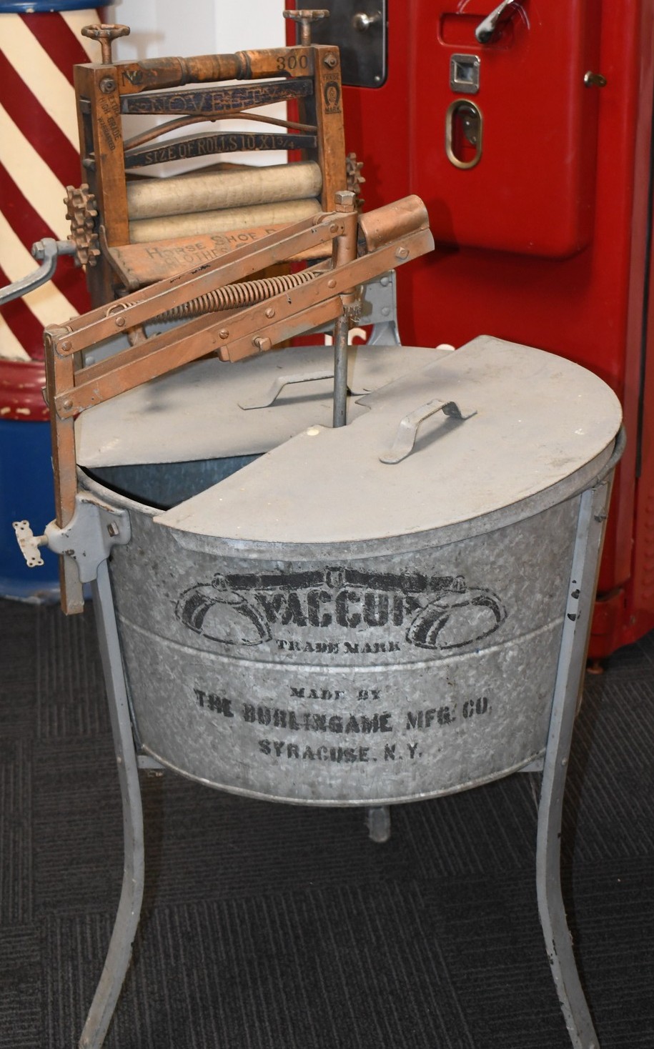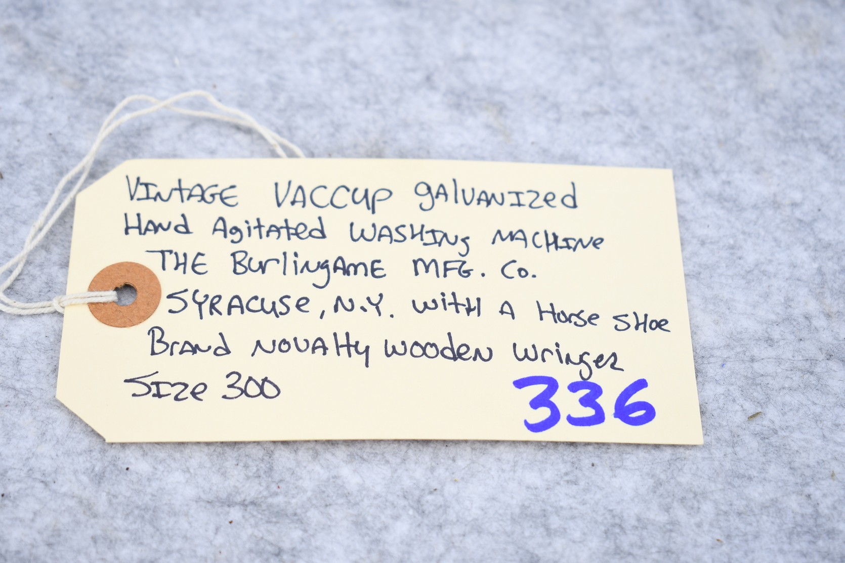 336. Vintage Vaccup Galvanized Hand-Agitated Washing Machine w/Horseshoe Brand Novelty Wooden Wringer – The Burlingame Manufacturing Co. Syracuse NY – Size 300 – Will Not Ship, Pickup Only or You Must Arrange Your Own Shipping!