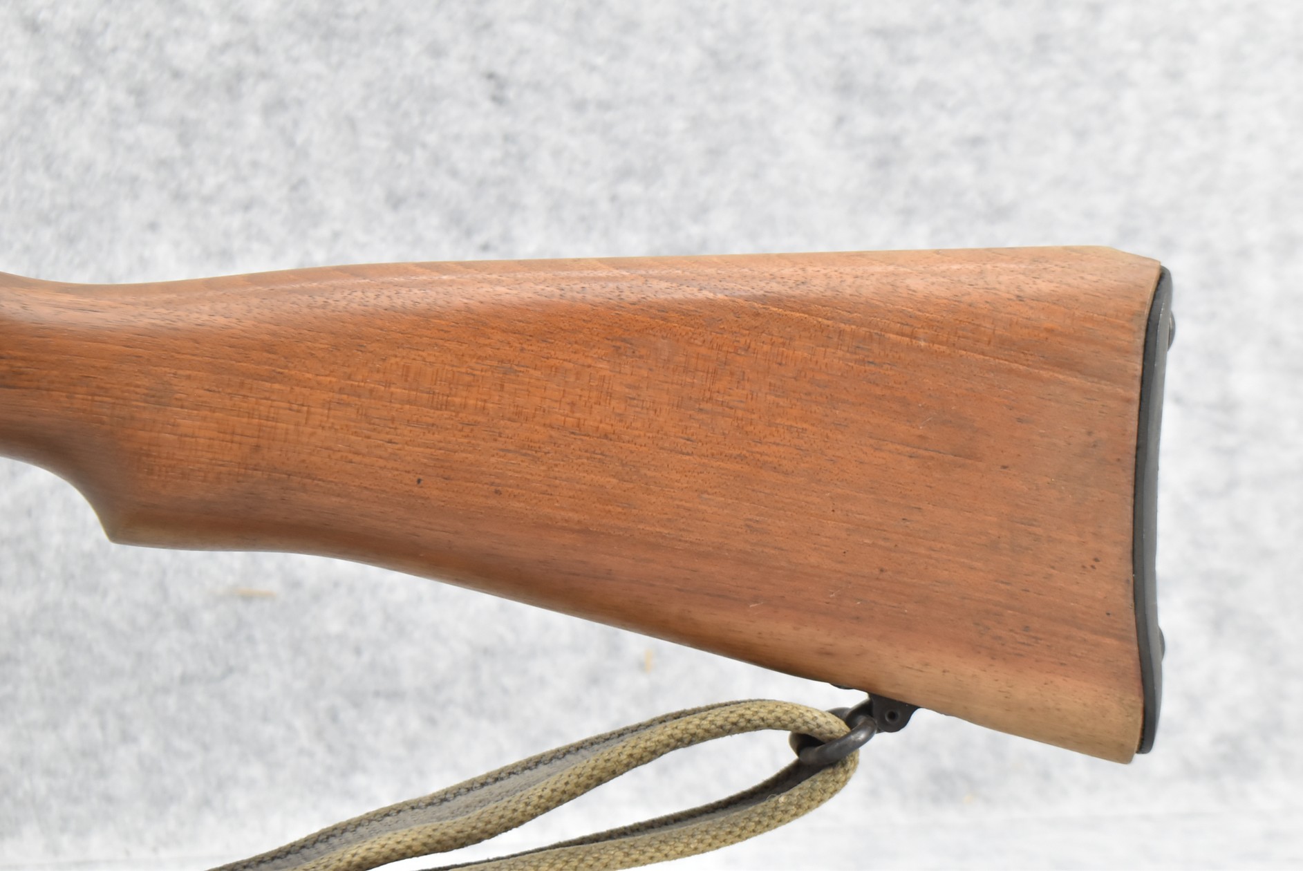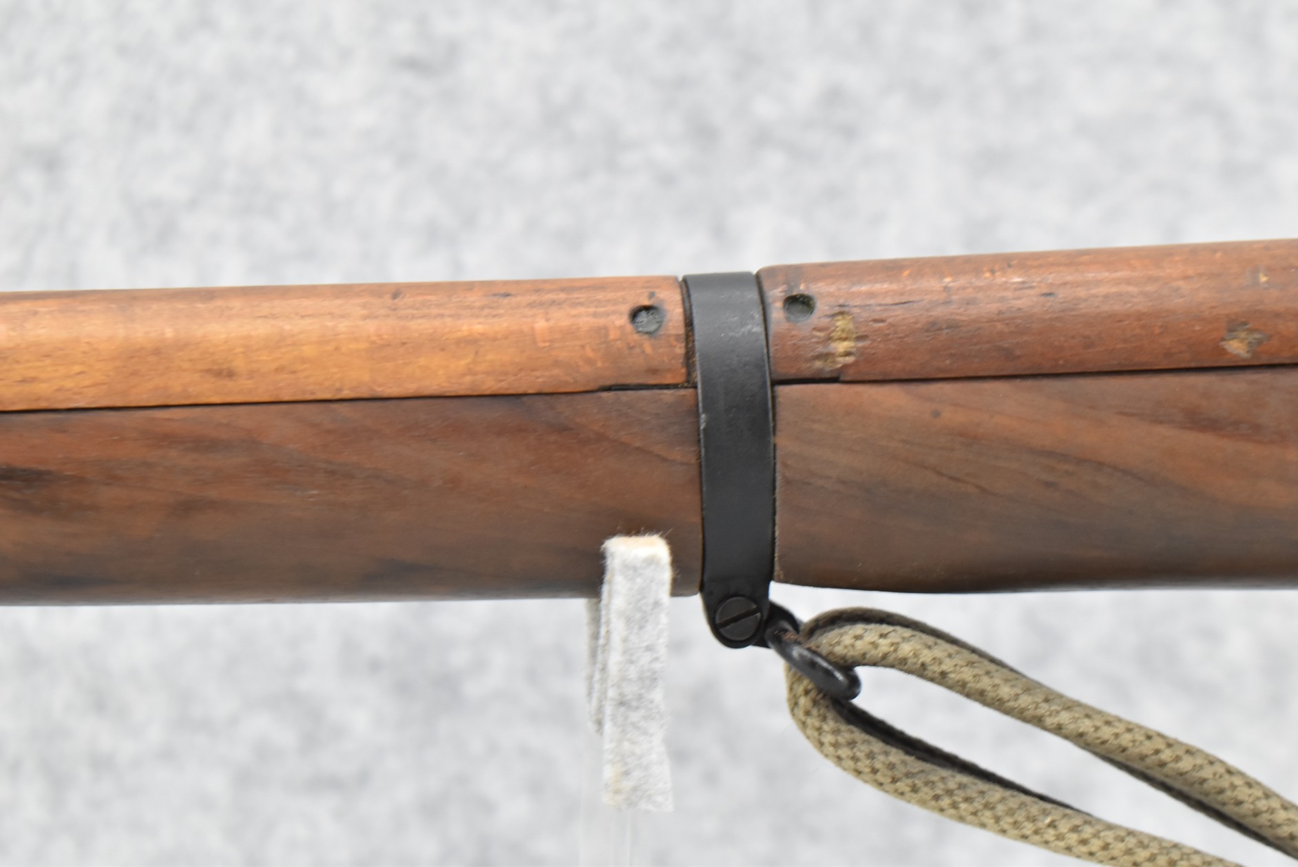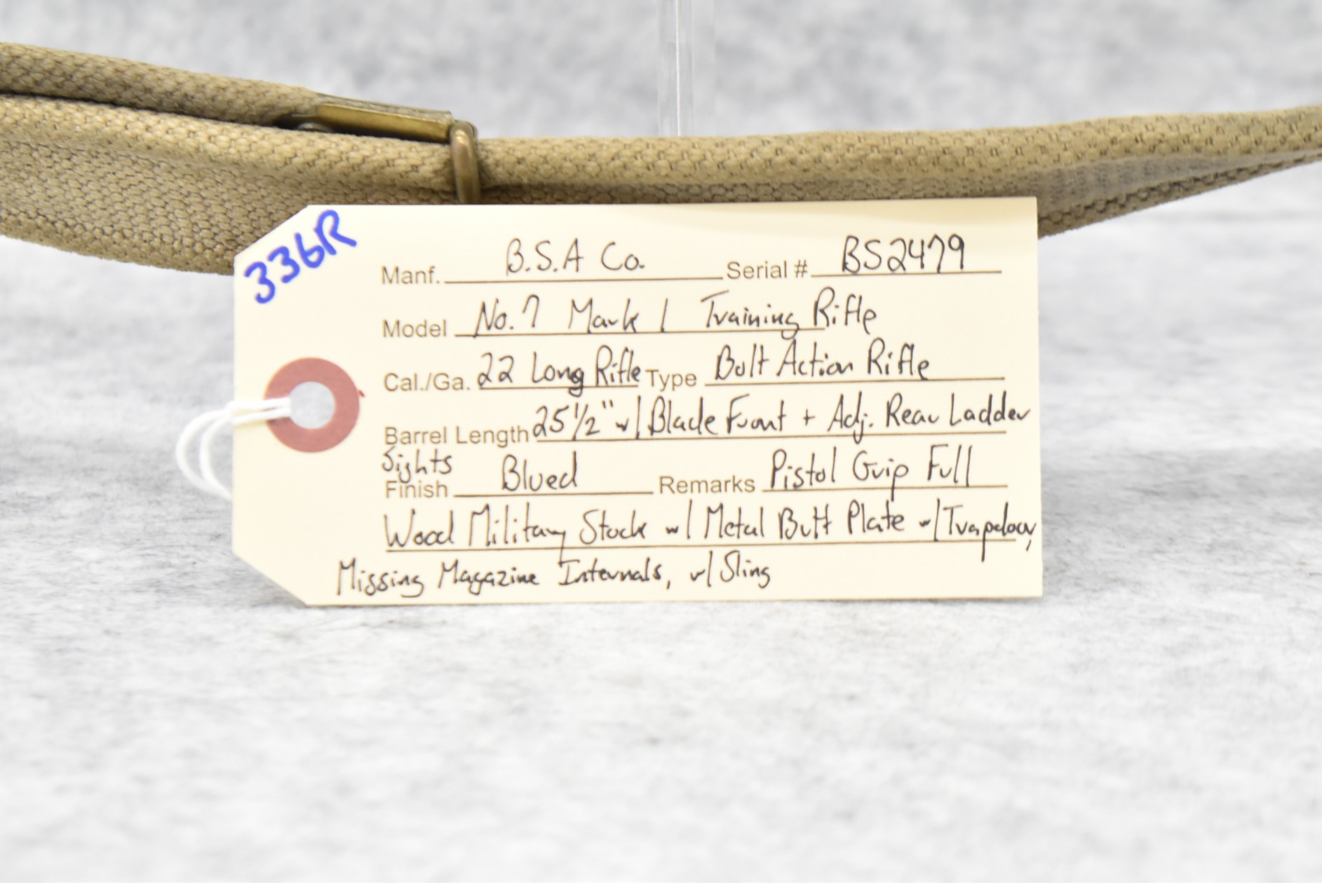 336R. B.S.A. Co. – Mod. No. 7 Mark I Training Rifle – 22 Long Rifle Cal. Bolt Action Rifle – w/25 ½” Barrel w/Blade Front & Adj. Rear Ladder Sights – Blued Finish – w/Pistol Grip Full Wood Military Stock w/Metal Butt Plate w/Trap Door – w/Sling – Missing Magazine Internals