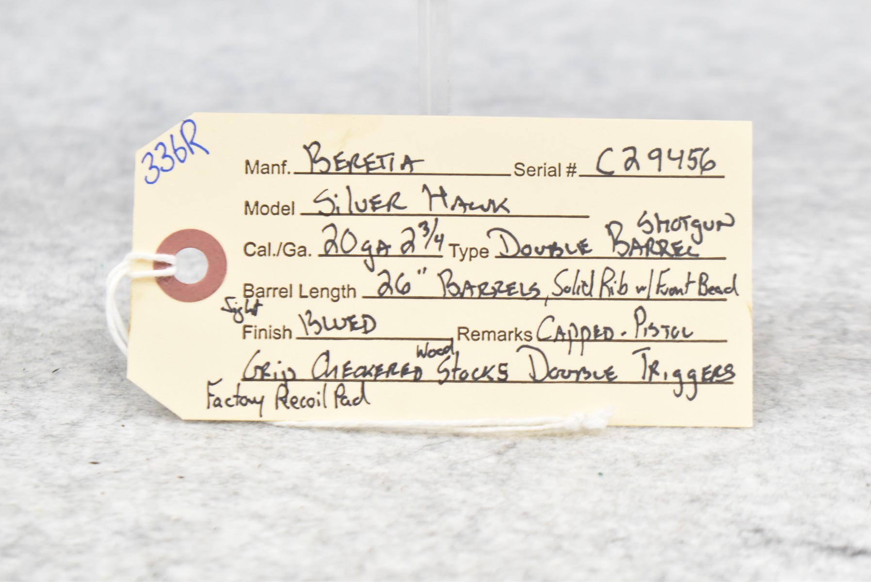 336R. Beretta – Mod. Silver Hawk – 20ga. 2 ¾” Double Barrel Shotgun – w/26” Solid Rib Barrels w/Front Bead Sight – Blued Finish – w/Capped Pistol Grip Checkered Wood Stocks w/Factory Recoil Pad – w/Double Triggers