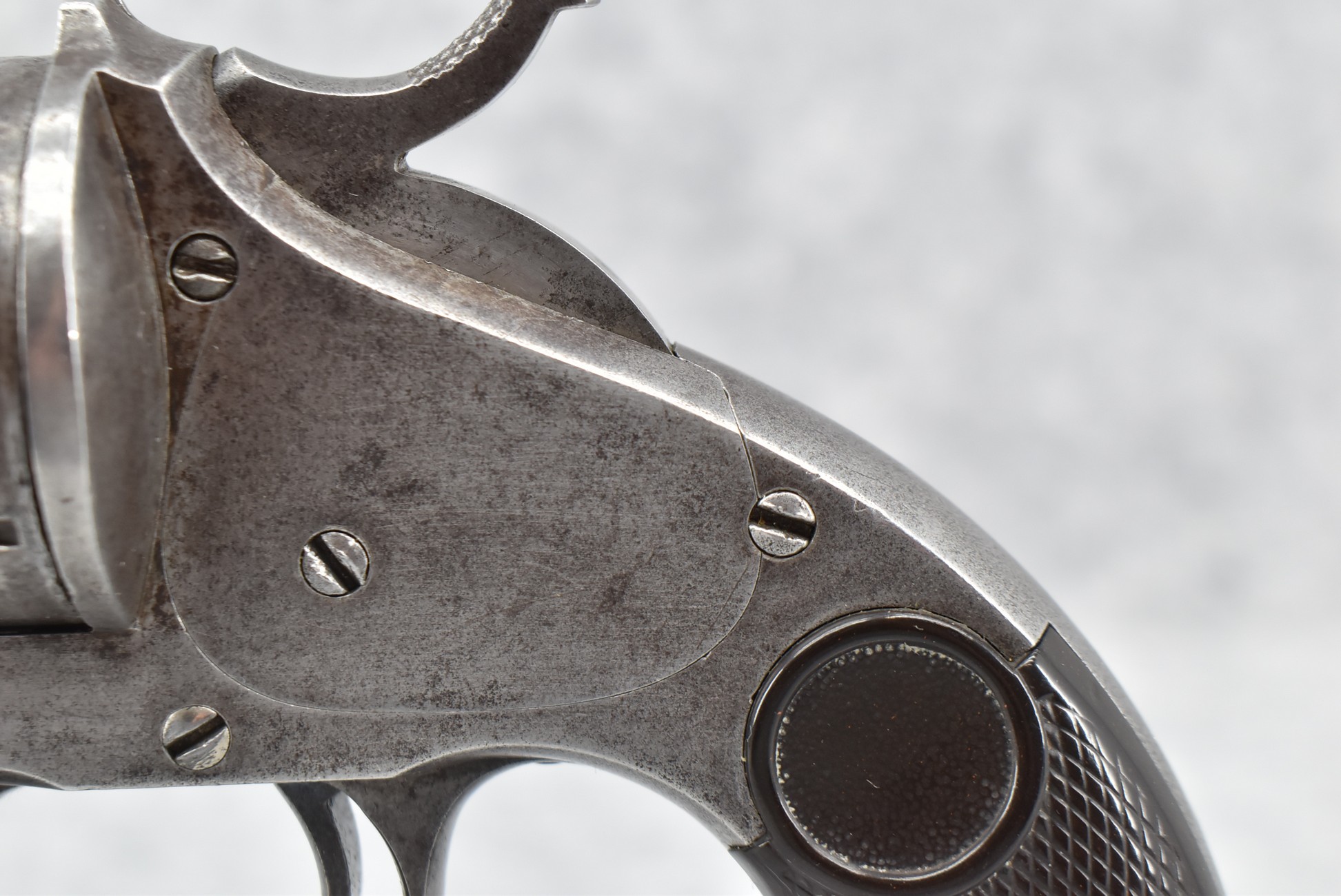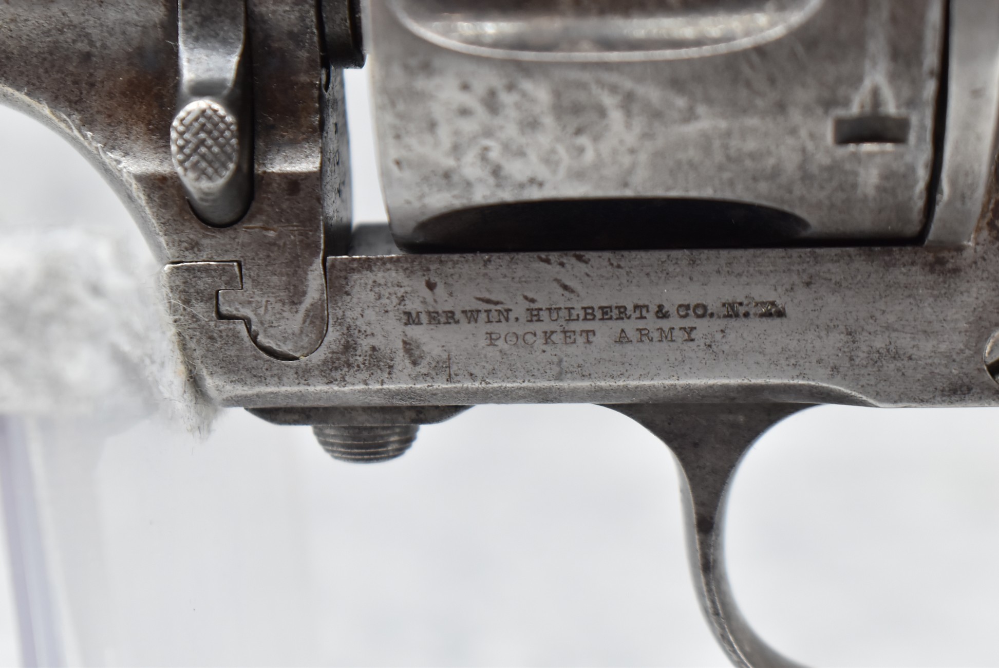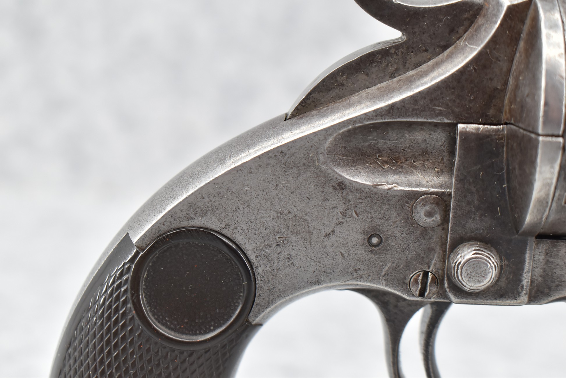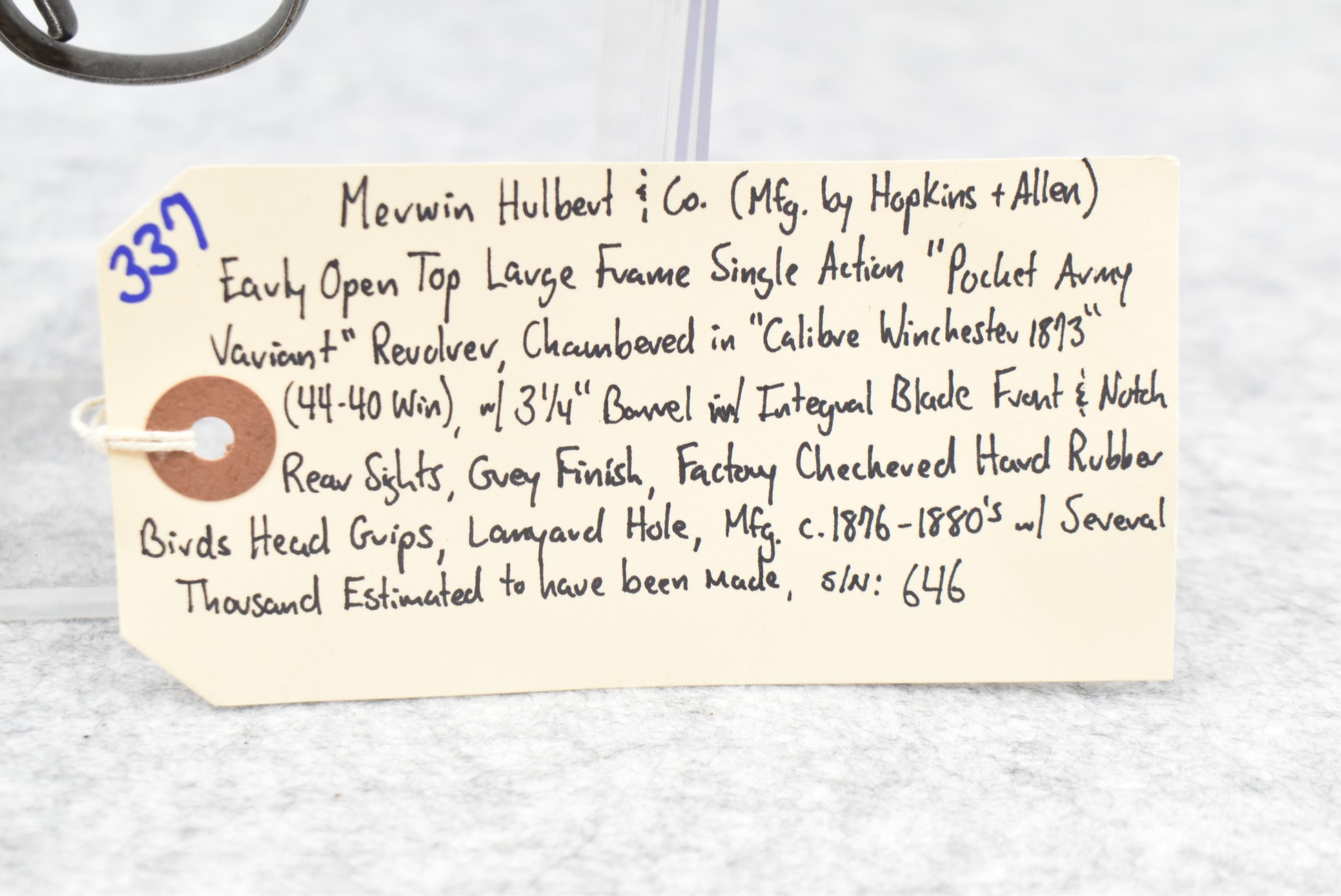 337. Merwin Hulbert & Co. (Mfg. by Hopkins & Allen) – Early Open Top Large Frame Single Action “Pocket Army Variant” Revolver – Chambered in “Calibre Winchester 1873” (44-40 Win.) Cal. – w/3 ¼” Barrel w/Integral Blade Front & Notch Rear Sights – Gray Finish – w/Factory Checkered Hard Rubber Birds Head Grips – w/Lanyard Hole – Several Thousands Estimated to Have Been Mfg. Between 1876-1880’s