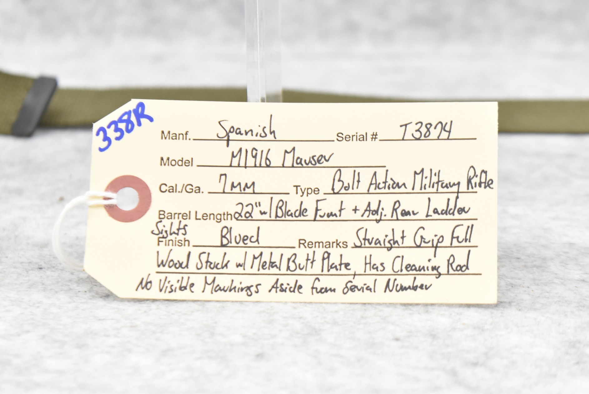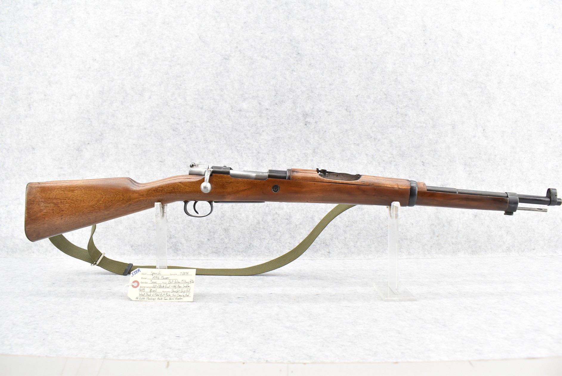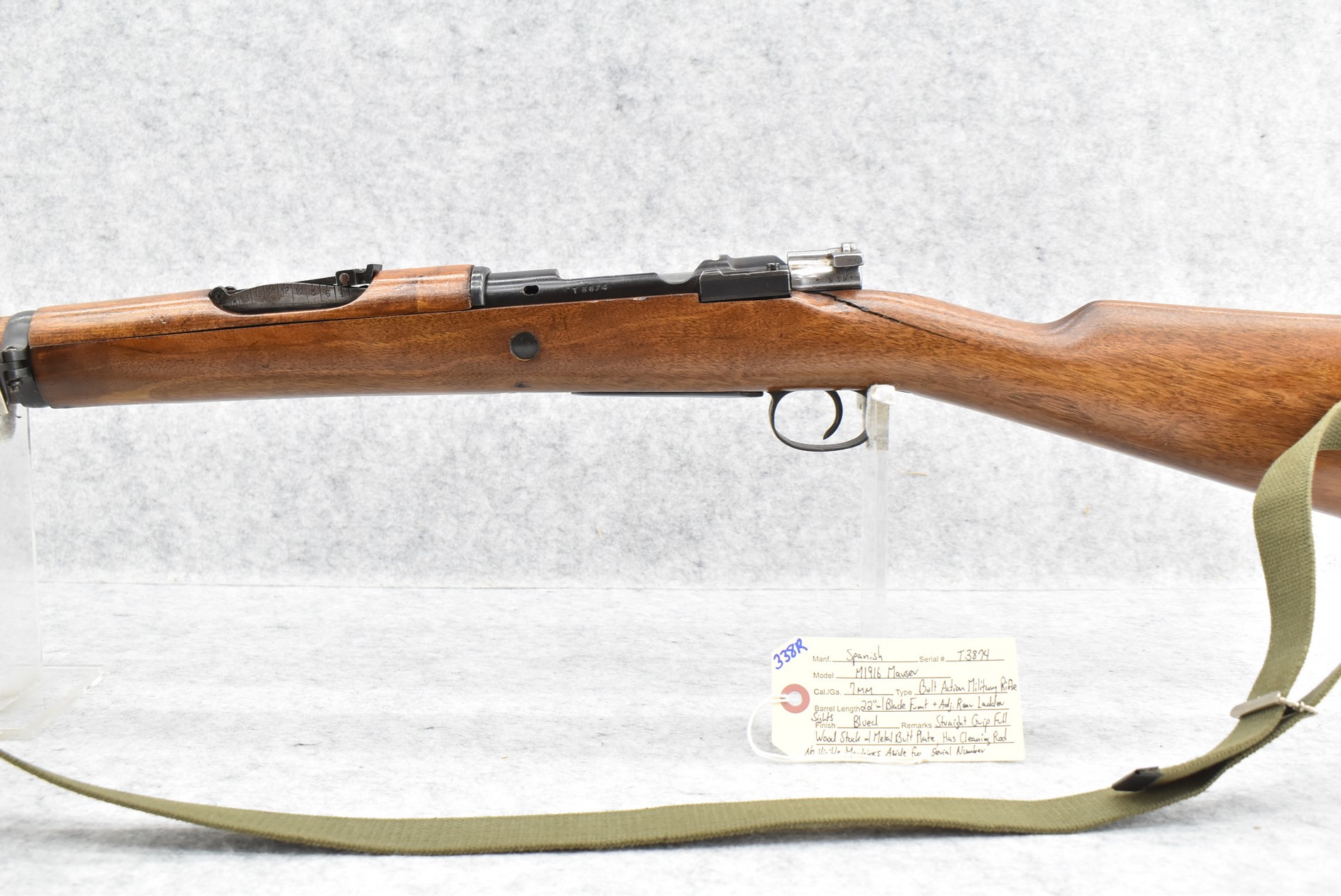 338R. Spanish – Mod. M1916 Mauser – 7mm Cal. Bolt Action Military Rifle – w/22” Barrel w/Blade Front & Adj. Rear Ladder Sights – Blued Finish – w/Straight Grip Full Wood Stock w/Metal Butt Plate – w/Cleaning Rod – No Visible Markings Aside From Serial Number