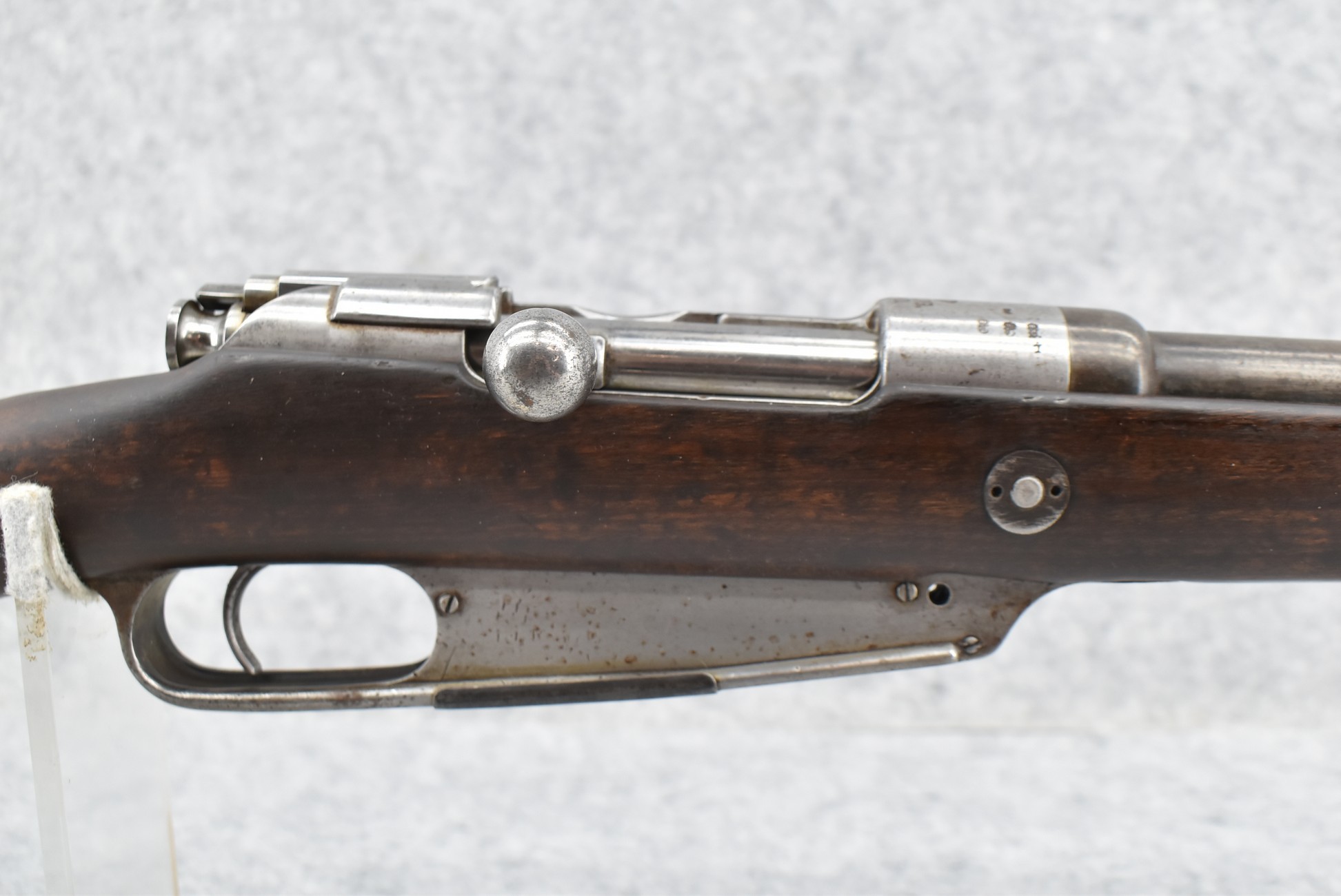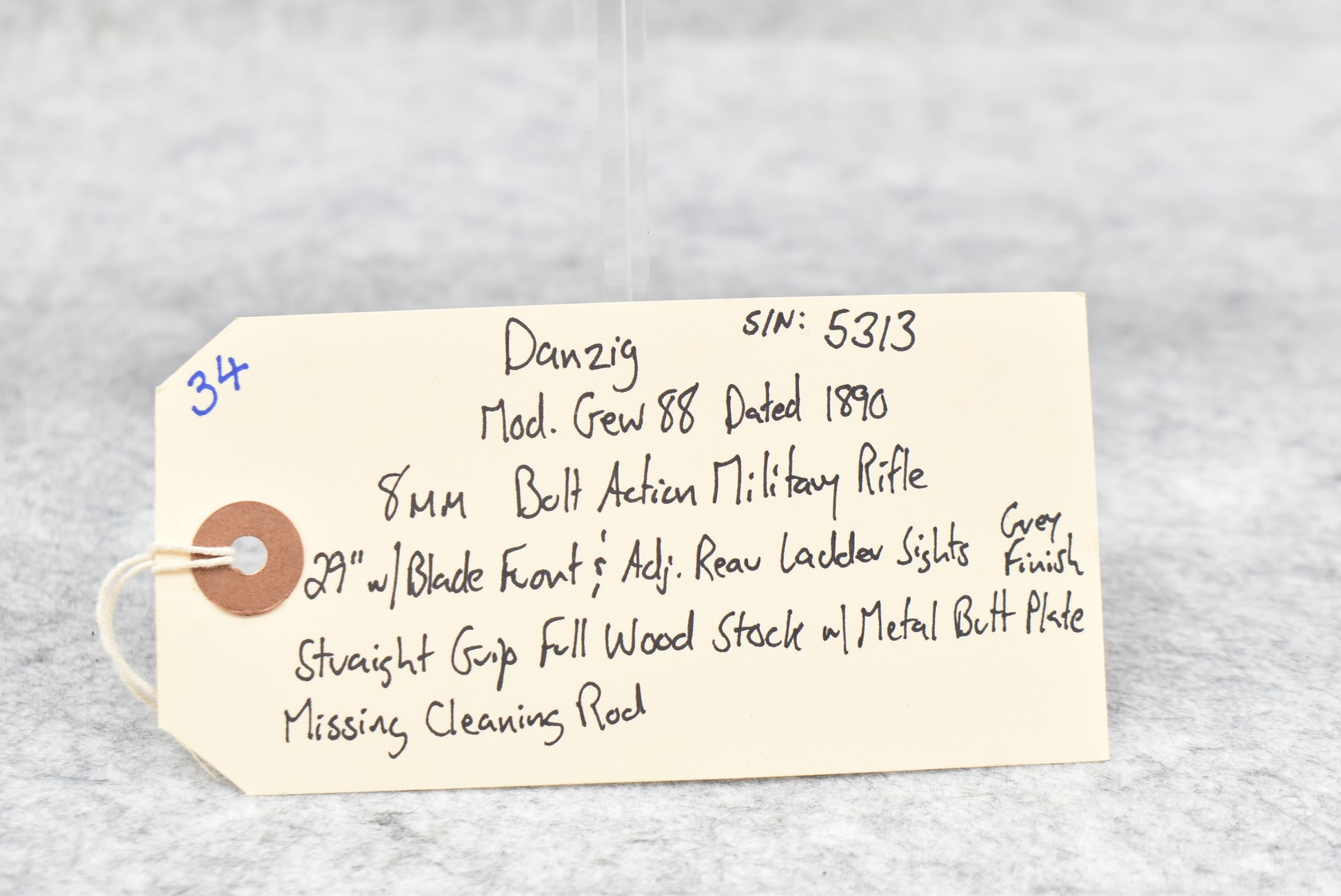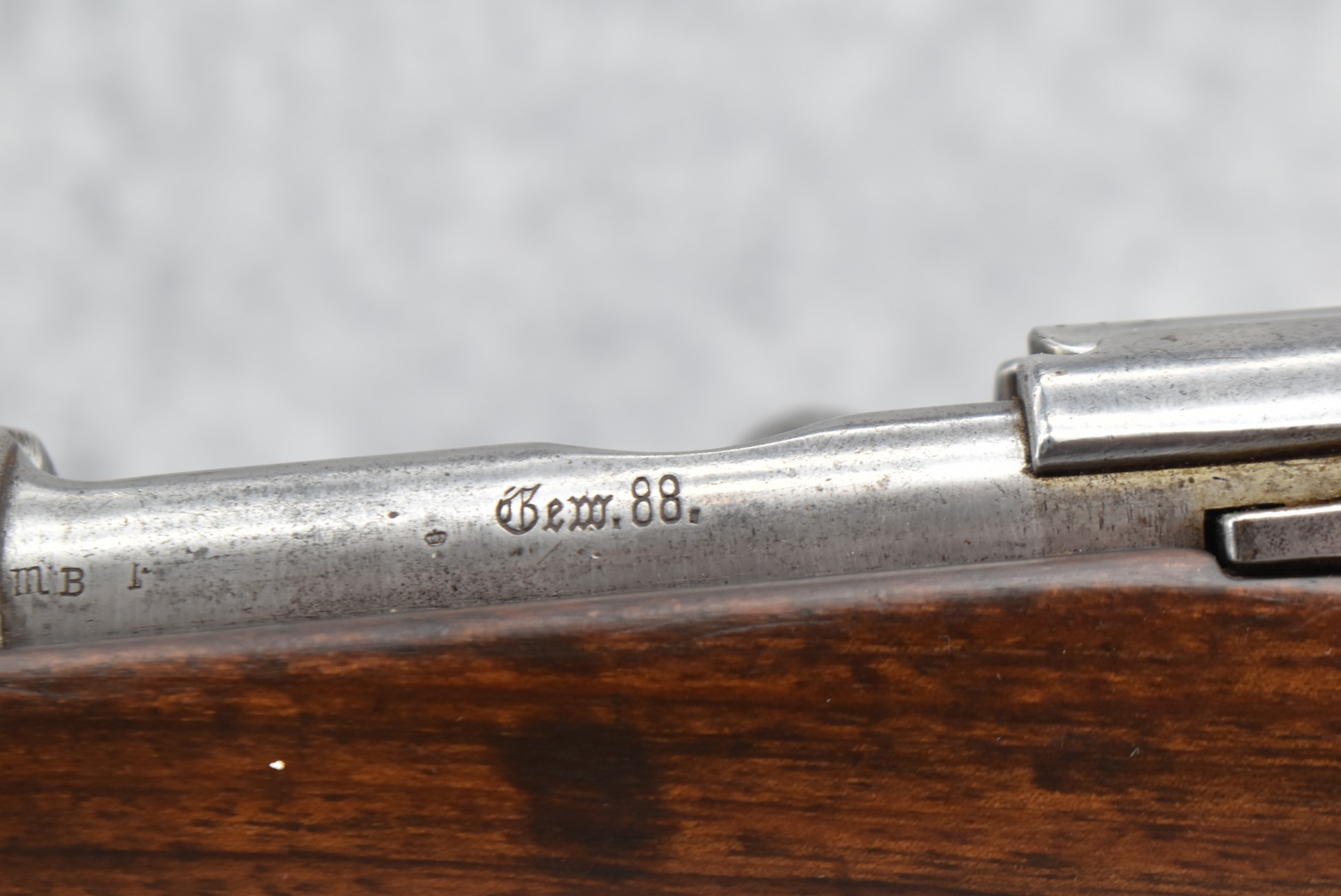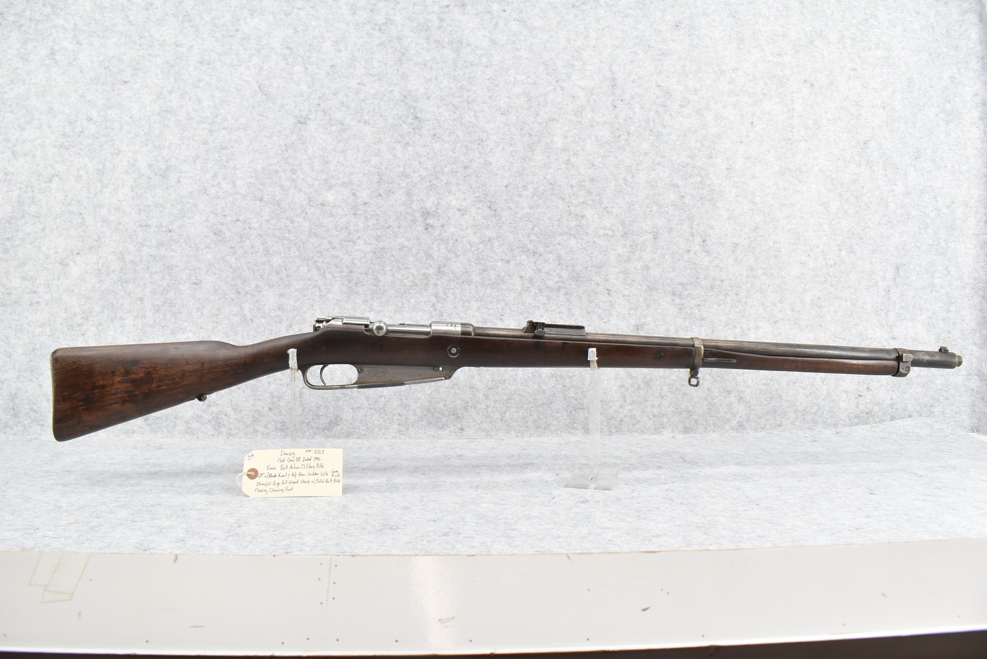 34. Danzig – Mod. Gew 88 – Dated 1890 – 8mm Cal. Bolt Action Military Rifle – w/29” Barrel w/Blade Front & Adj. Rear Ladder Sights – Gray Finish – w/Straight Grip Full Wood Stock w/Metal Butt Plate – Missing Cleaning Rod