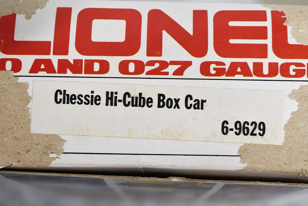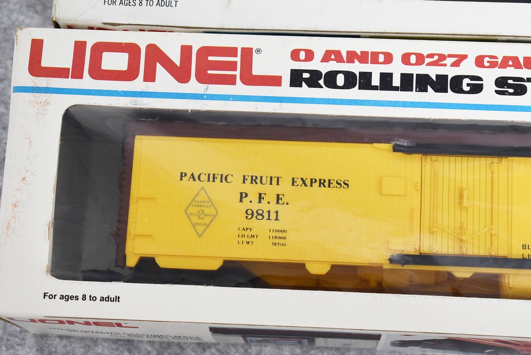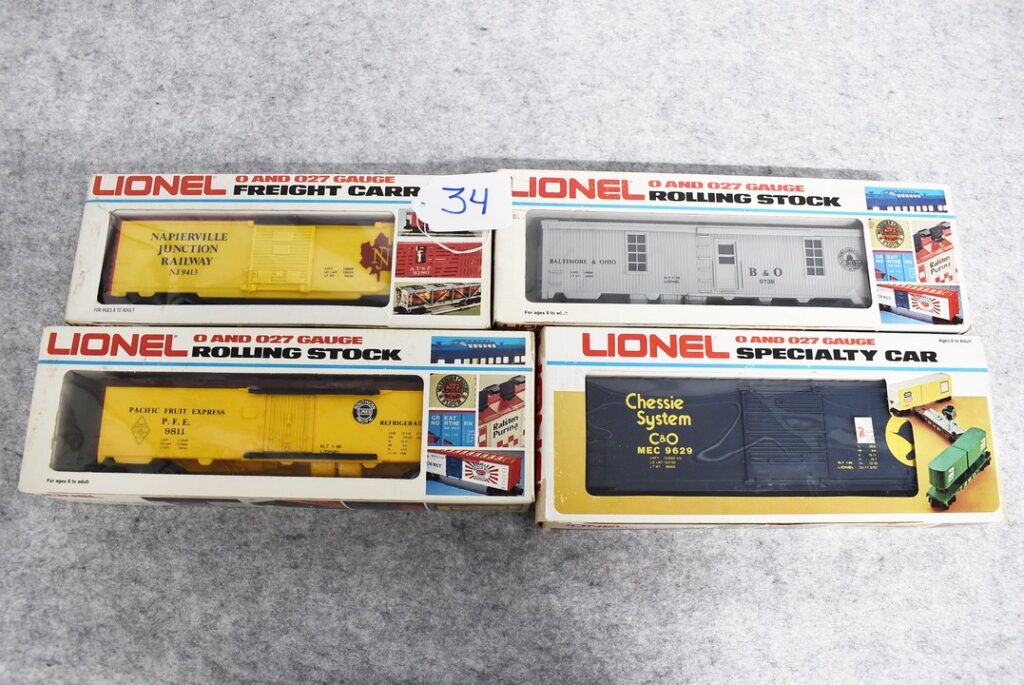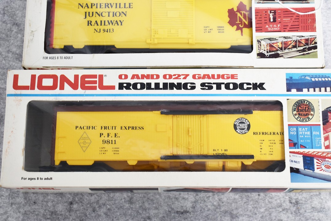 34. Lot of four Lionel O gauge train cars including 6-9413 Napierville junction box car, 6-9811 Union pacific Famous American RR reefer, 6-5739 B&O tool car & 6-9629 Chessie Hi cube boxcar, all with boxes