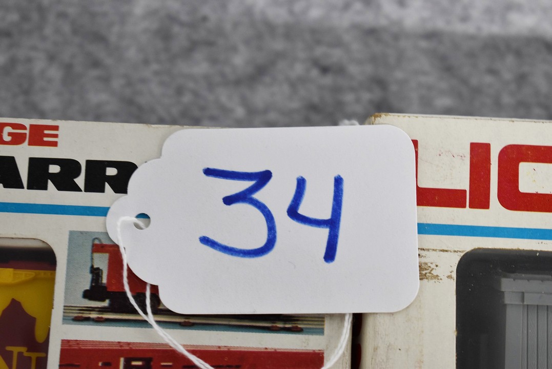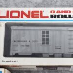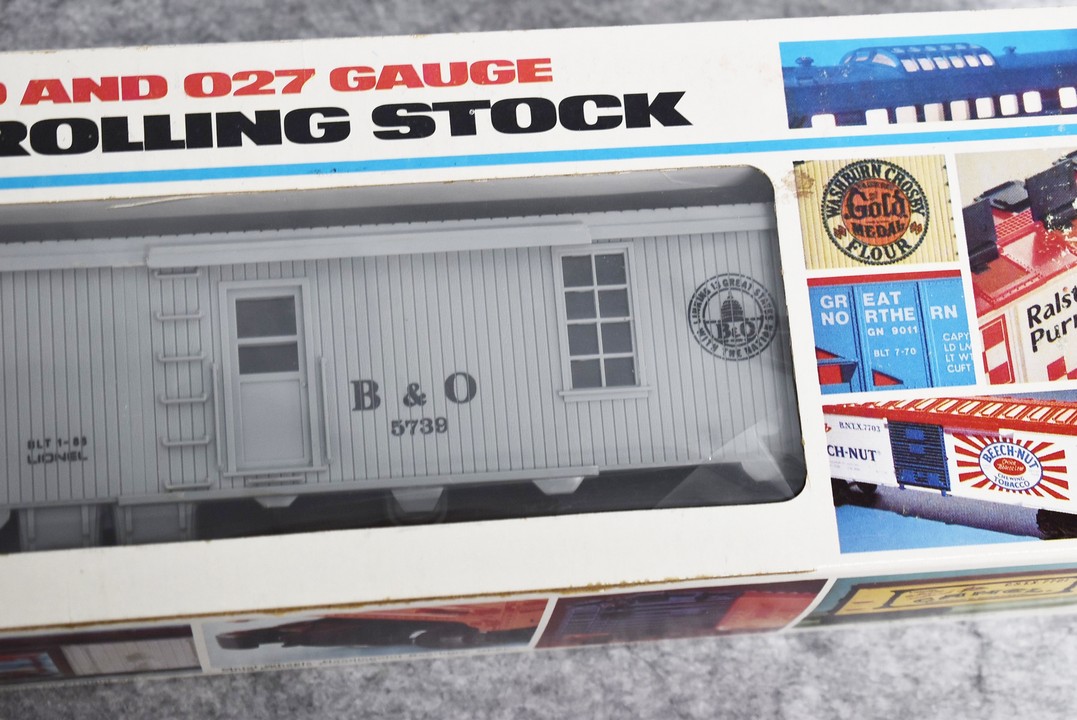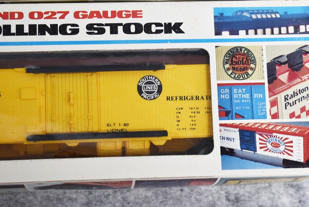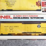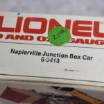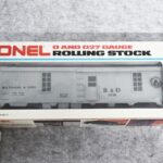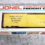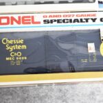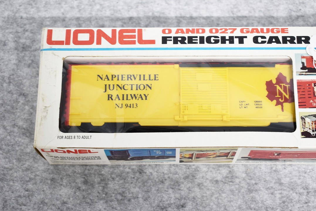 34. Lot of four Lionel O gauge train cars including 6-9413 Napierville junction box car, 6-9811 Union pacific Famous American RR reefer, 6-5739 B&O tool car & 6-9629 Chessie Hi cube boxcar, all with boxes