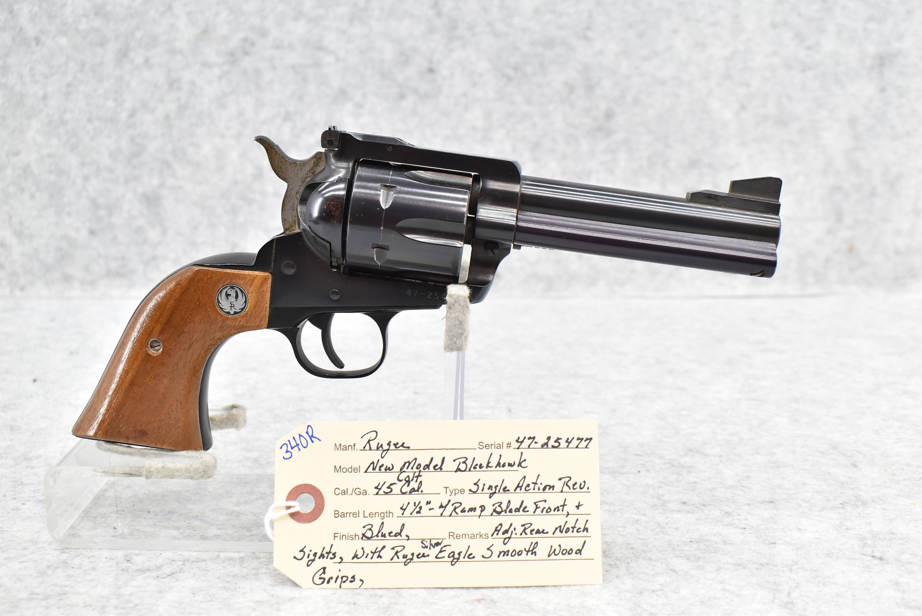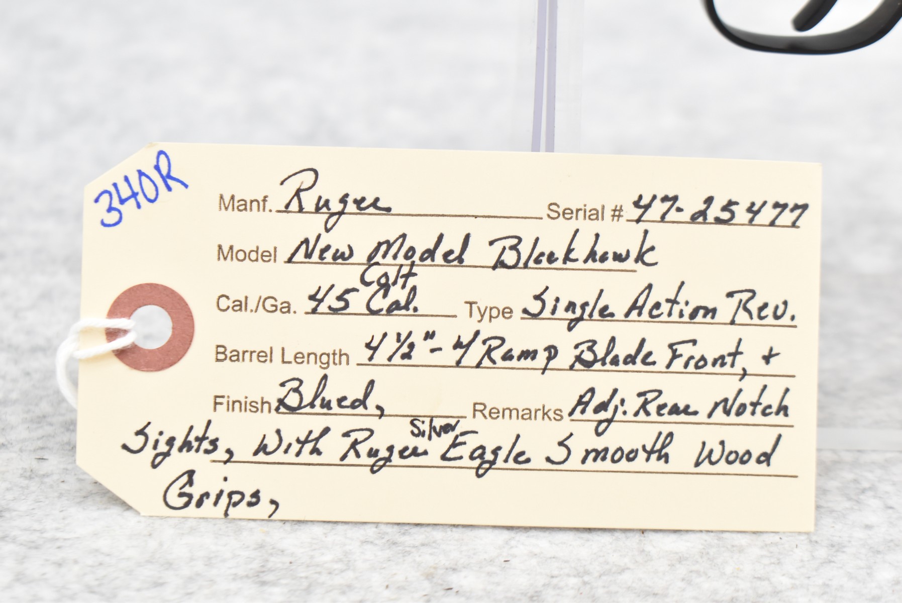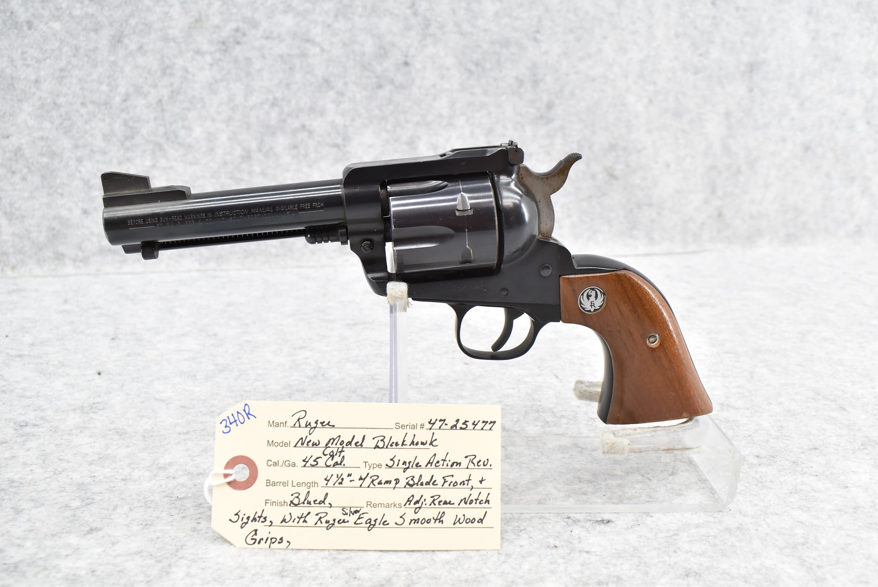 340R.     Ruger – New Model Blackhawk – 45 Colt Cal. Single Action Revolver – w/4 ½” Barrel w/Ramp Blade Front & Adj. Rear Notch Sights – Blued Finish – w/Ruger Silver Eagle Smooth Wood Grips