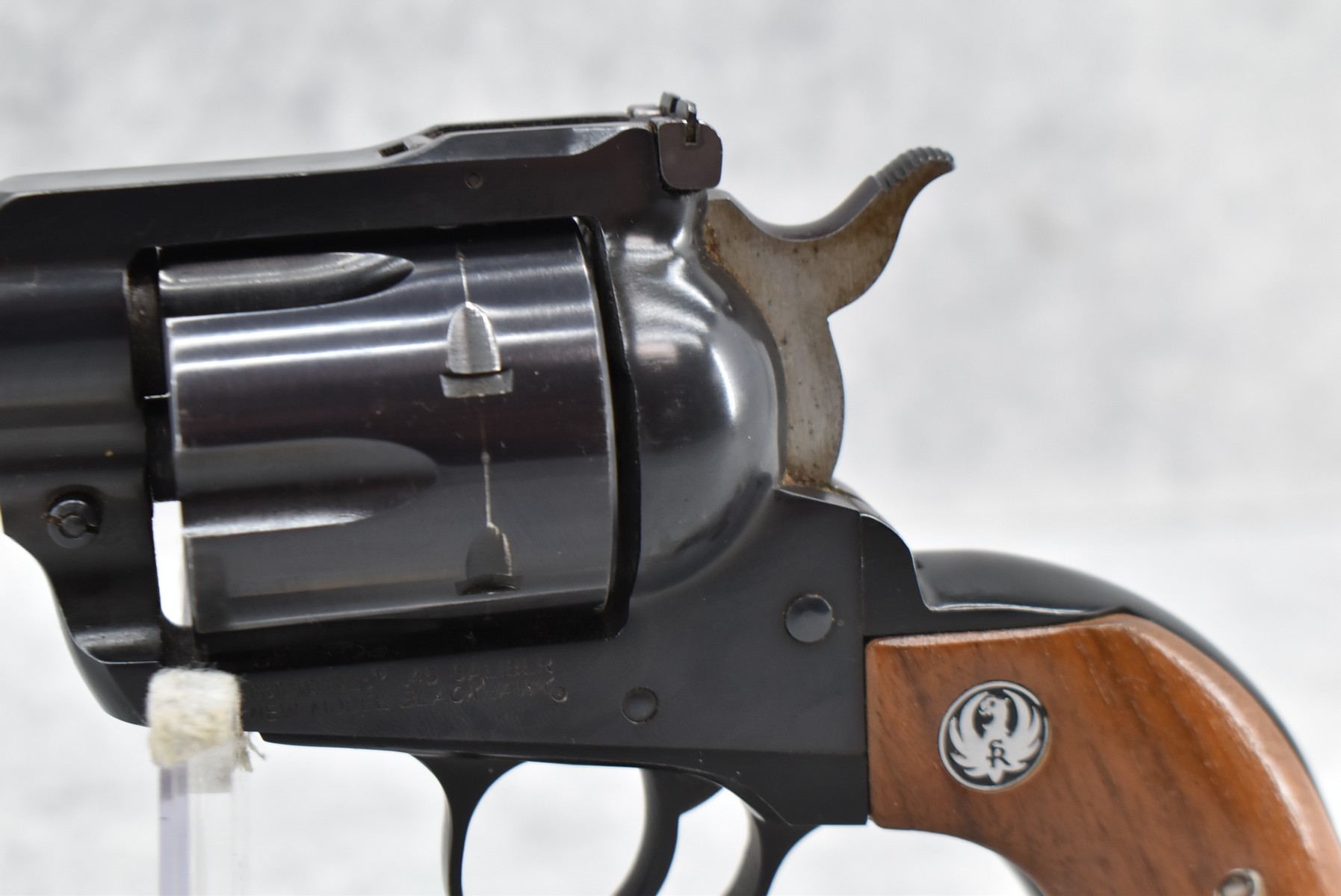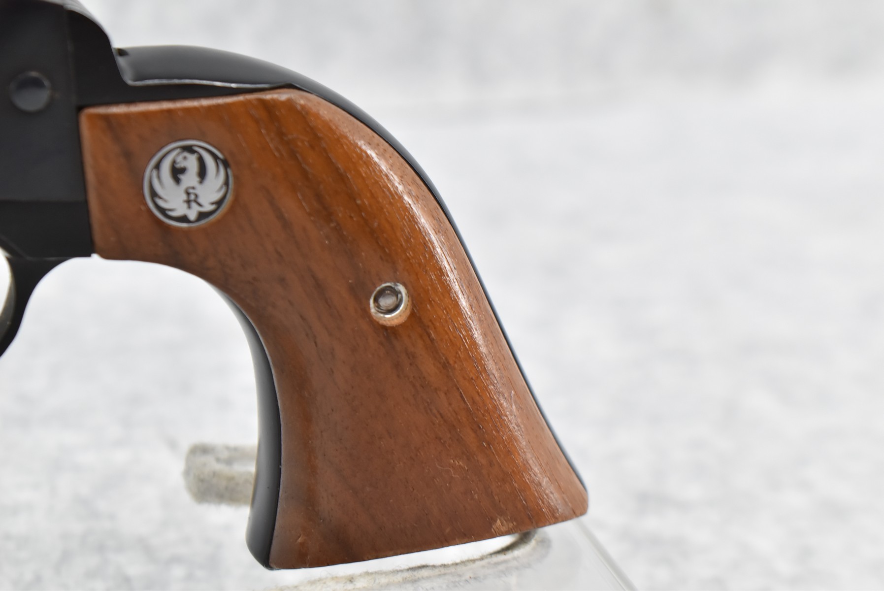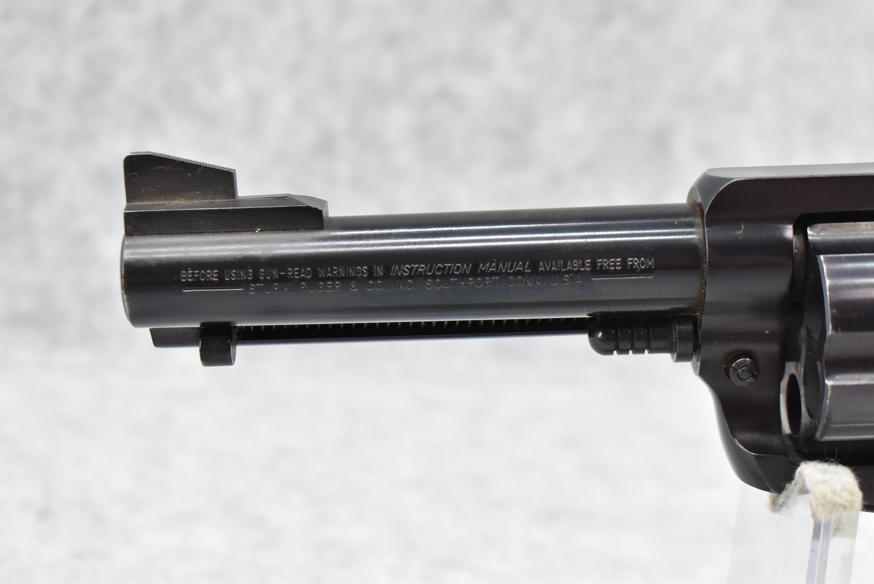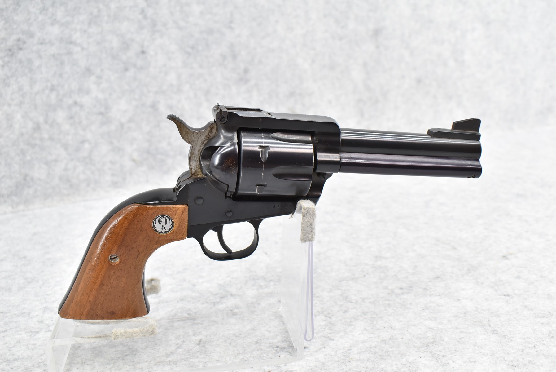 340R.     Ruger – New Model Blackhawk – 45 Colt Cal. Single Action Revolver – w/4 ½” Barrel w/Ramp Blade Front & Adj. Rear Notch Sights – Blued Finish – w/Ruger Silver Eagle Smooth Wood Grips