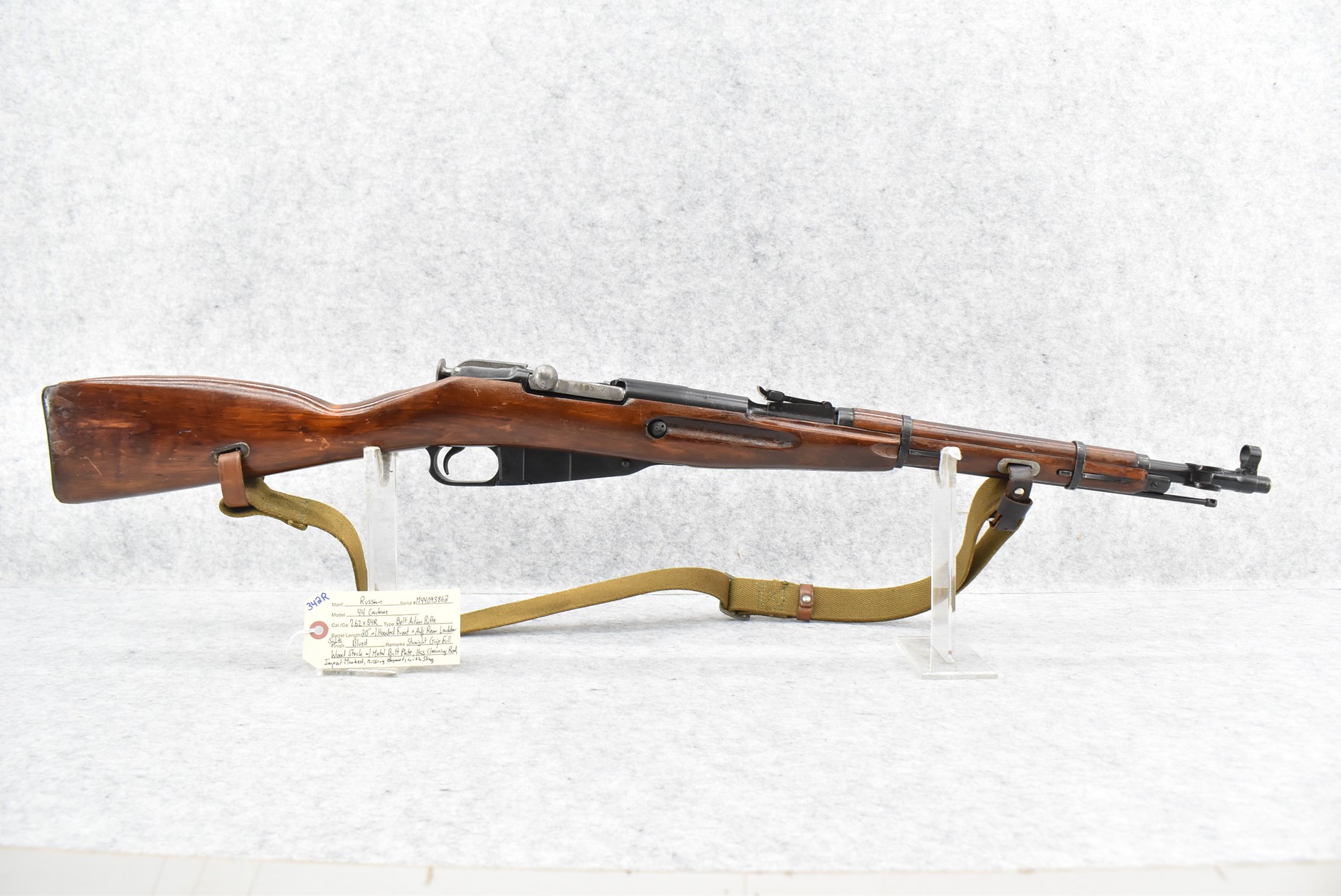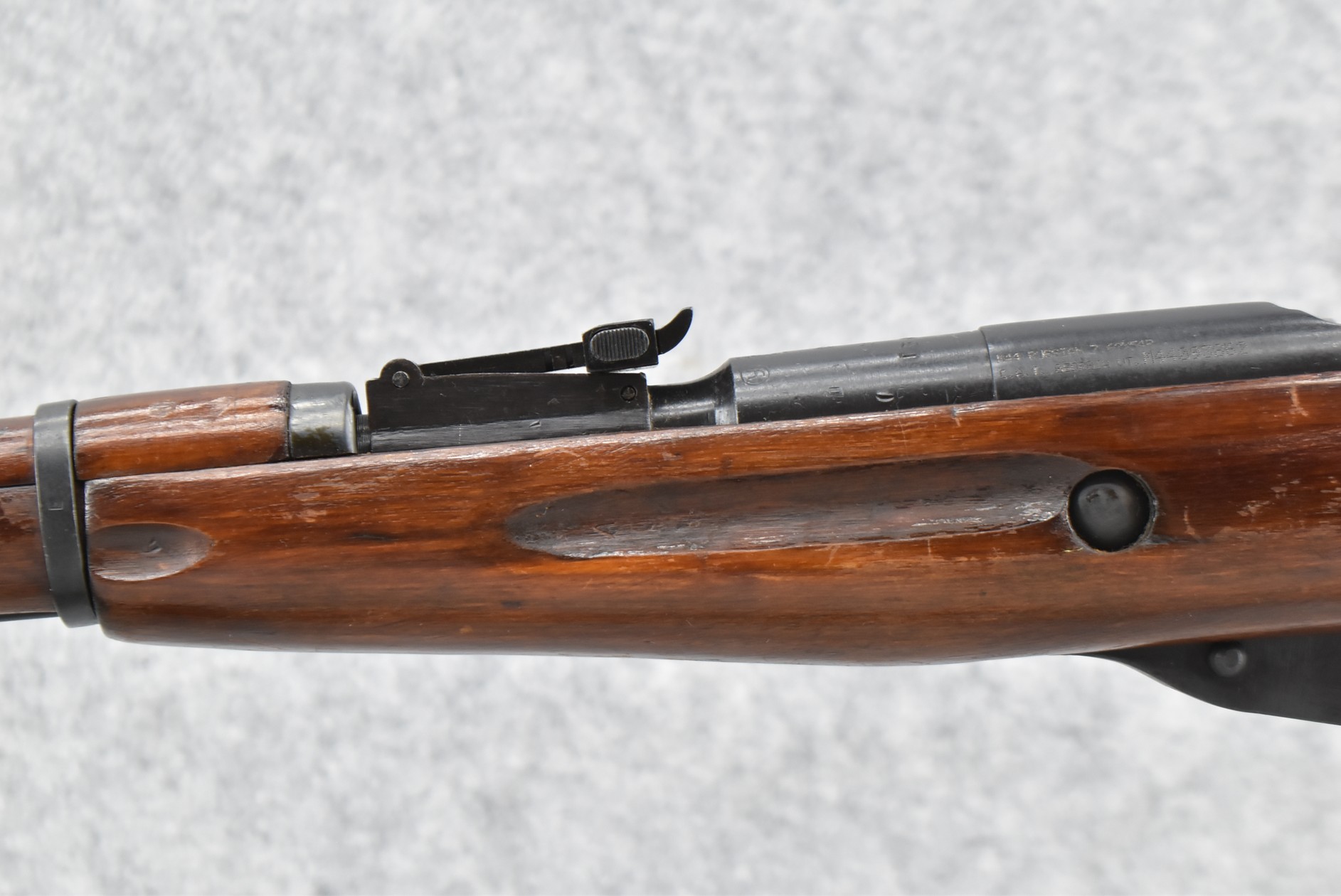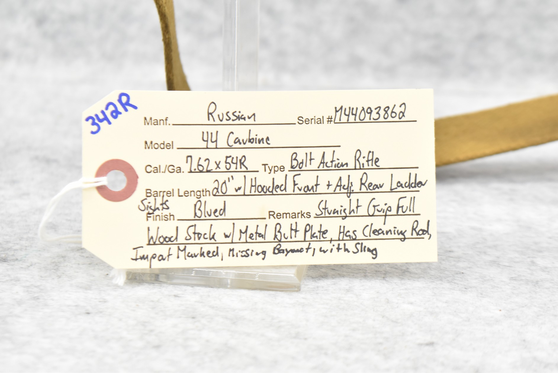 342R. Russian – Mod. 44 Carbine – 7.62x54R Cal. Bolt Action Rifle – w/20” Barrel w/Hooded Front & Adj. Rear Ladder Sights – Blued Finish – w/Straight Grip Full Wood Stock w/Metal Butt Plate – w/Cleaning Rod – w/Sling – Missing Bayonet – Import Marked
