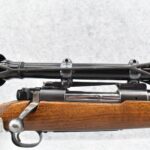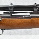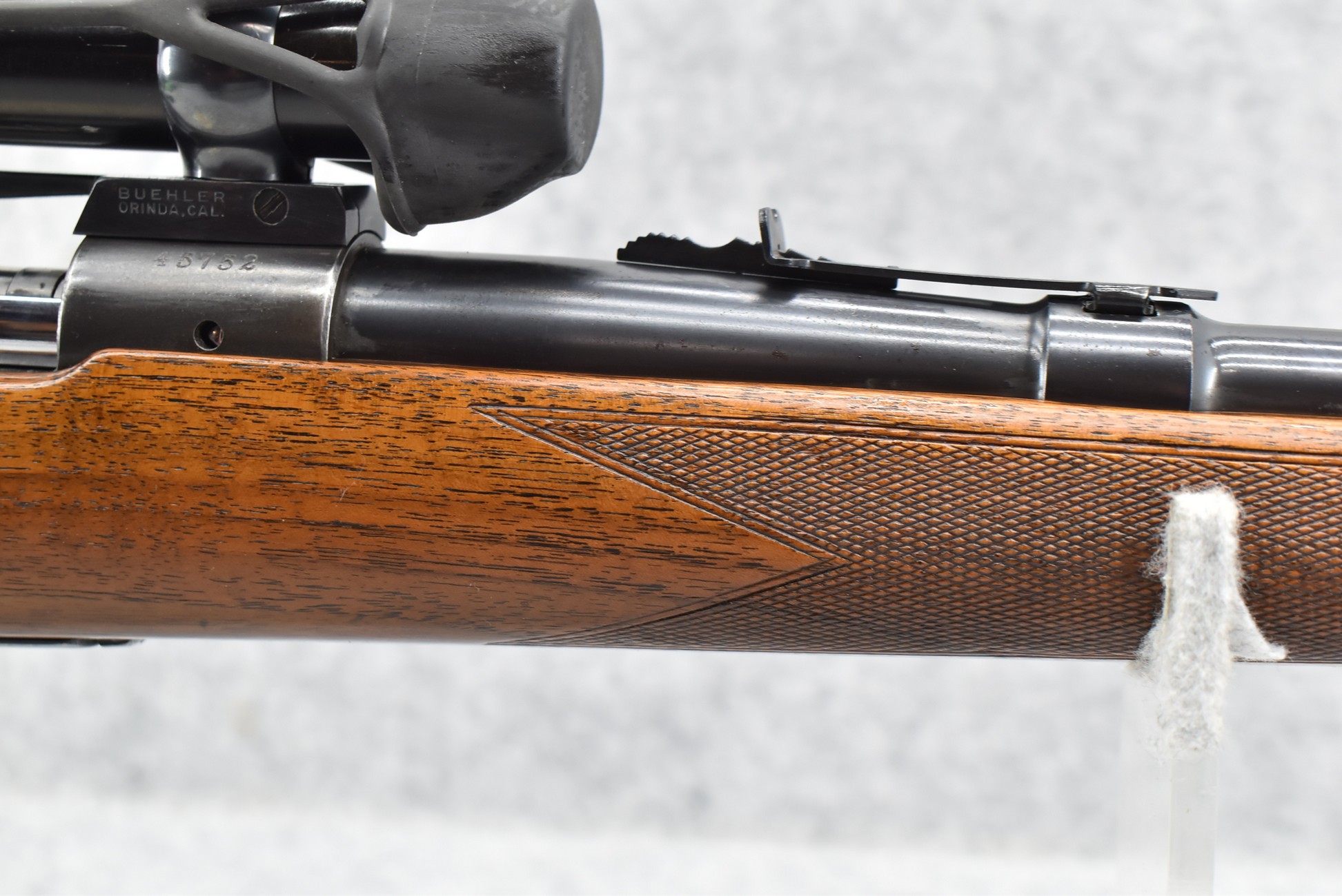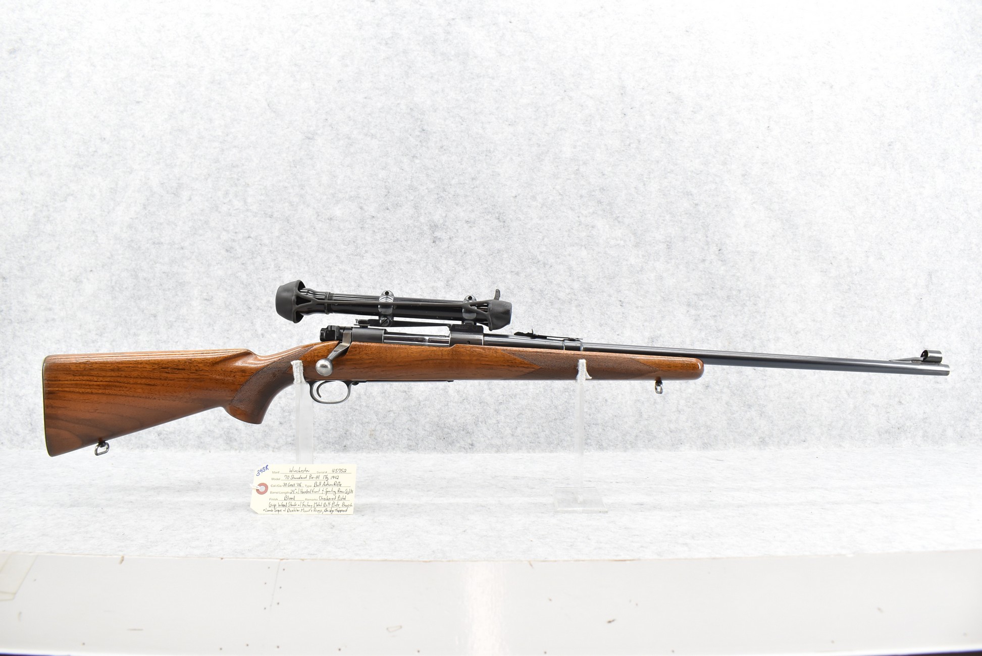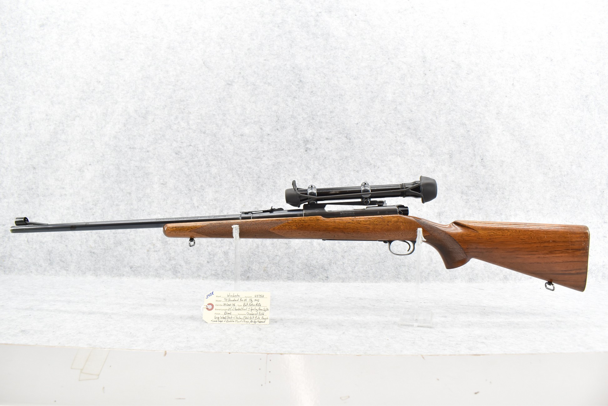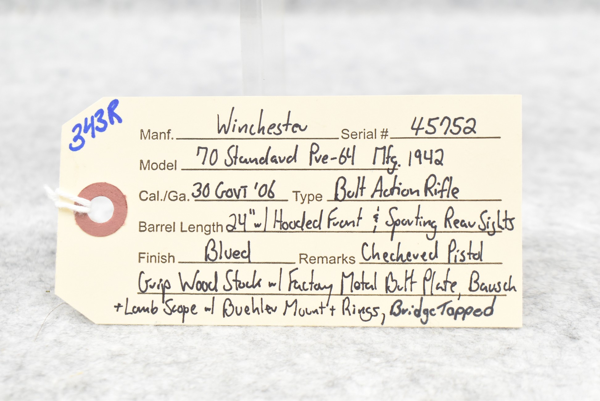 343R. Winchester – Mod. 70 Standard “Pre-64” – 30 Gov’t ’06 Cal. Bolt Action Rifle – w/24” Barrel w/Hooded Front and Sporting Rear Sights – Blued Finish – w/Checkered Pistol Grip Wood Stock w/Factory Metal Butt Plate – w/Bausch and Lomb Scope w/Buehler Mount and Rings – Bridge Tapped – Manufactured 1942