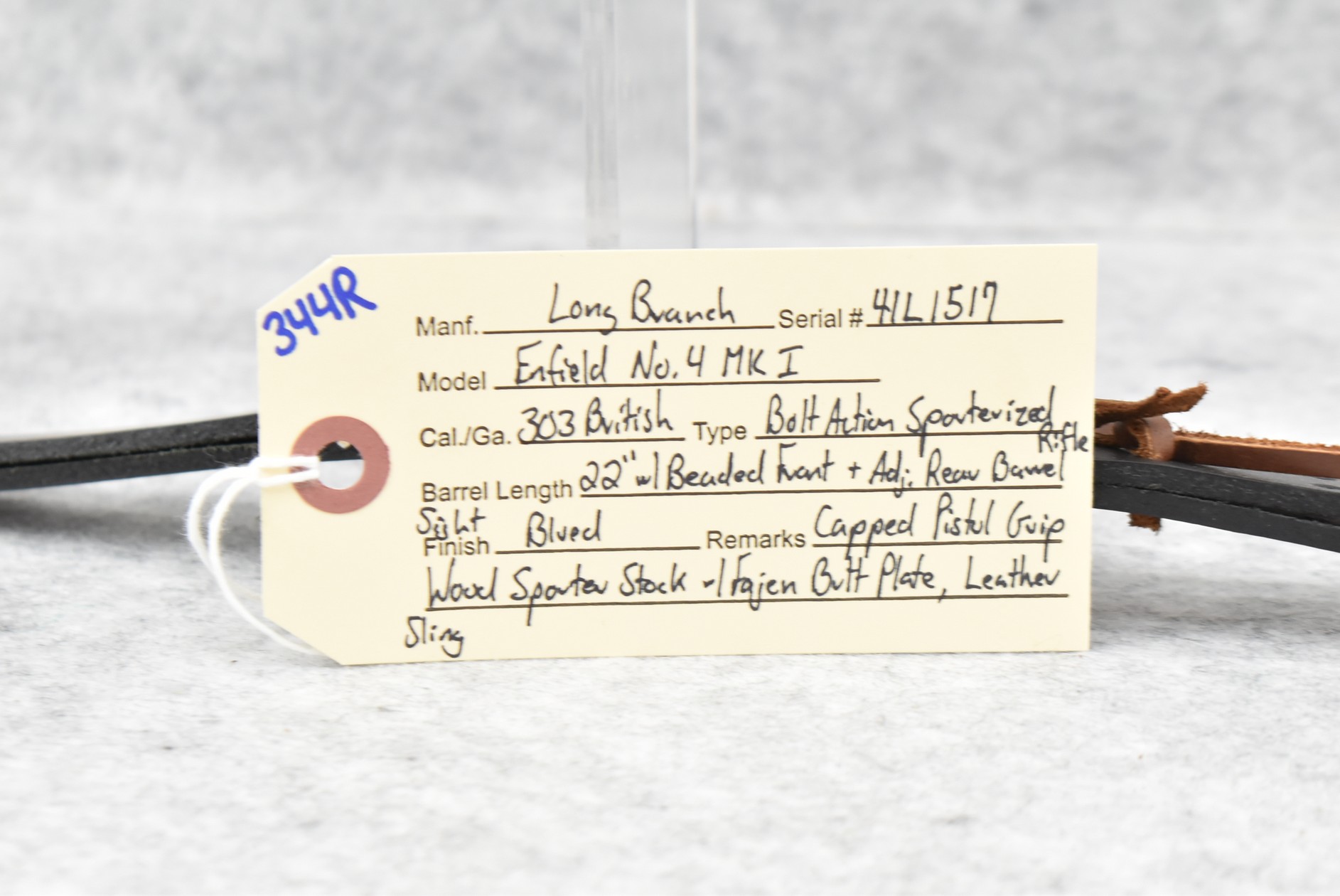 344R. Long Branch – Enfield Mod. No. 4 MK I – 303 British Cal. Bolt Action Sporterized Rifle – w/22” Barrel w/Beaded Front & Adj. Rear Barrel Sight – Blued Finish – w/Capped Pistol Grip Wood Sporter Stock w/Fajen Butt Plate – w/Leather Sling
