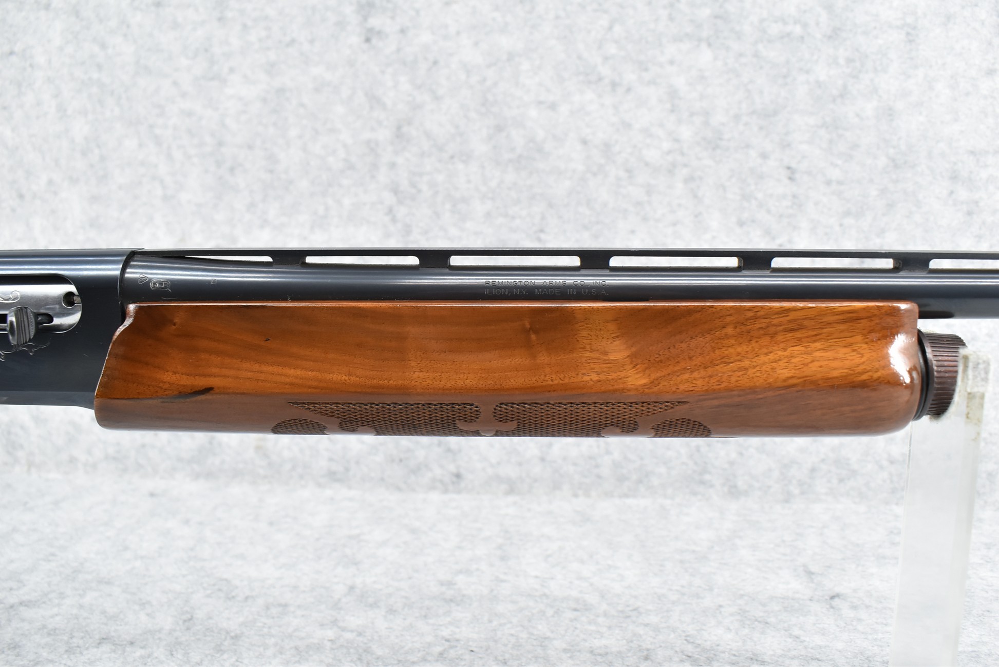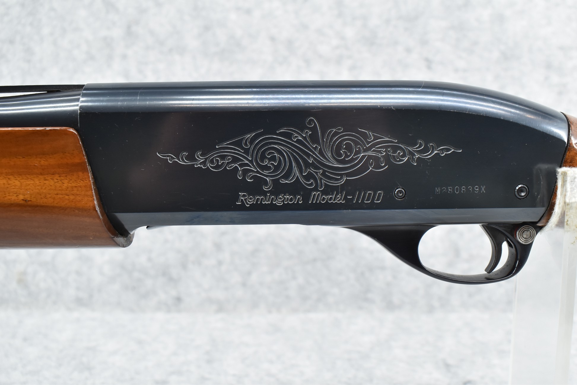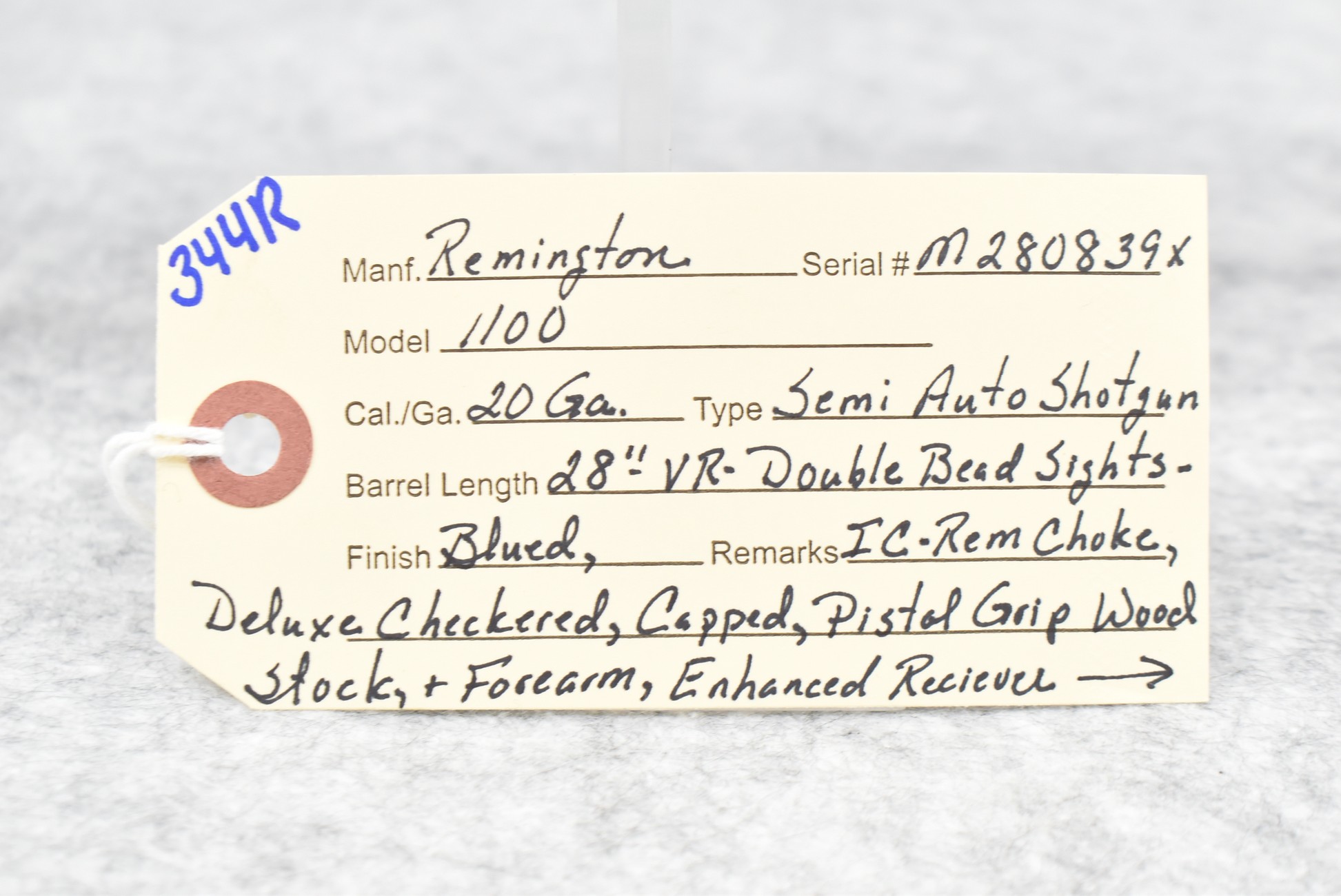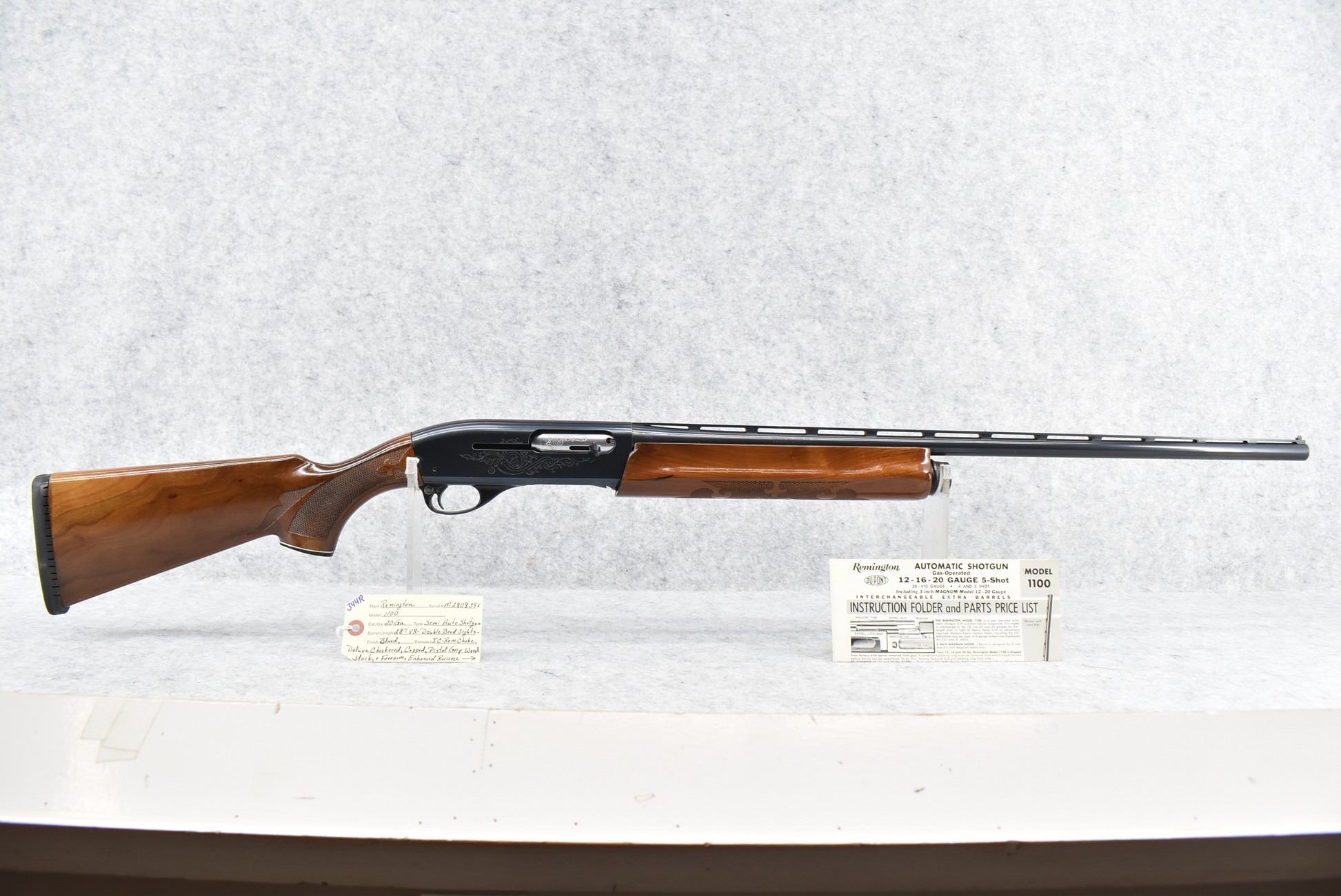 344R. Remington – Mod. 1100 – 20ga. Semi-Auto Shotgun – w/28” Rem. Choked, Vent-Rib Barrel w/Double Bead Sights – Blued Finish – w/Enhanced Receiver on Both Sides – w/Deluxe Checkered Capped Pistol Grip Wood Stocks w/Kick EEZ Butt Pad – Barrel Originally Fixed Full Choke but Now Rem. Choked – w/Factory Manual