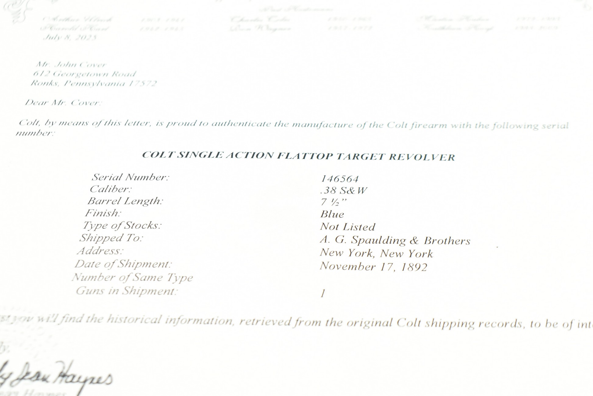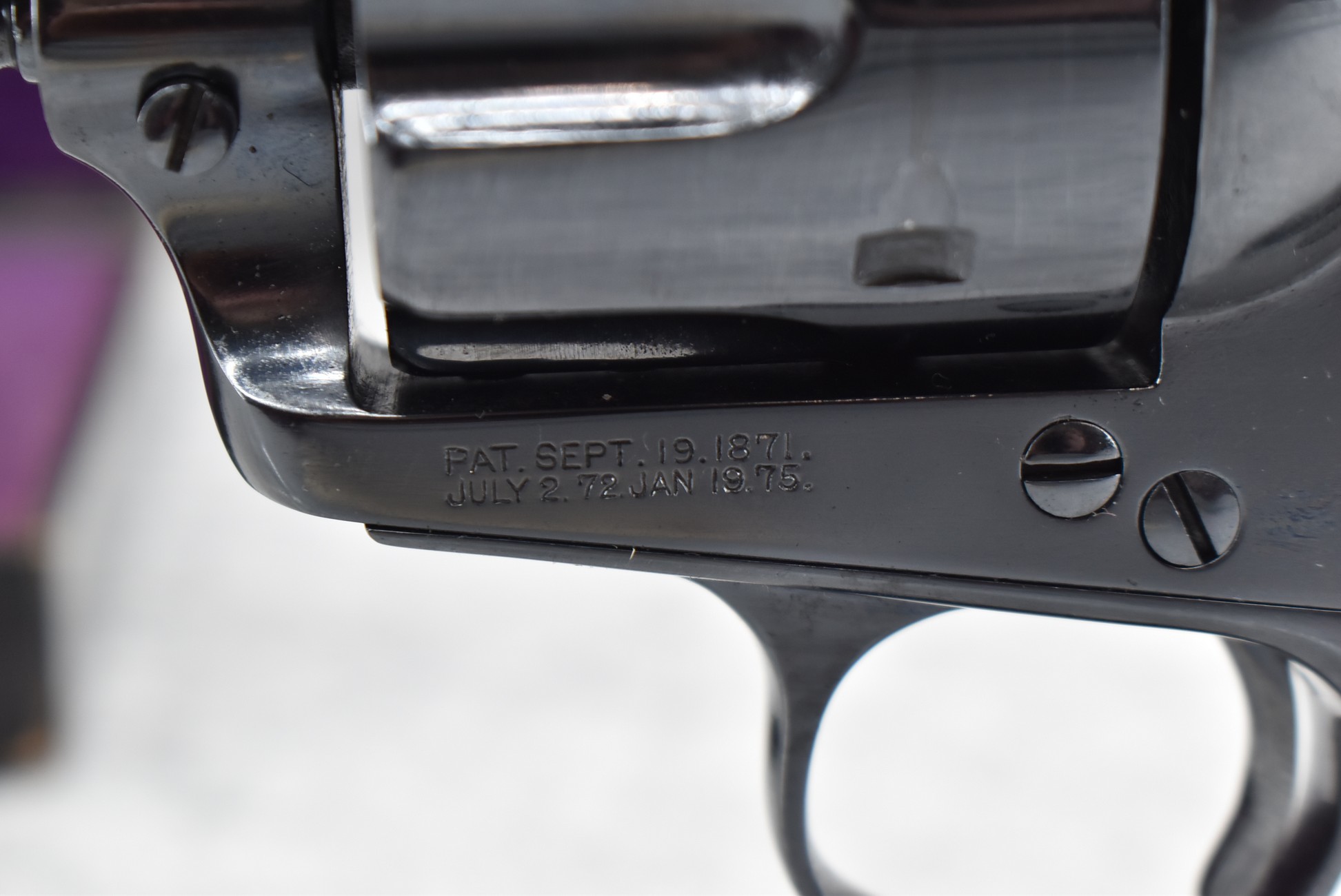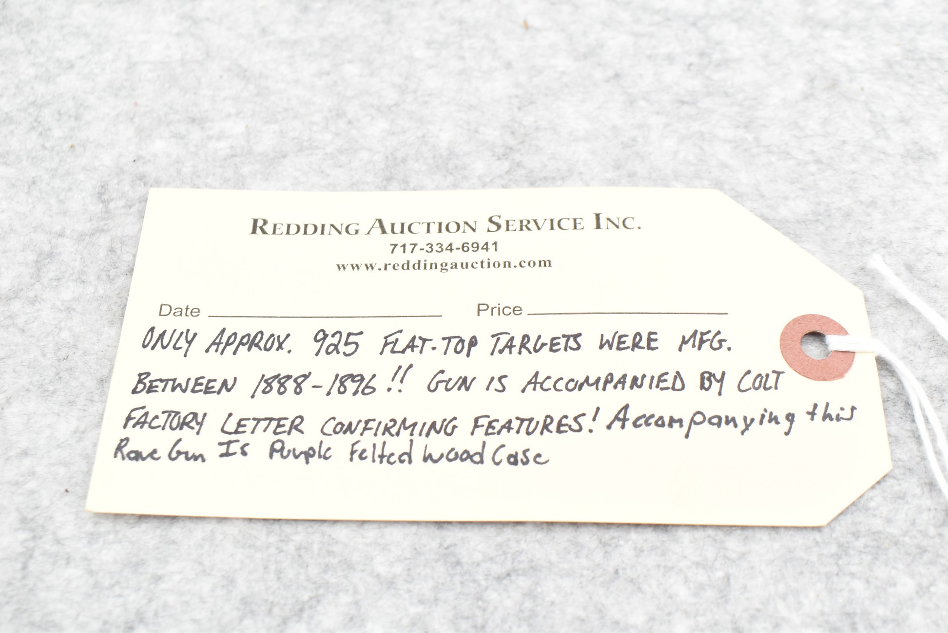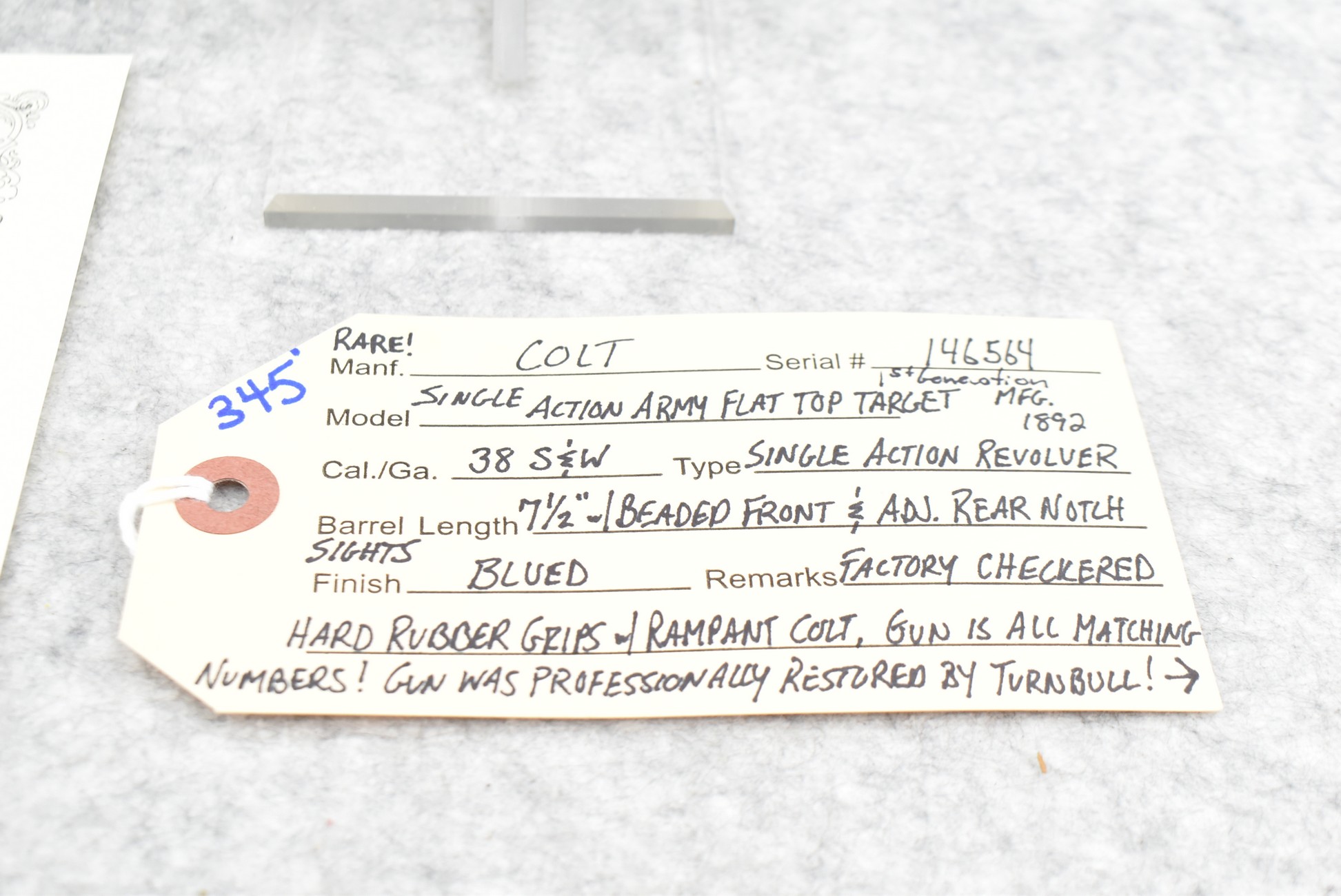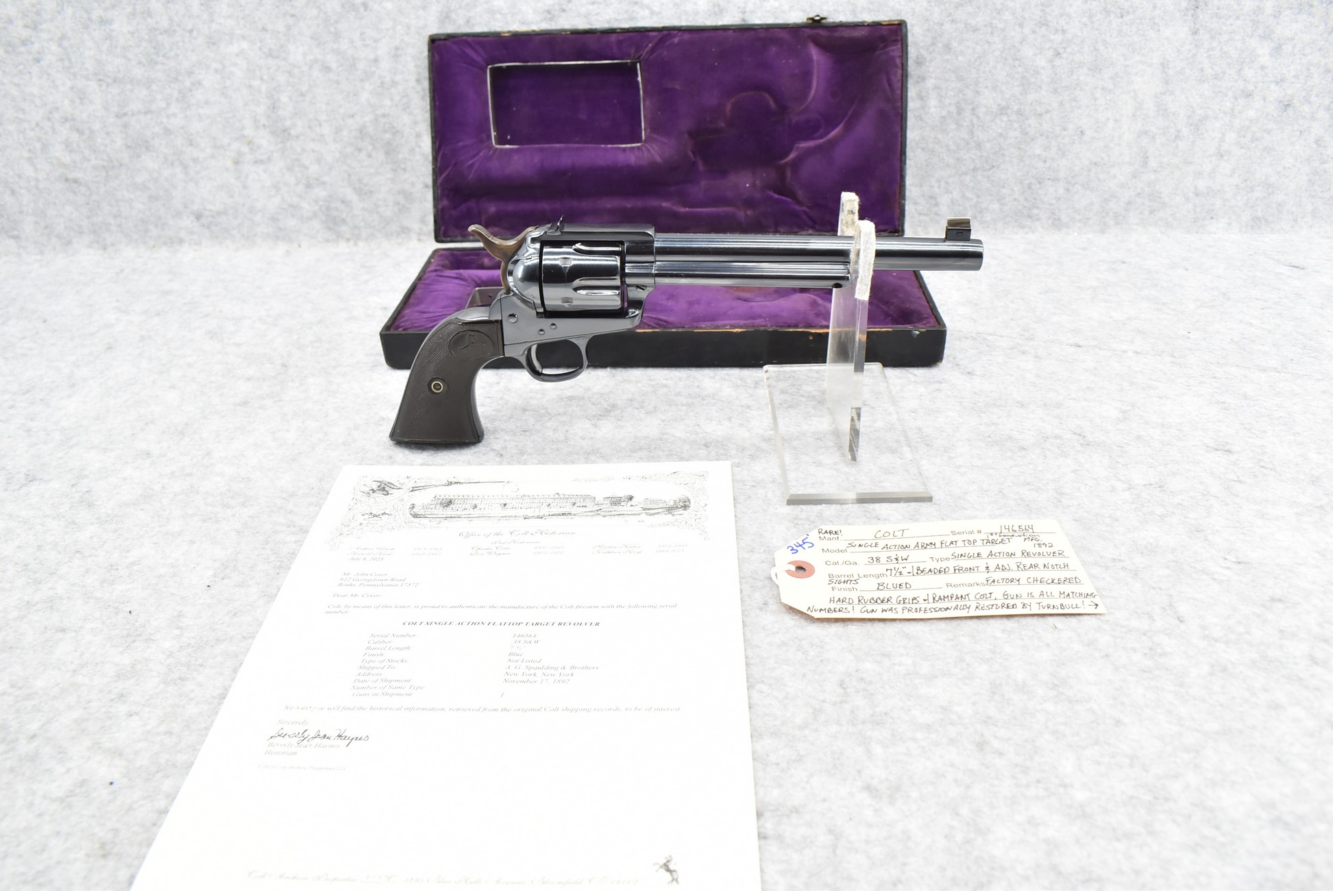 345. Rare! Colt – Mod. Single Action Army Flat Top Target 1st Generation – 38 S&W Cal. Single Action Revolver – w/7½” Barrel w/Beaded Front and Adjustable Rear Notch Sights – Blued Finish – w/Factory Checkered Hard Rubber Grips w/Rampant Colt – Gun is All Matching Numbered! Manufactured 1892 – Gun was Professionally Restored By Turnbull! – Only Approximately 925 Flat-Top Targets were Manufactured Between 1888-1896! – Gun is Accompanied by Colt Factory Letter Confirming Features! – Also Accompanying this Rare Gun is a Purple Felted Wood Case