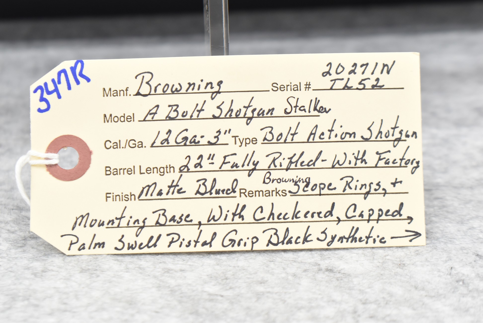 347R. Browning – Mod. A-Bolt Stalker Shotgun – 12ga. 3” Bolt Action Shotgun – w/22” Fully Rifled Barrel – Matte Blued Finish – w/Checkered Capped Palm Swell Pistol Grip Black Synthetic Stock w/Factory Butt Pad – w/Factory Detachable Magazine – w/Factory Browning Scope Rings & Mounting Base – As New w/Factory Box & Manual – Mfg. Between 1995-1998