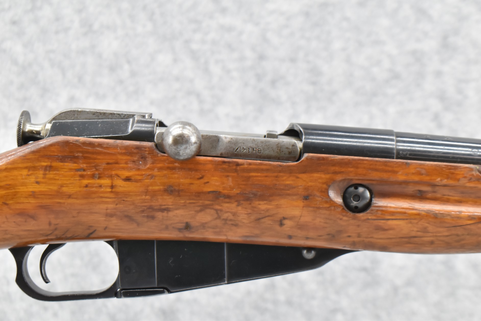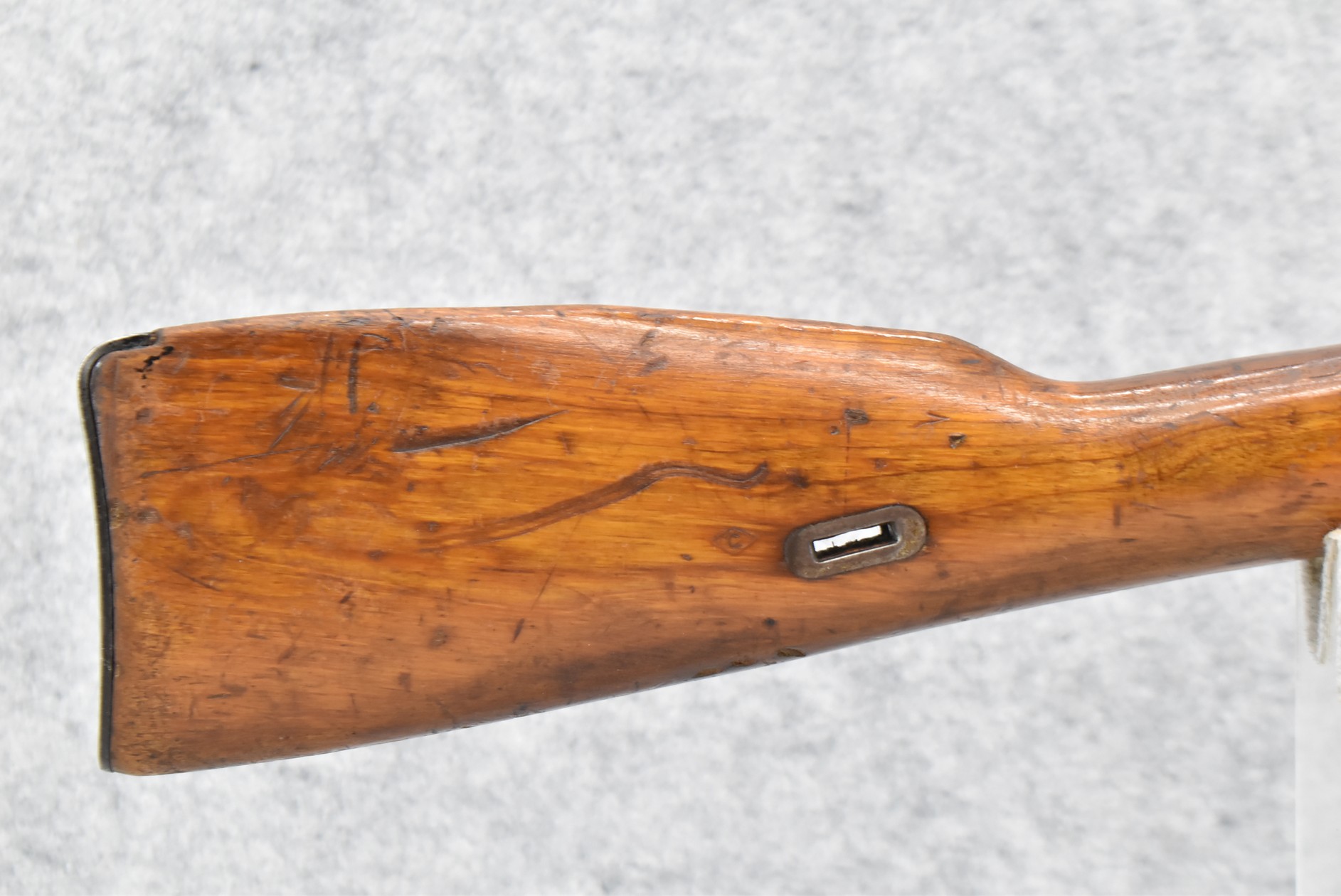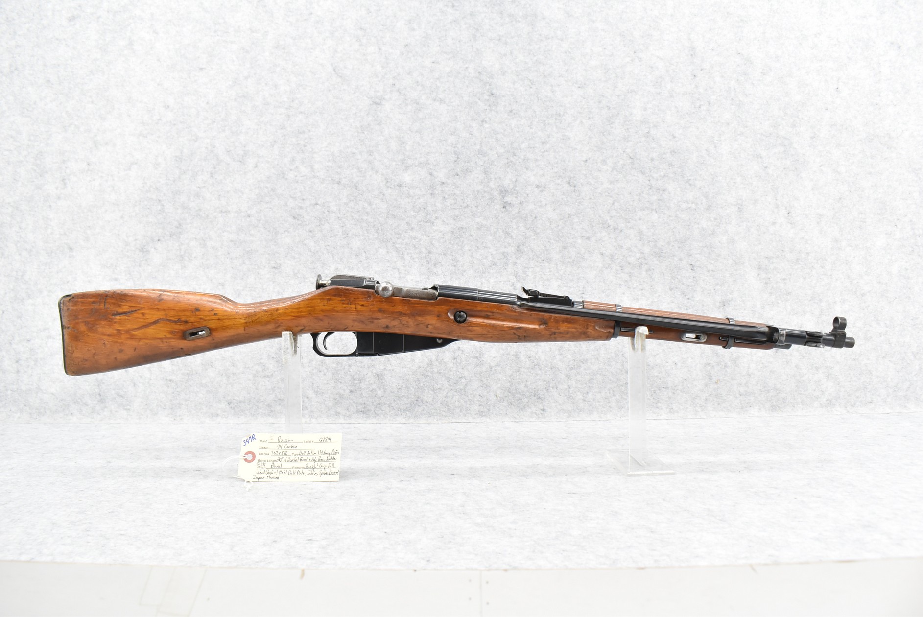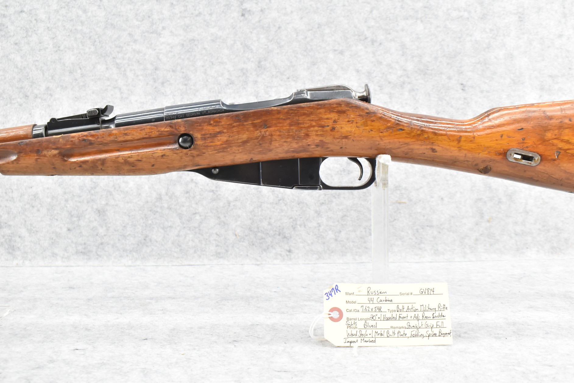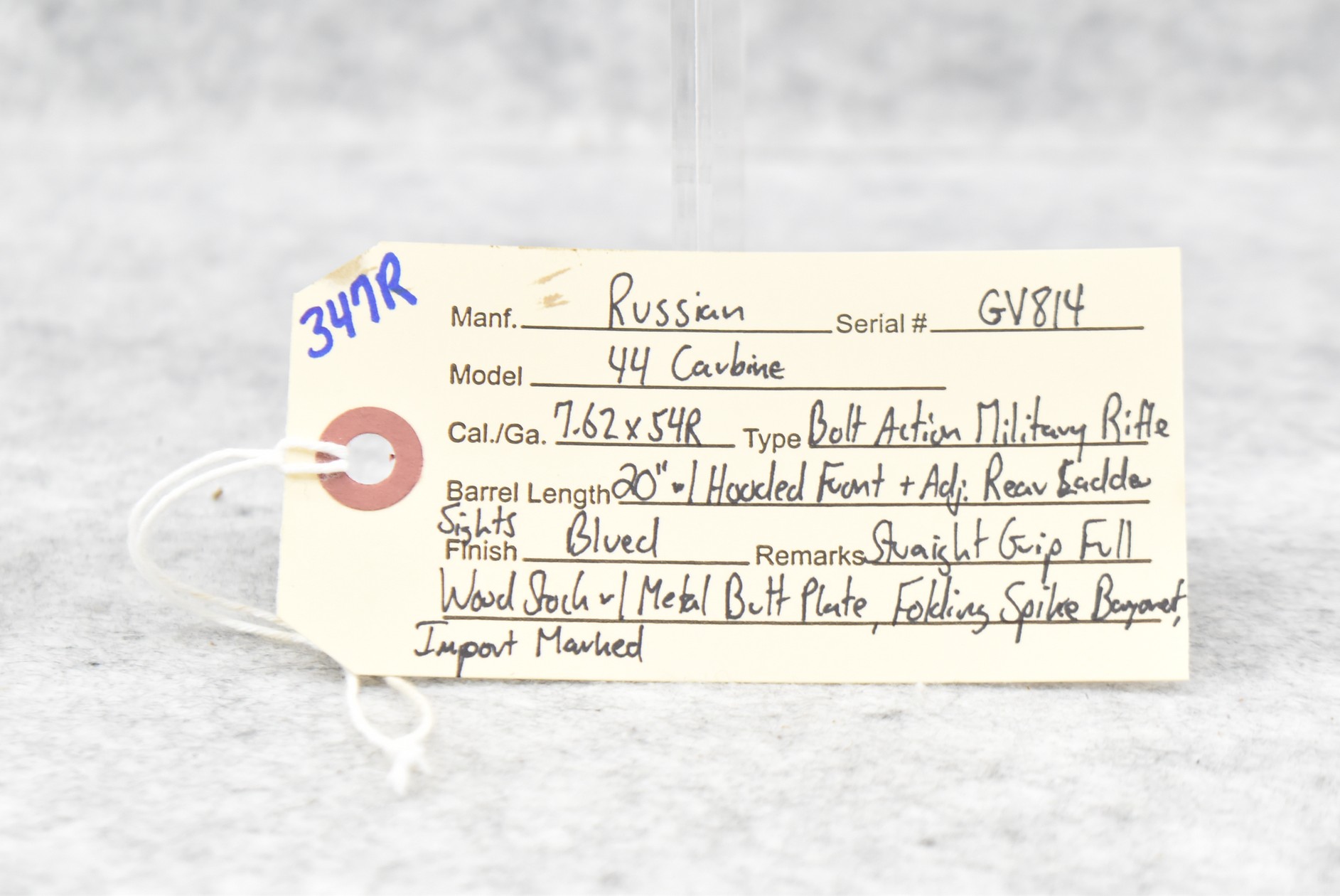 347R. Russian – Mod. 44 Carbine – 7.62x54R Cal. Bolt Action Military Rifle – w/20” Barrel w/Hooded Front & Adj. Rear Ladder Sights – Blued Finish – w/Straight Grip Full Wood Stock w/Metal Butt Plate – w/Folding Spike Bayonet – Import Marked