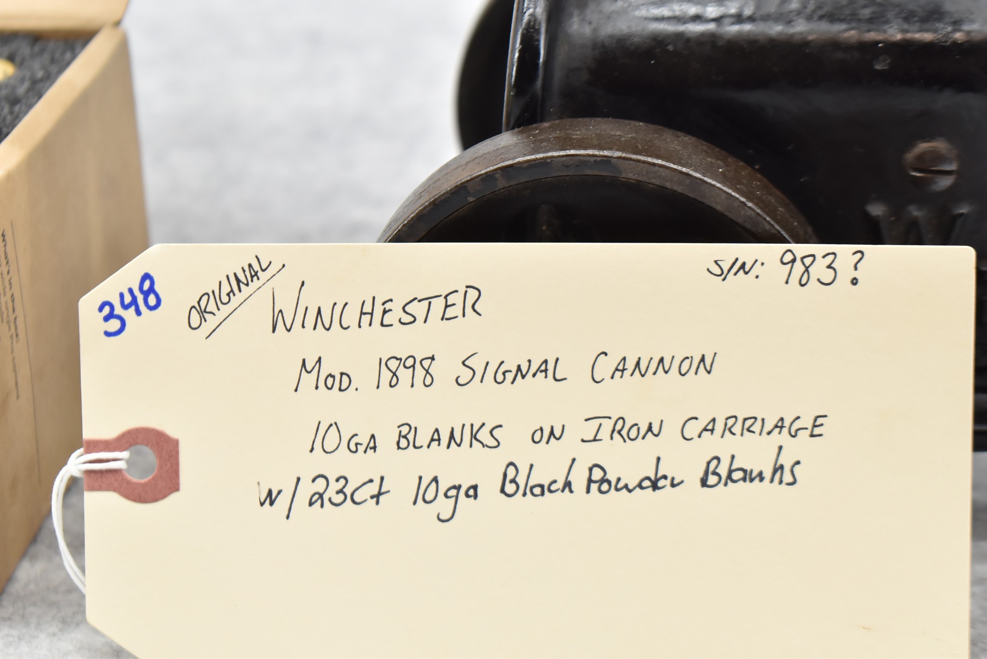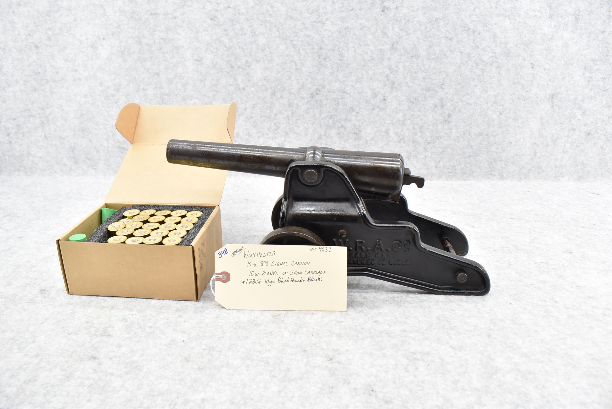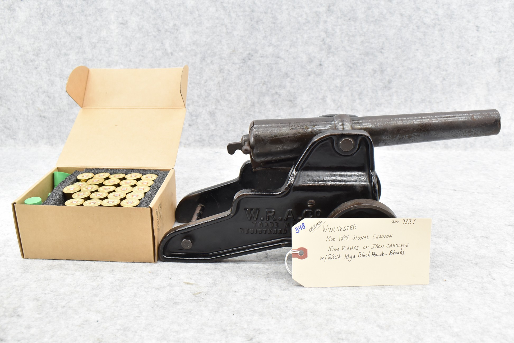 348. Original! Winchester – Mod. 1898 10ga. Signal Cannon on Iron Carriage – w/23-Count 10ga. Black Powder Blanks – w/Family History