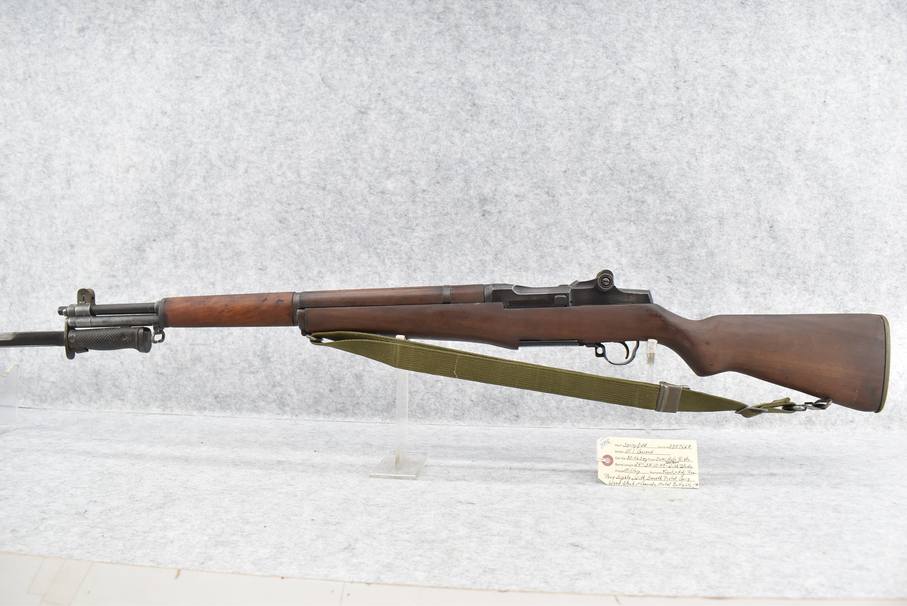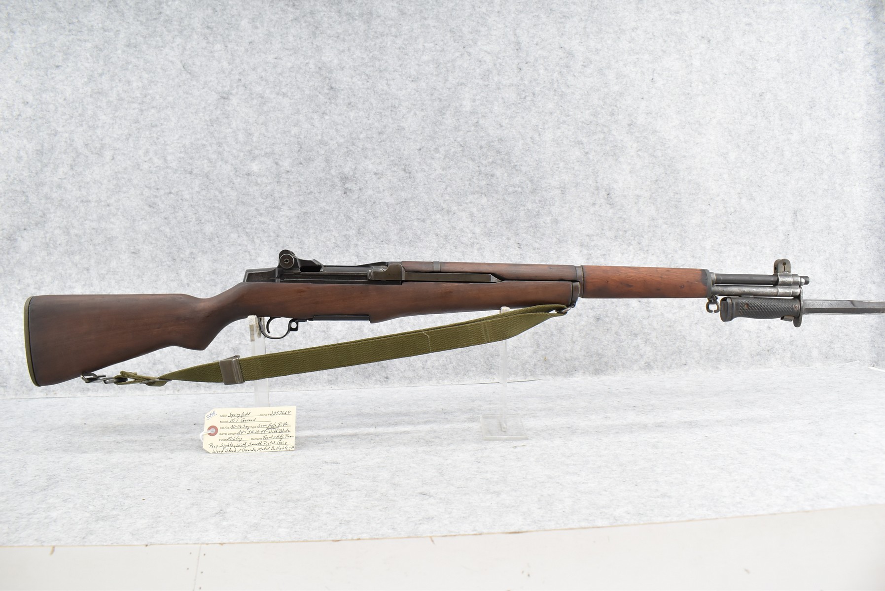 349R. Springfield – Mod. M1 Garand – 30-06 Cal. Semi-Auto Rifle – w/24” SA 10-49 Dated Barrel w/Blade Front & Adj. Rear Peep Sights – Military Finish – w/Smooth Pistol Grip Wood Stocks w/Metal Butt Plate – w/Military Sling – w/M1 Carbine Bayonet