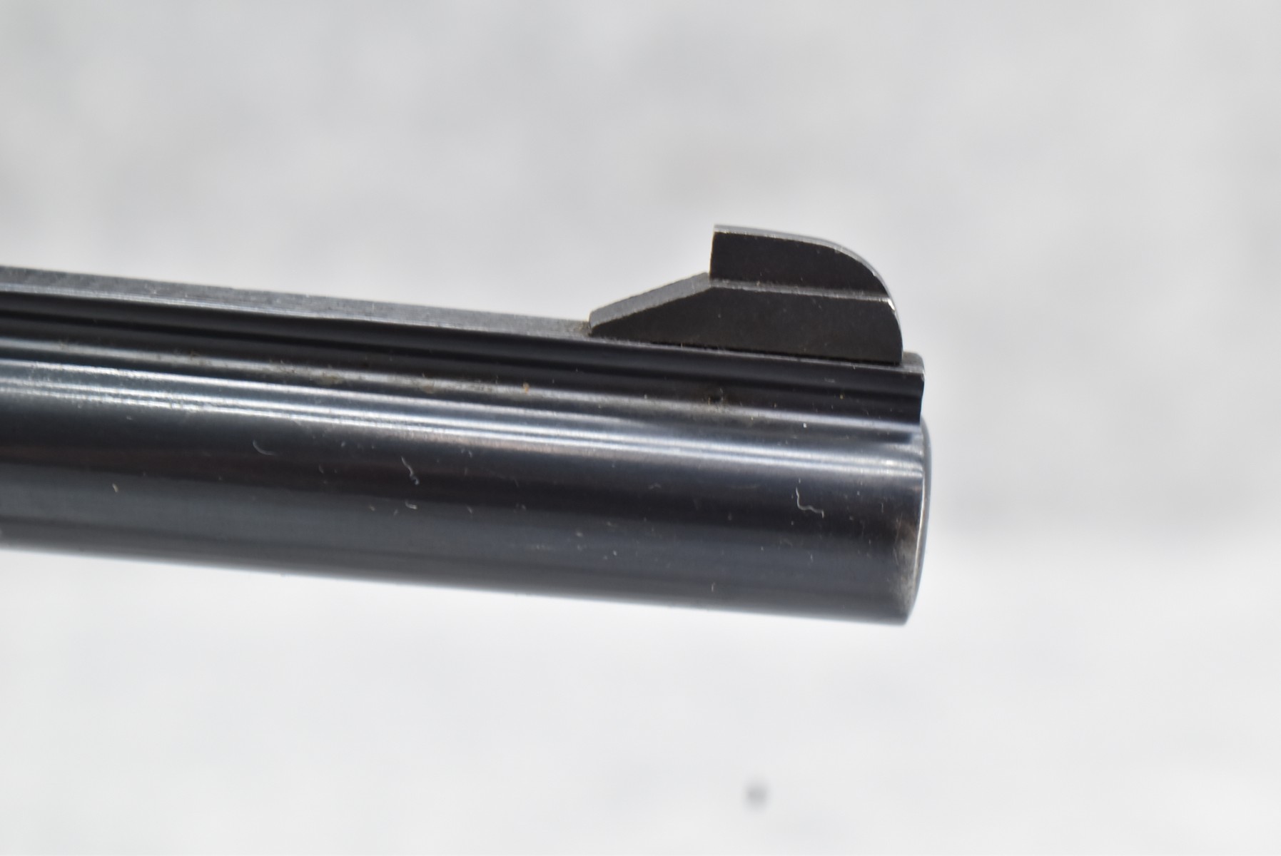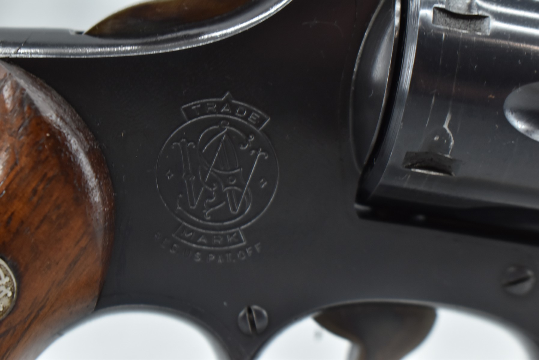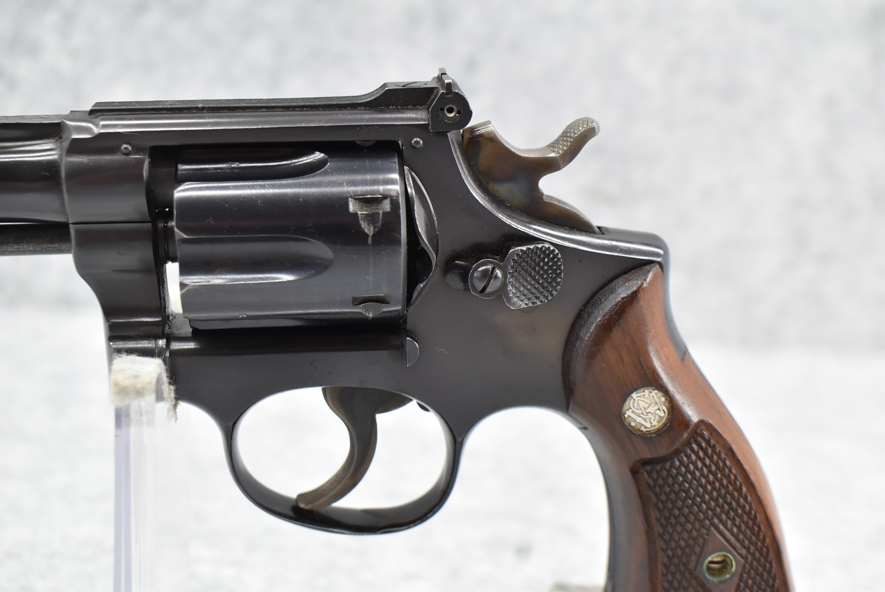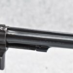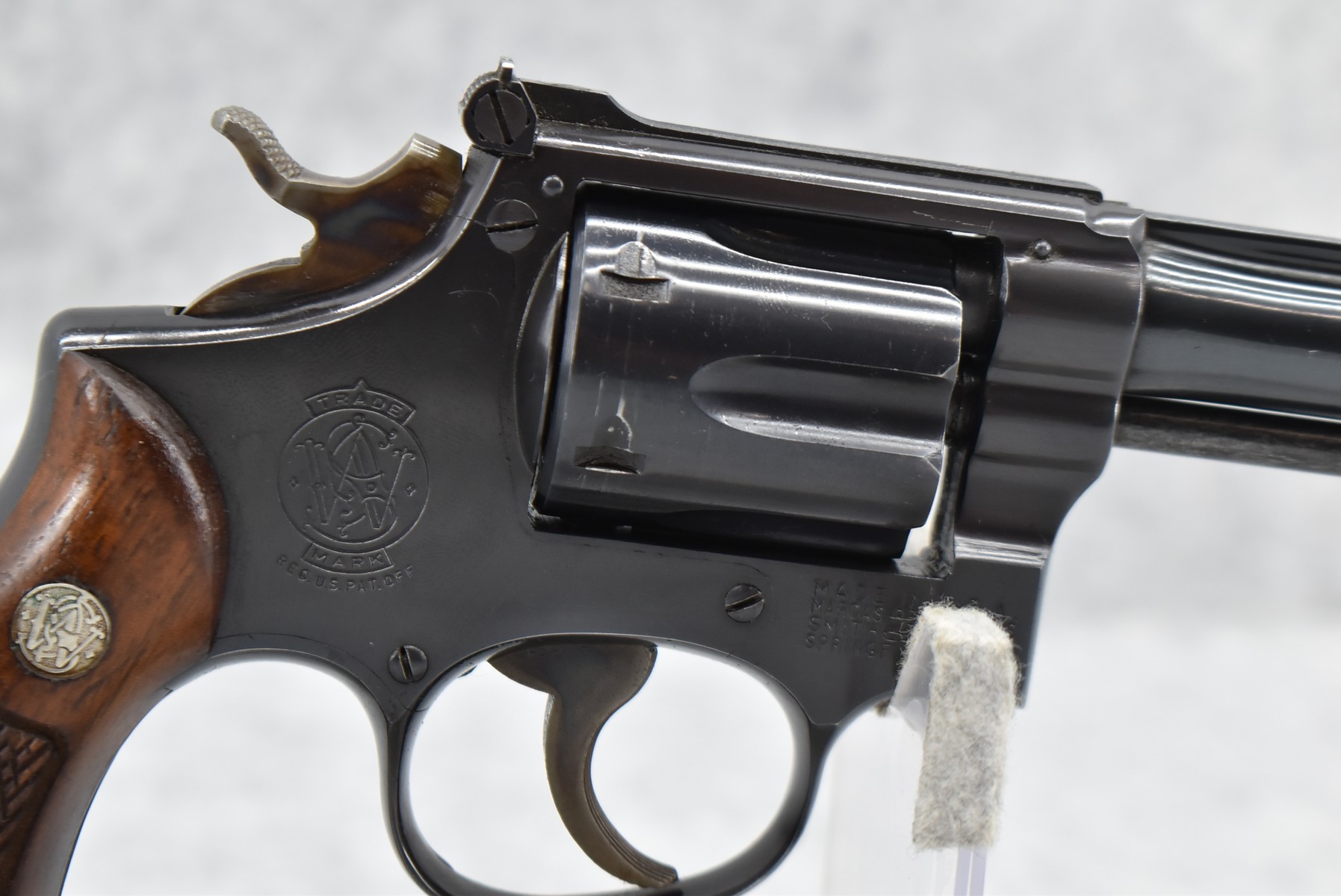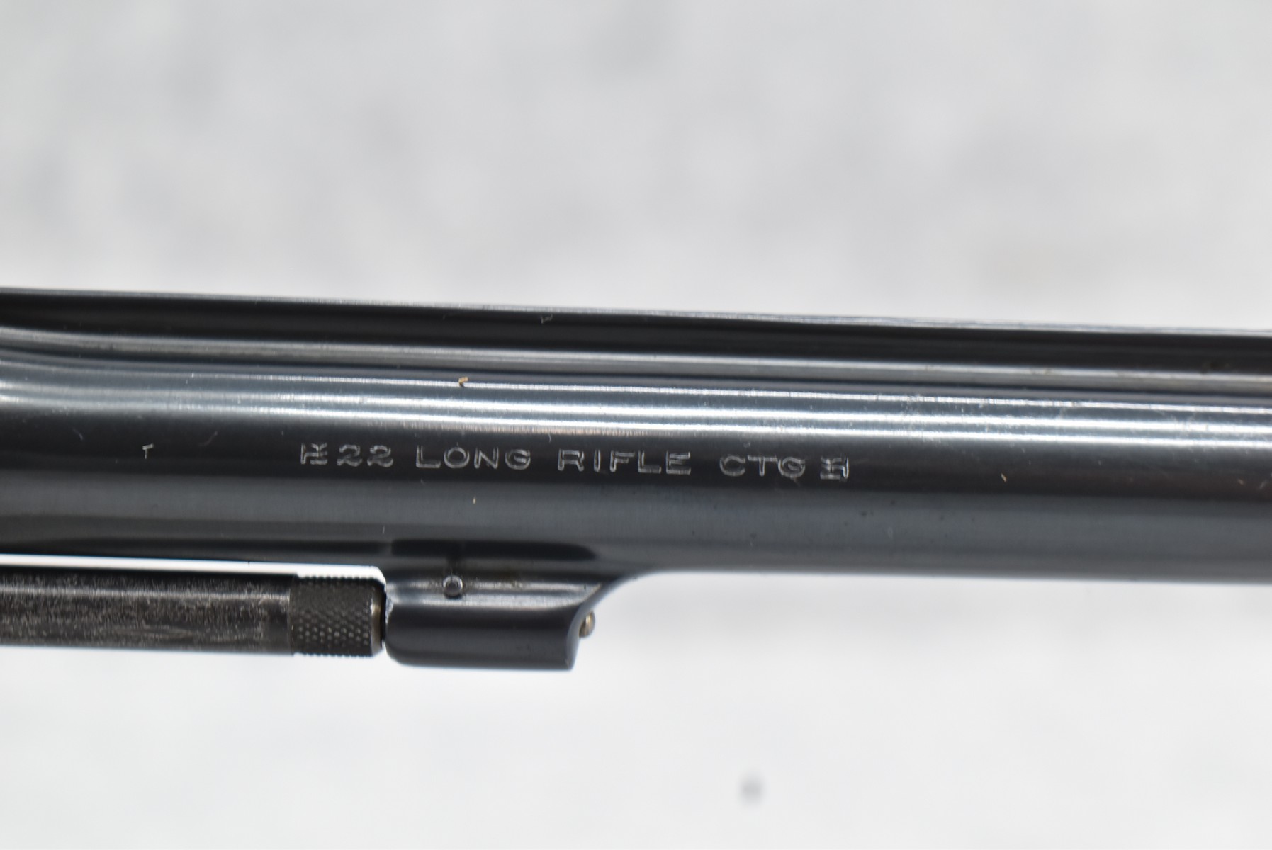 34R. Smith & Wesson – Mod. K-22 Masterpiece (Post-War) Pre-Model 17 (3rd Model) – 22 Long Rifle Cal. Double Action Revolver – w/6” Serrated Tip Rib Barrel w/Pinned Blade Front & Adj. Rear Sights – Blued Finish – w/Factory Diamond Checkered Wood Grips w/S&W Medallion – Cylinder, Underside of Barrel & Serial Number All Match – Grips Number to the Gun!