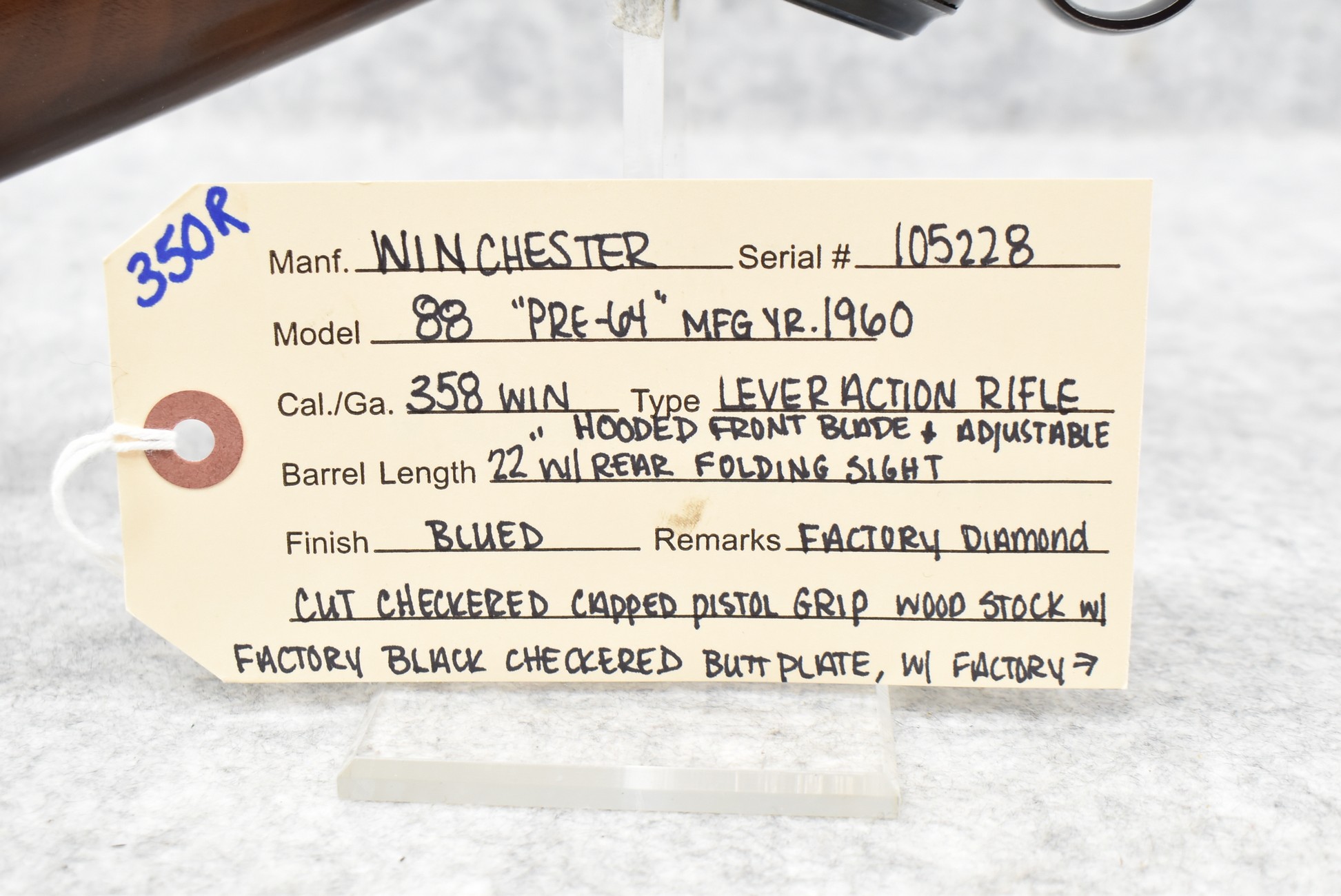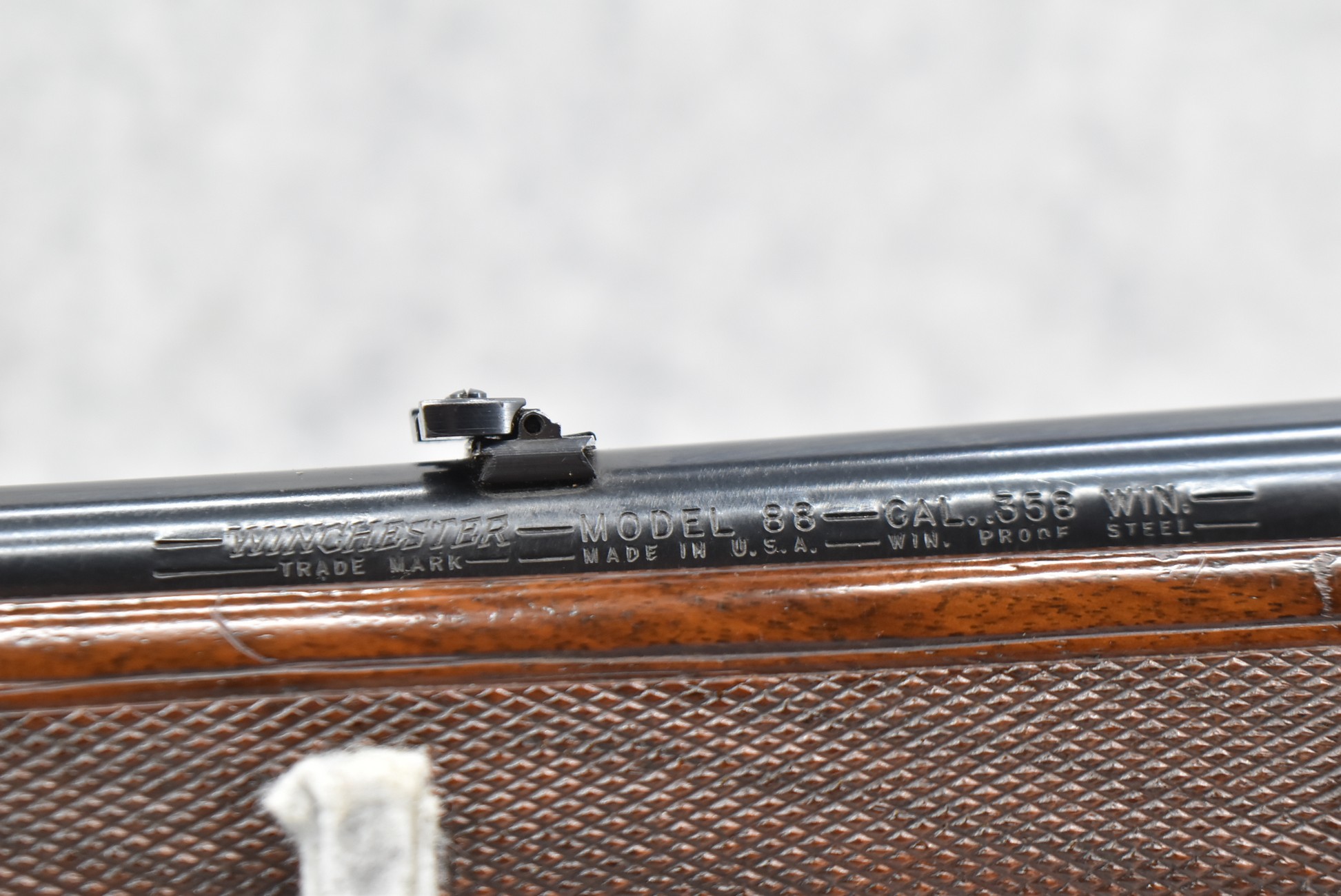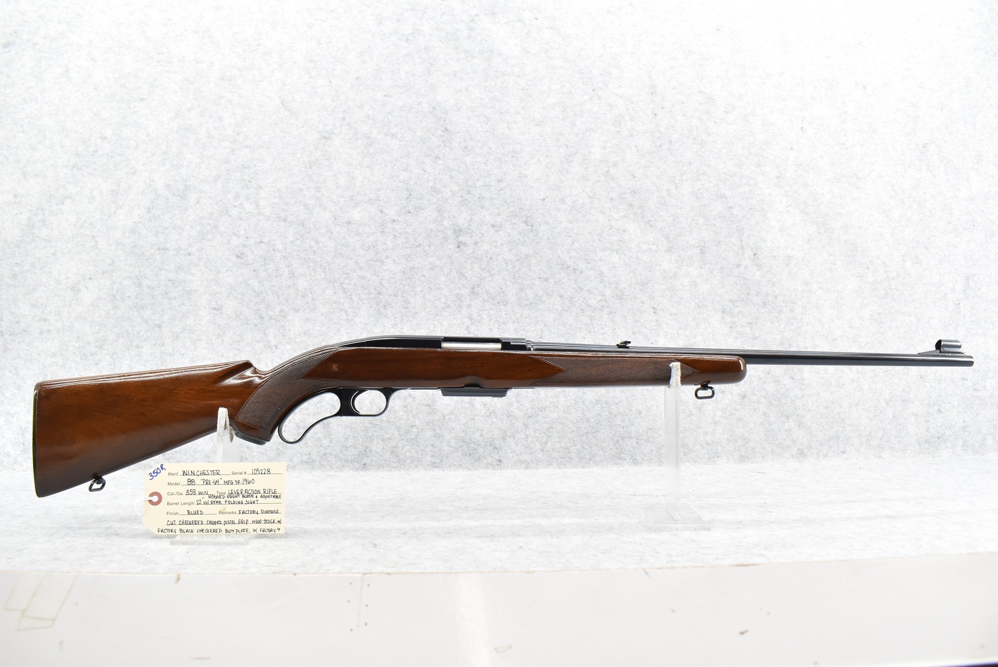 350R. Winchester – Mod. 88 “Pre-64” – 358 Win. Cal. Lever Action Rifle – w/22” Barrel w/Hooded Blade Front and Adjustable Rear Folding Sights – Blued Finish – w/Factory Diamond Cut Checkered Capped Pistol Grip Wood Stock w/Factory Black Checkered Butt Plate – w/Factory Winchester Detachable Magazine – w/Factory Sling Swivels – Manufactured 1960