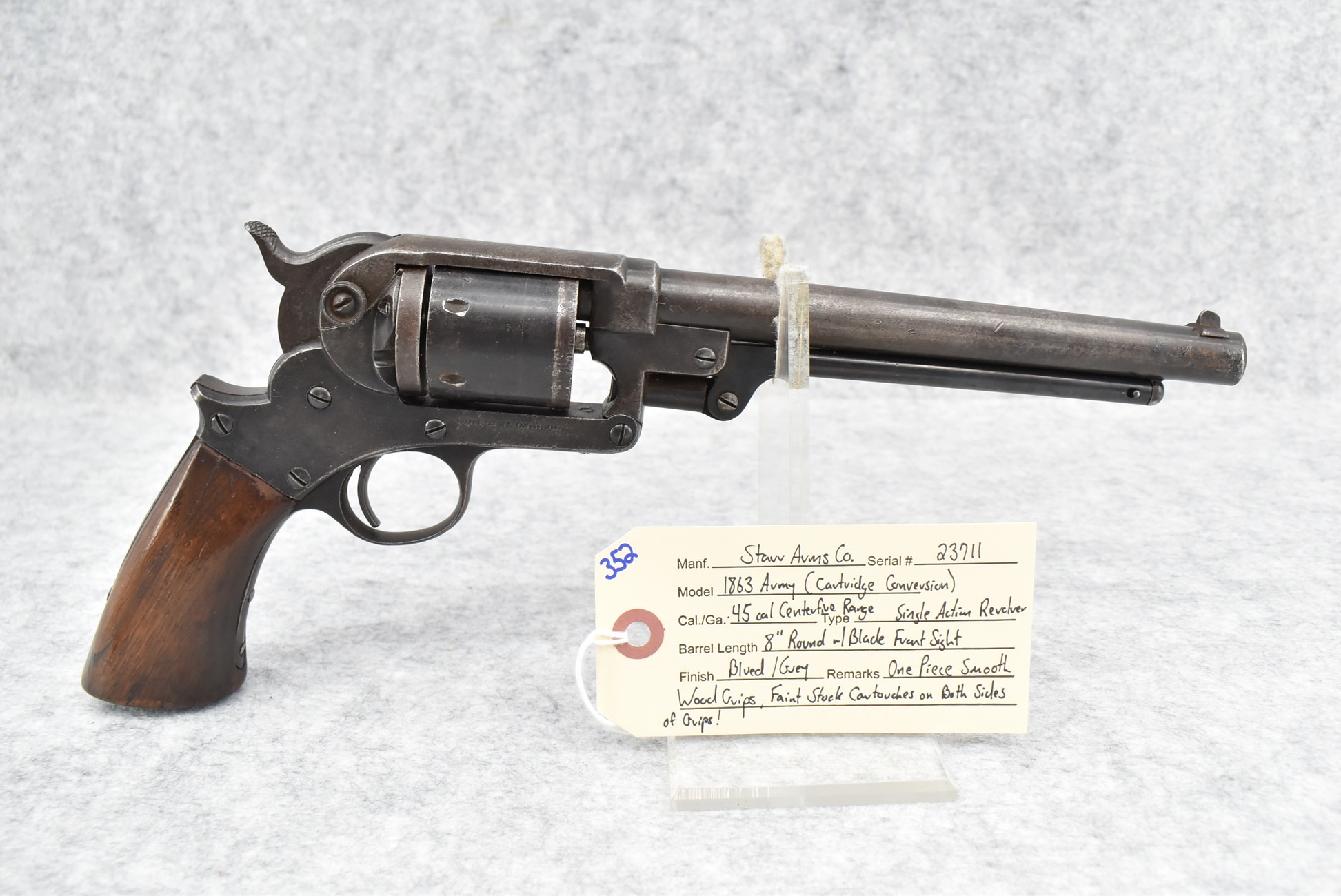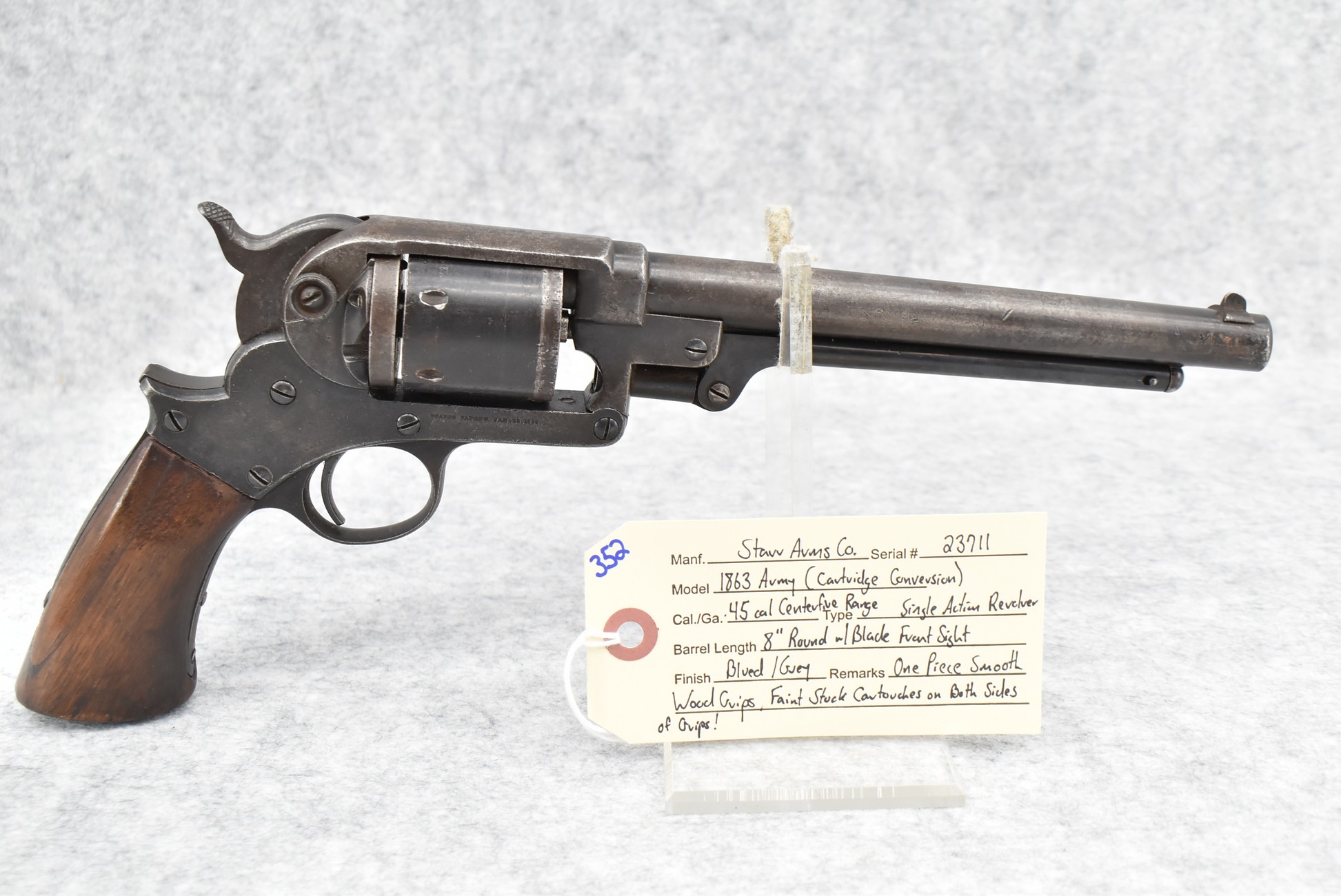 352. Starr Arms Co. – Mod. 1863 Army (Cartridge Conversion) – 45 Cal. CF Range Single Action Revolver – w/8” Round Barrel w/Blade Front Sight – Blued/Gray Finish – w/1pc. Smooth Wood Grips