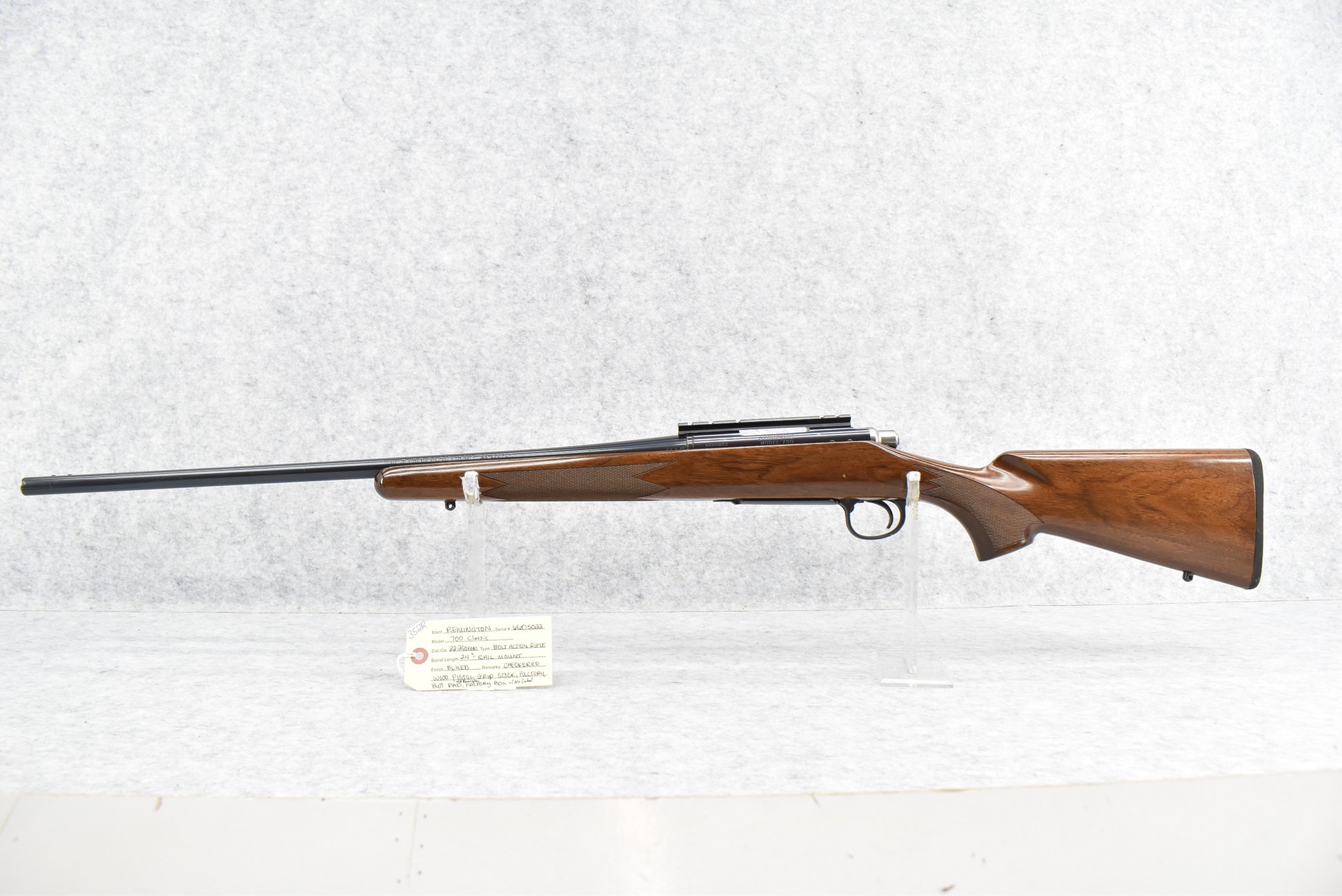 352R. Remington – Mod. 700 Classic – 22-250 Rem. Cal. Bolt Action Rifle – w/24” Barrel – Blued Finish – w/Checkered Pistol Grip Wood Stock w/Factory Butt Pad – w/Rail Mount – w/A Remington Factory Box w/No Label – 22-250 Rem. Was a Caliber That Was in the Original Run in 1978 When the 700 Classic Was Introduced!
