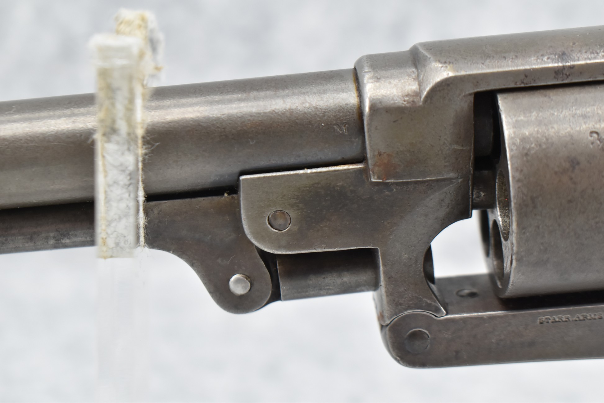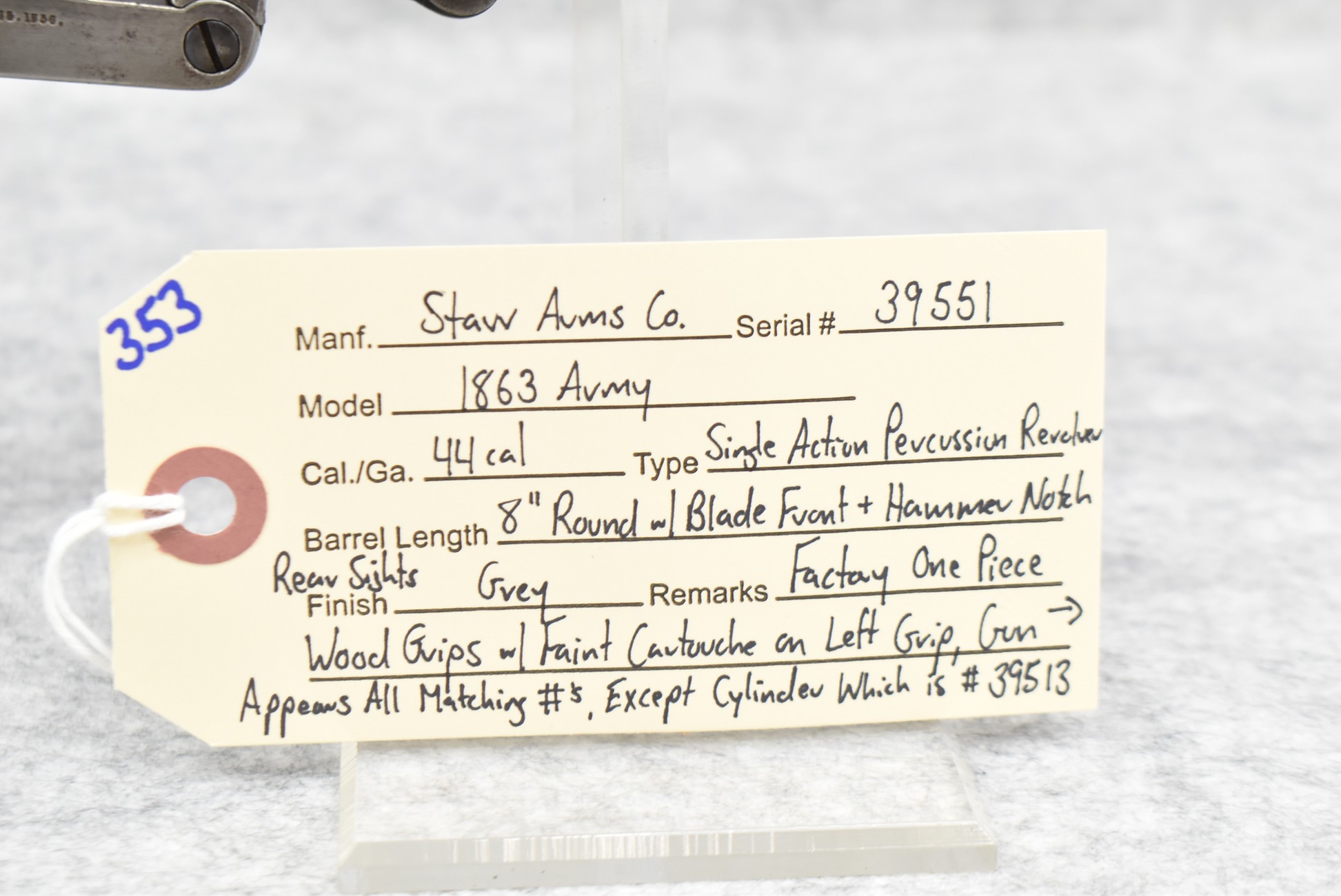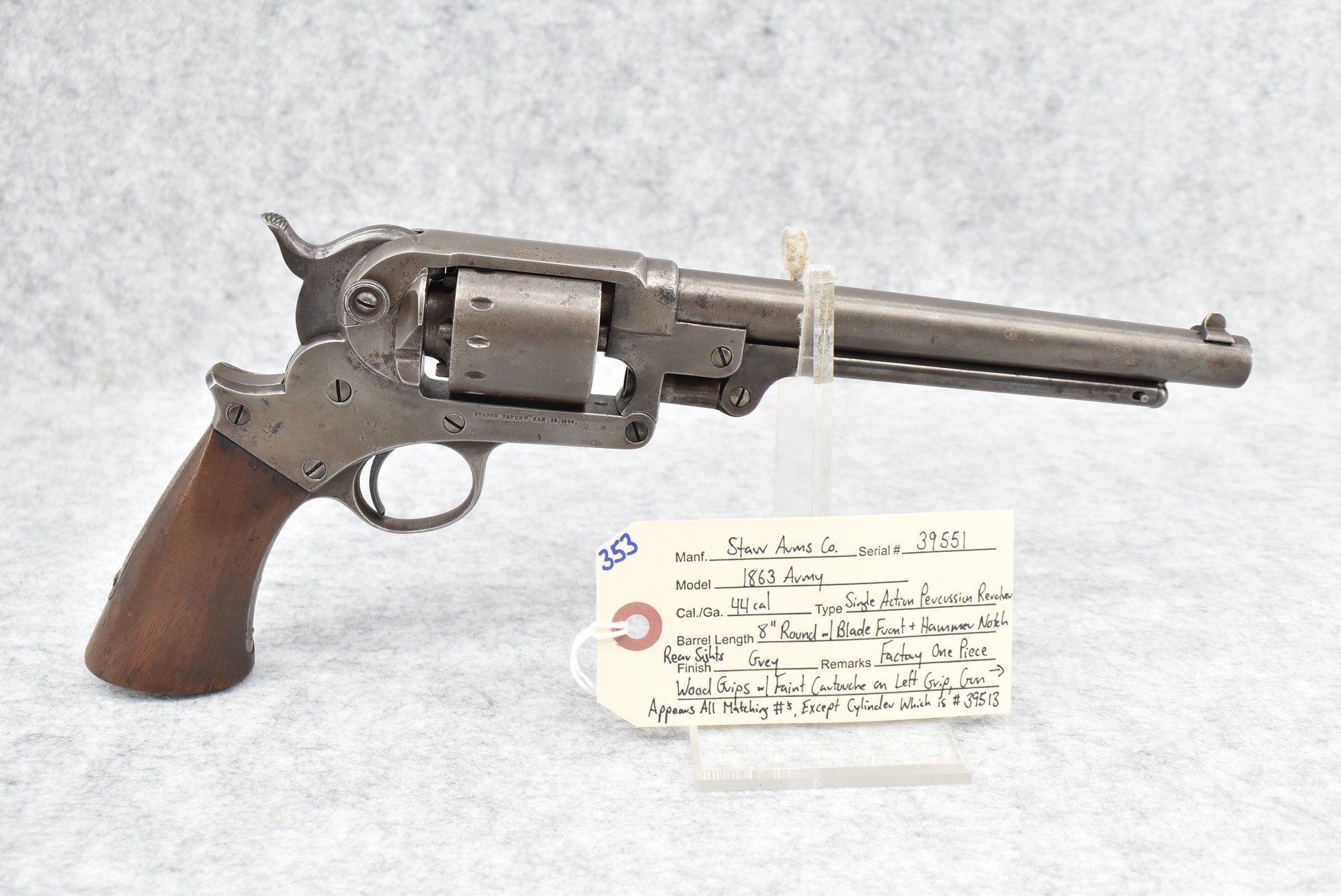 353. Starr Arms Co. – Mod. 1863 Army – 44 Cal. Percussion Single Action Revolver – w/8” Round Barrel w/Blade Front & Hammer Notch Rear Sights – Gray Finish – w/Factory 1pc. Wood Grips w/Faint Cartouche on Left Grip – Gun Appears All Matching Numbers (39551) Except the Cylinder Which is #39513