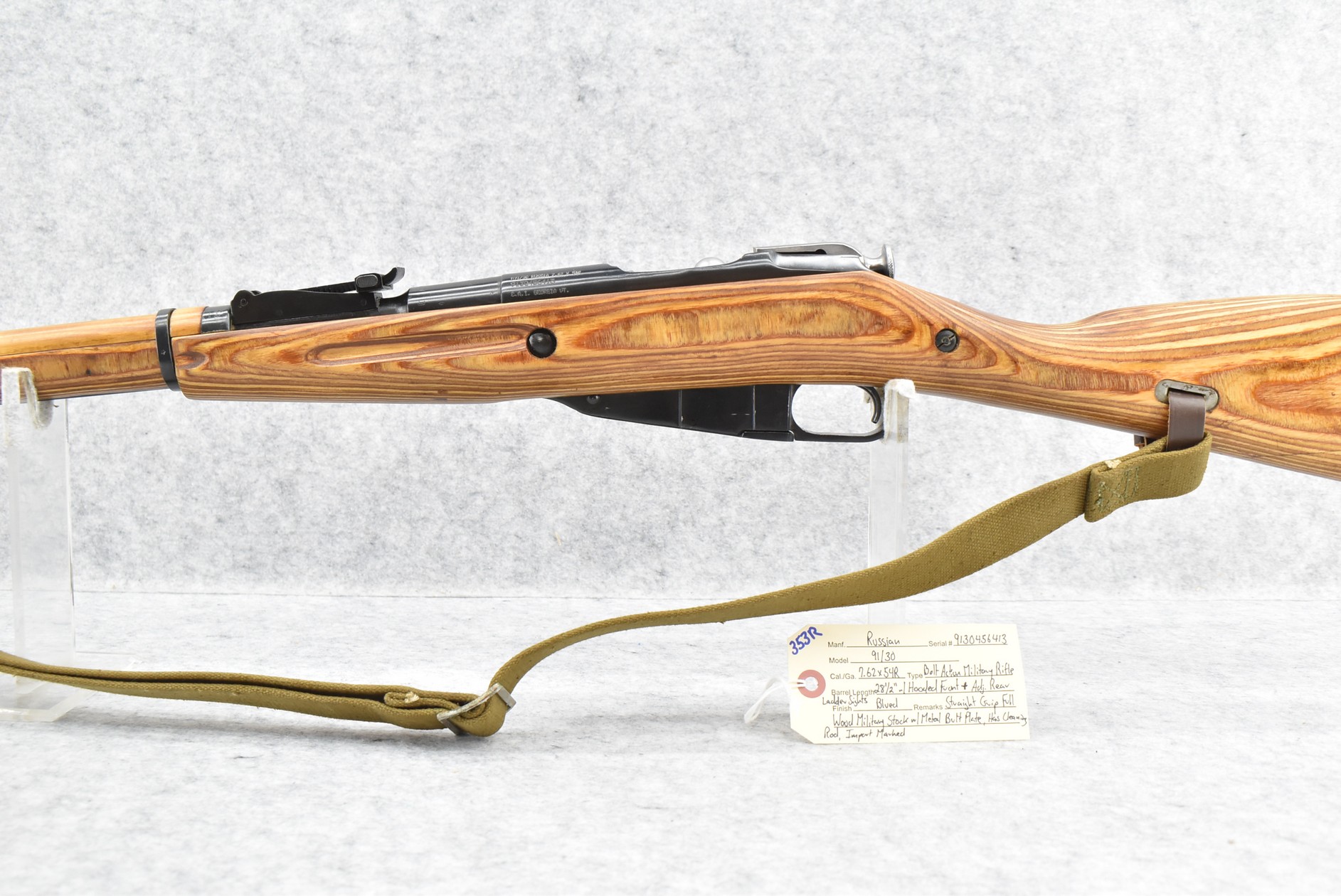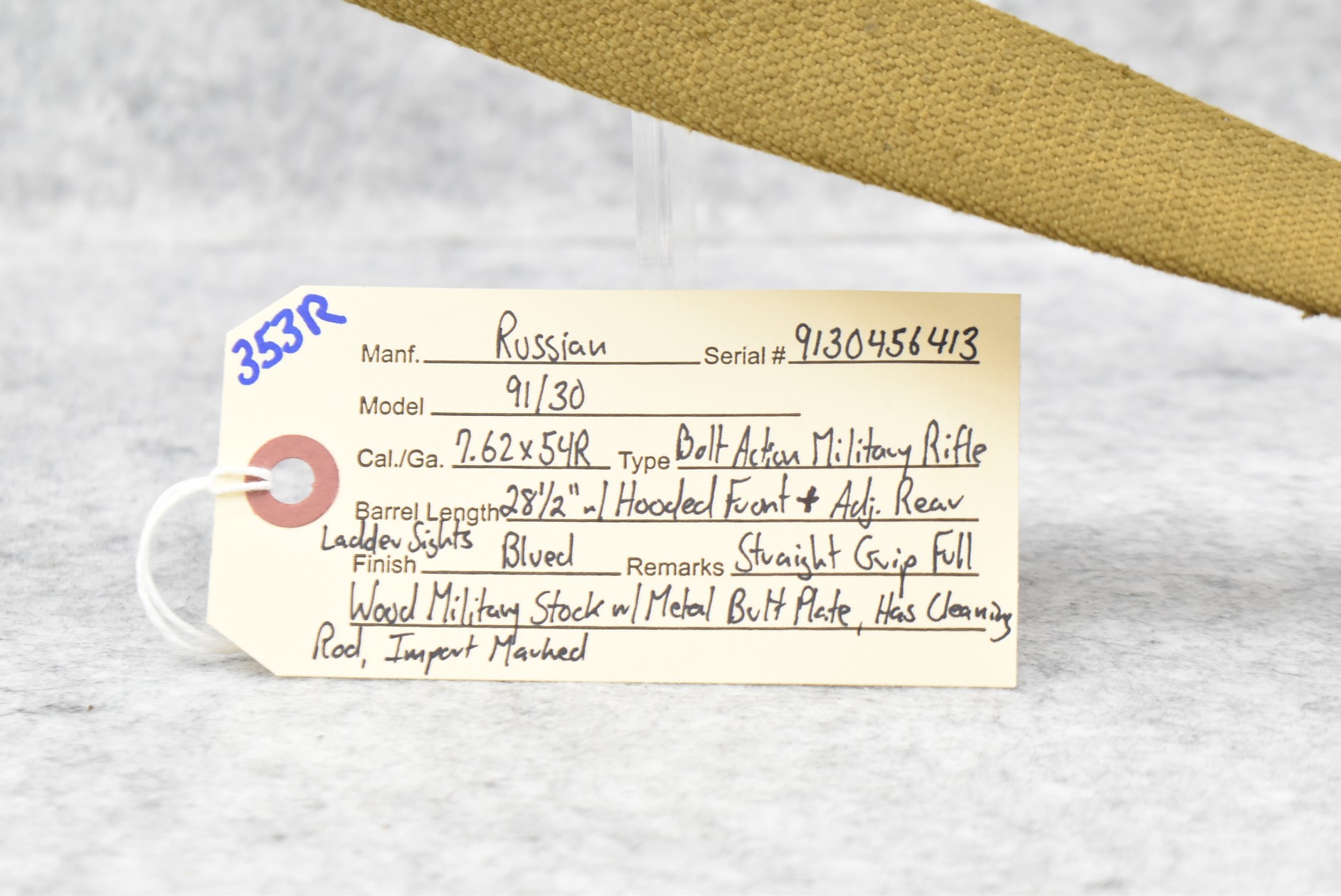 353R. Russian – Mod. 91/30 – 7.62x54R Cal. Bolt Action Military Rifle – w/28 ½” Barrel w/Hooded Front & Adj. Rear Ladder Sights – Blued Finish – w/Straight Grip Full Wood Military Stock w/Metal Butt Plate – w/Cleaning Rod – Import Marked