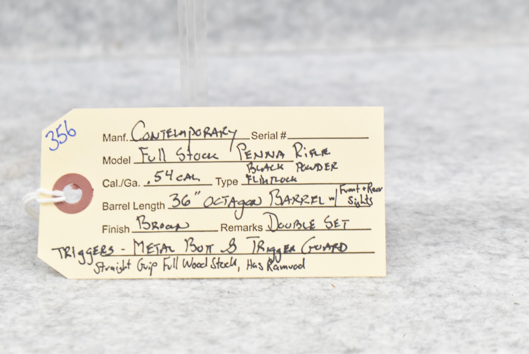 356. Contemporary – Mod. Full Stock PA Rifle – 54 Cal. Black Powder Flintlock Rifle – w/36” Octagon Barrel w/Front & Rear Sights – Brown Finish – w/Straight Grip Full Wood Stock w/Metal Butt Plate & Trigger Guard – w/Double Set Triggers – w/Ram Rod