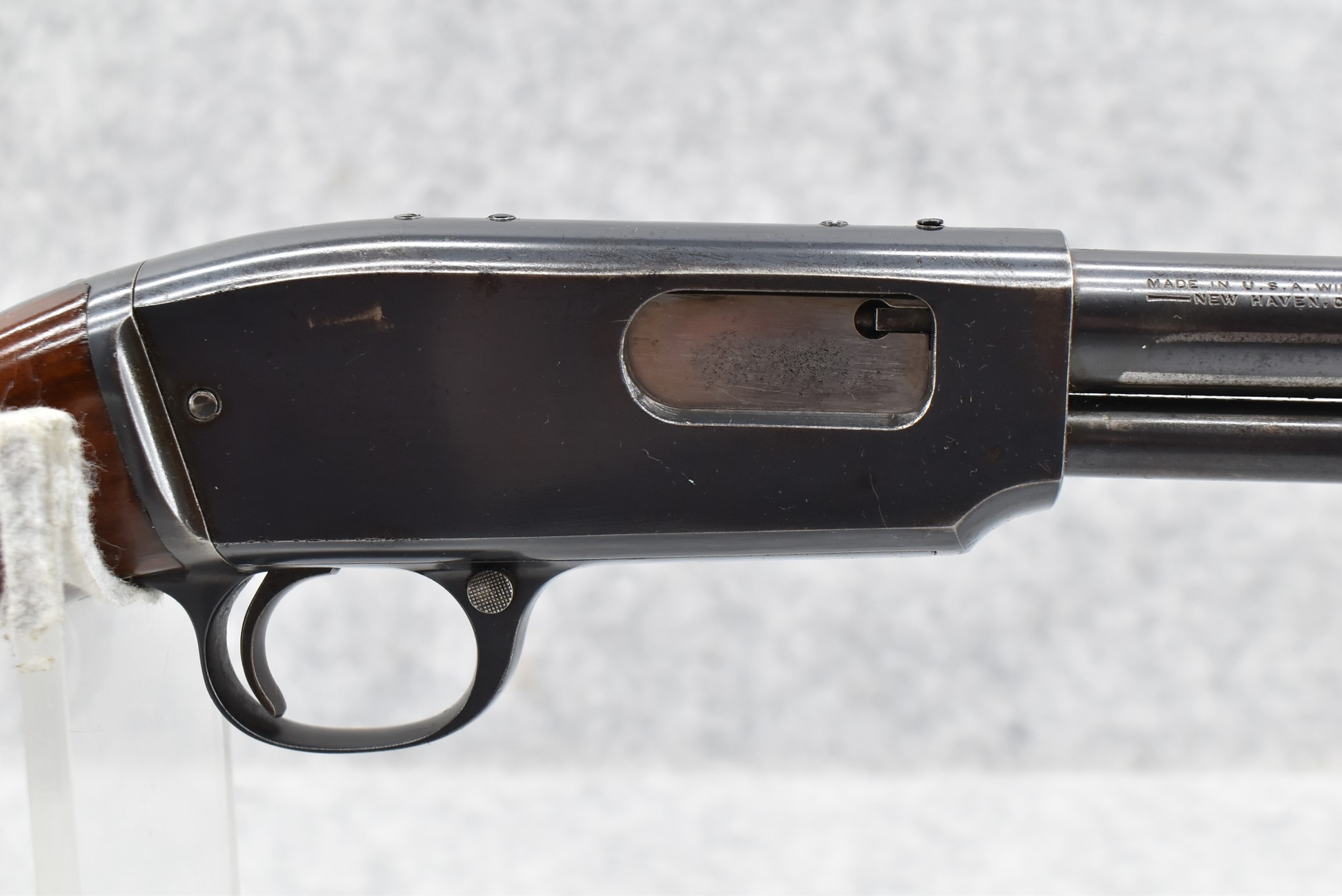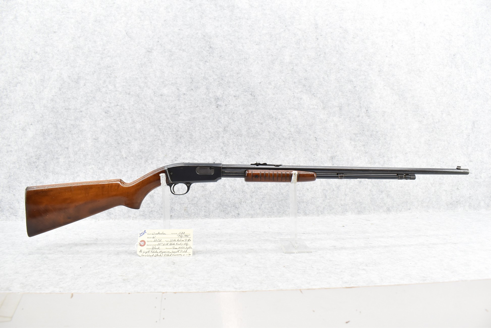 356R. Winchester – Mod. 61 – 22 Cal. Pump Action Rifle – w/24” Barrel w/Blade Front and Adjustable Rear Notch Sights – Blued Finish – w/Smooth Pistol Grip Wood Stock and Ribbed Forearm w/Checkered Metal Butt Plate – w/¾ Length Tubular Magazine – w/Tapped Top of Receiver – Manufactured 1932