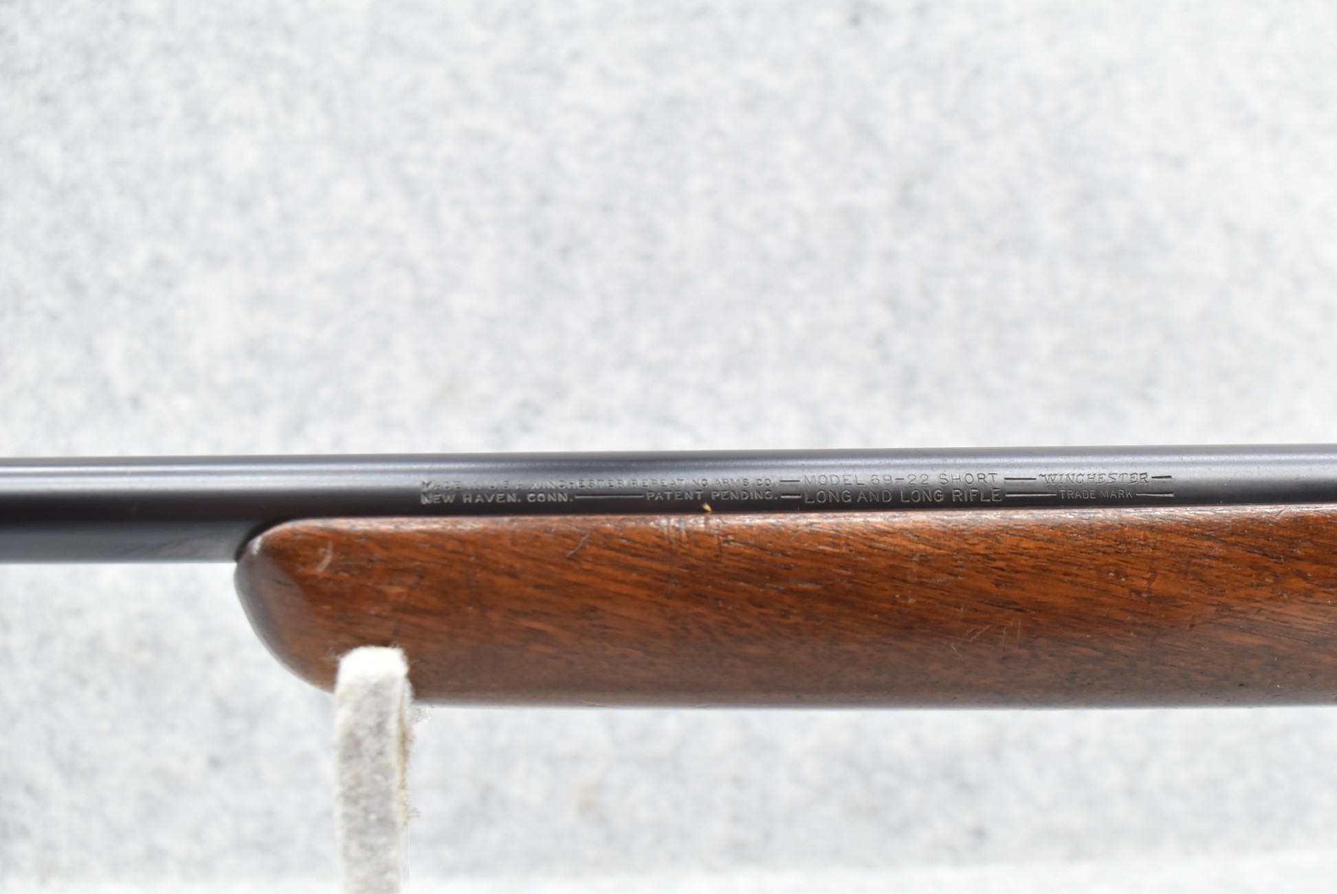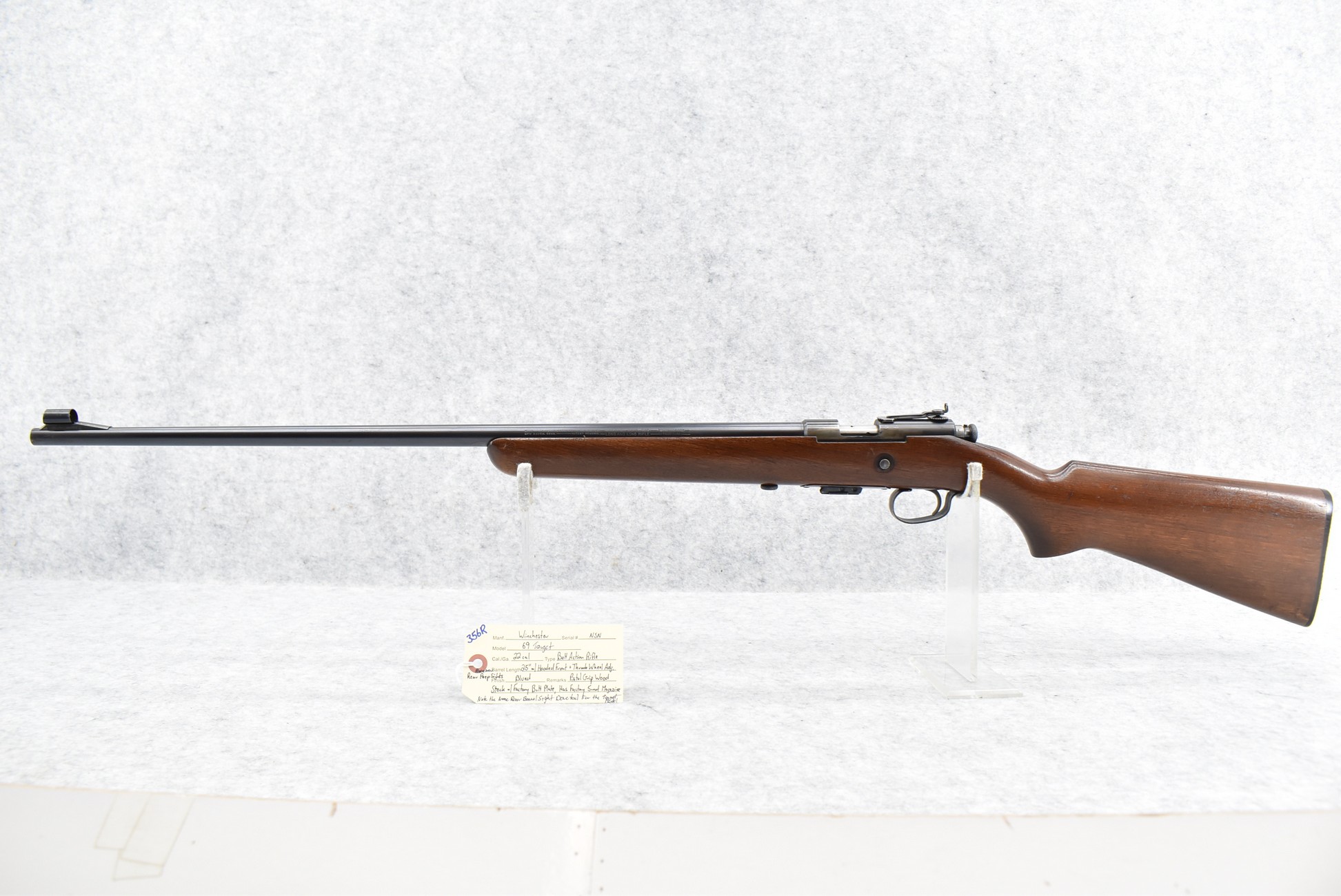 356R. Winchester – Mod. 69 Target – 22 Cal. Bolt Action Rifle – w/25” Barrel w/Hooded Front & Thumb Wheel Adj. Receiver Rear Peep Sights – Blued Finish – w/Pistol Grip Wood Stock w/Factory Butt Plate – w/Factory 5Rd Magazine – Note: No Rear Barrel Sight Dovetail for the Target Model
