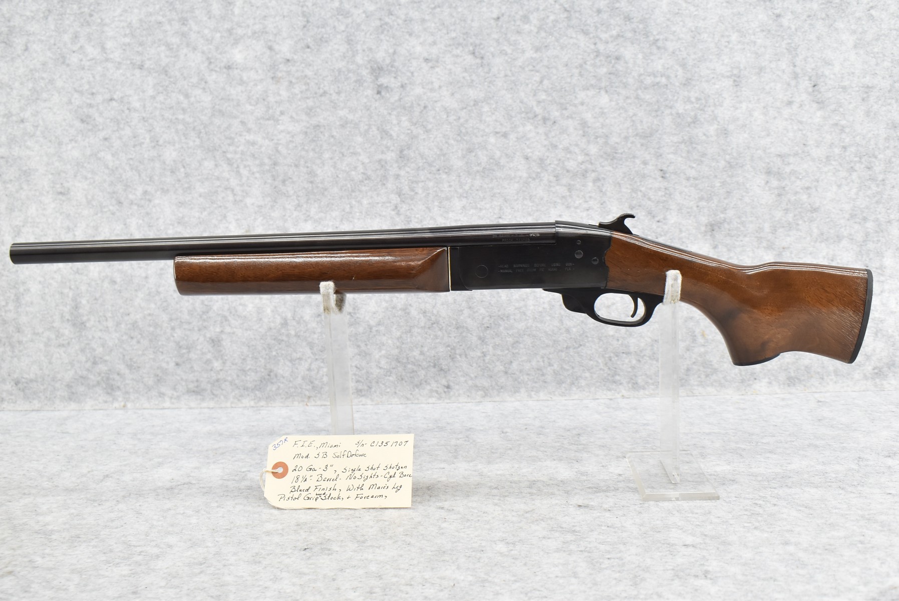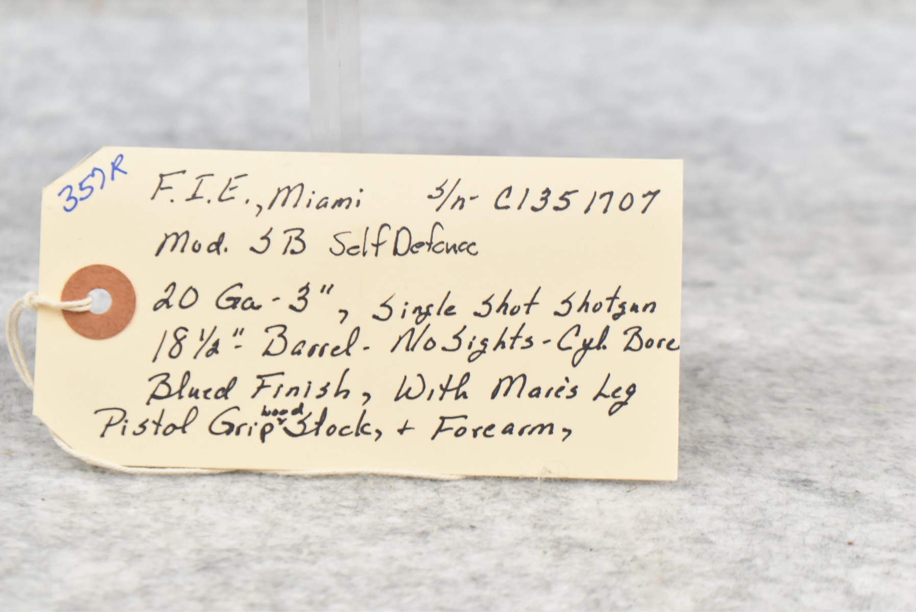 357R. F.I.E. (Miami) – Mod. SB Self Defense – 20ga. 3” Single Shot Shotgun – w/18 ½” Cyl. Choked Barrel (No Sights) – Blued Finish – w/Mare’s Leg Pistol Grip Wood Stocks