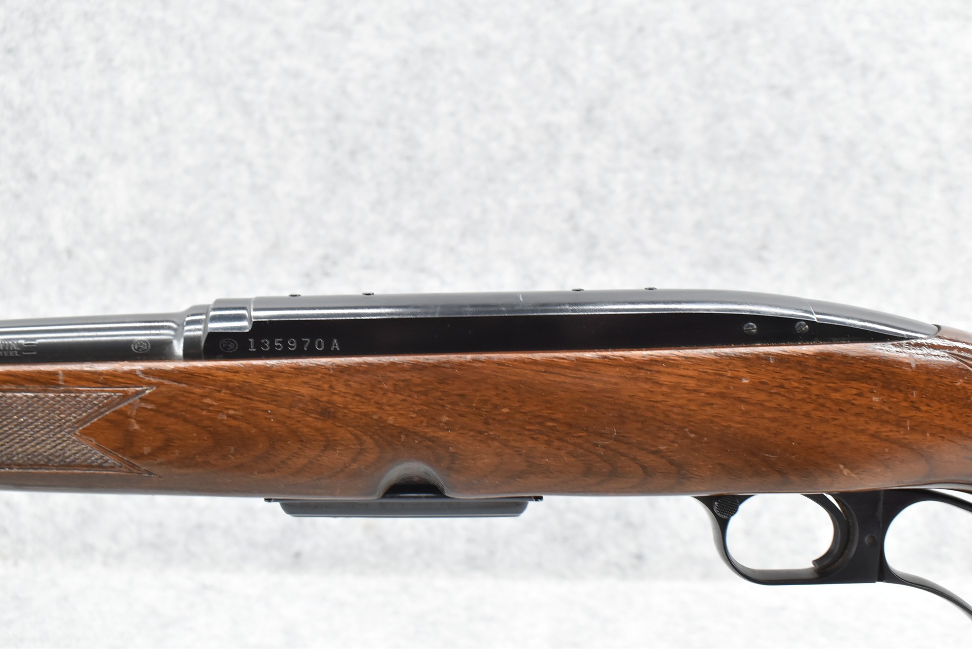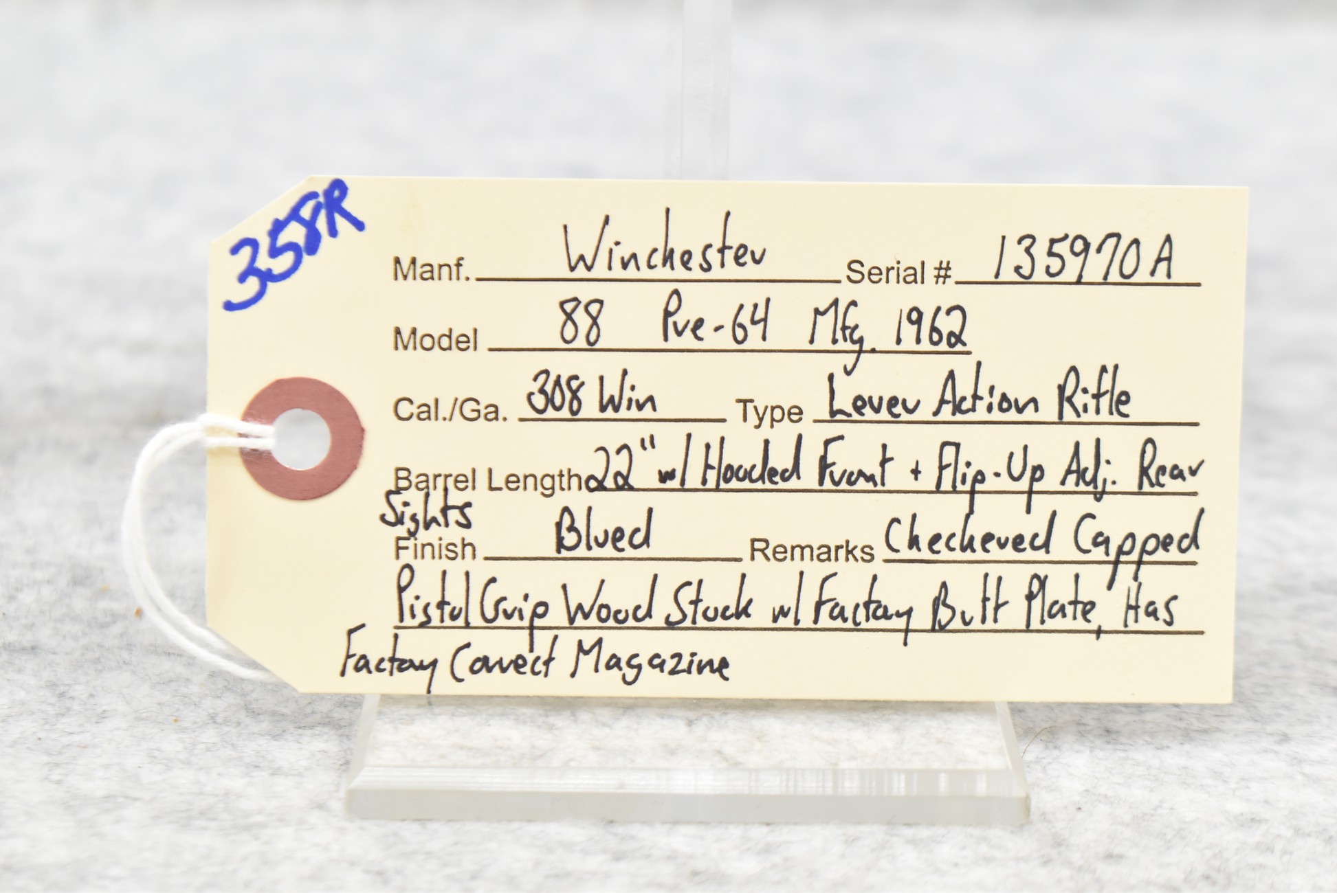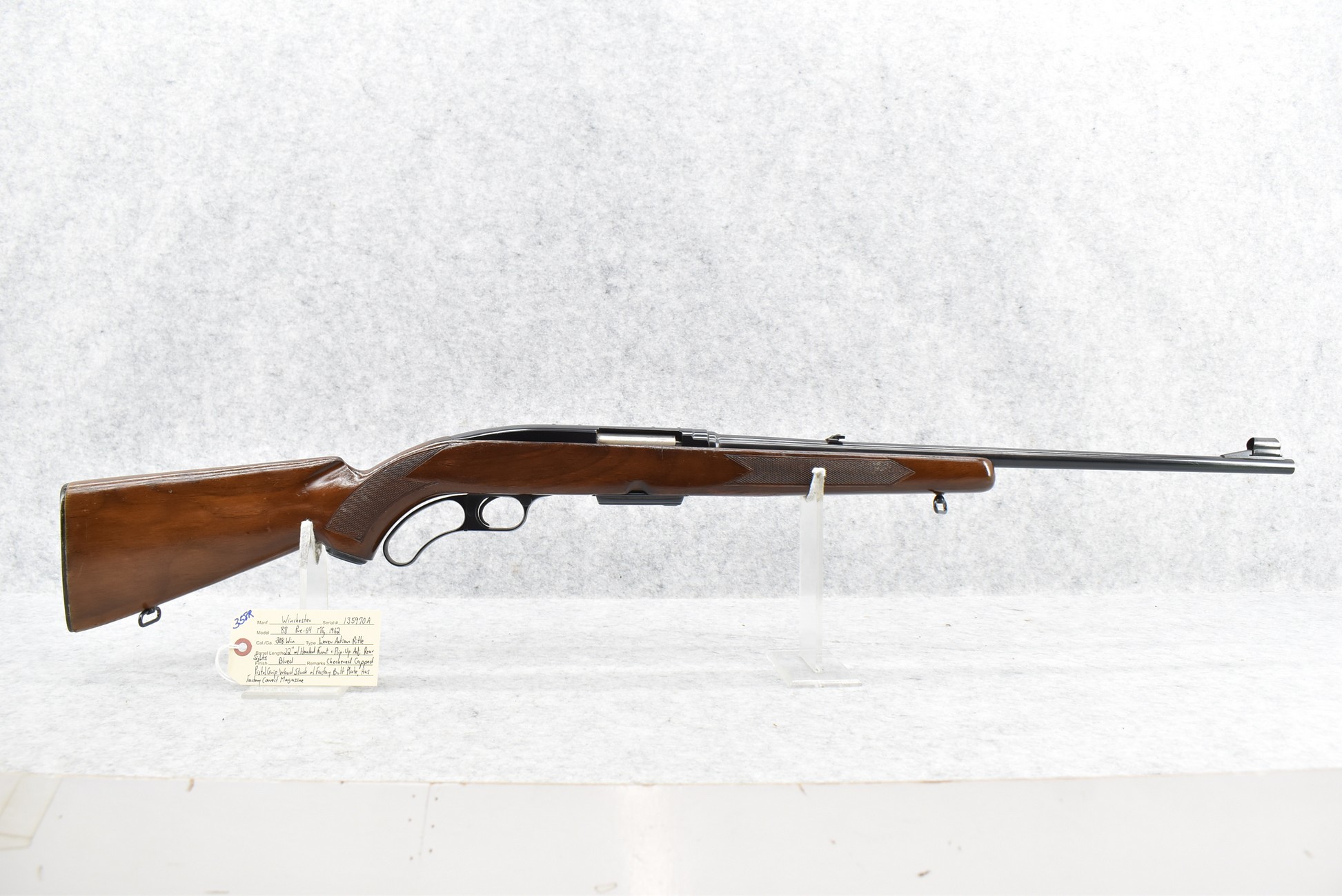 358R. Winchester – Mod. 88 “Pre-64” – 308 Win. Cal. Lever Action Rifle – w/22” Barrel w/Hooded Front and Flip-Up Adjustable Rear Sights – Blued Finish – w/Checkered Capped Pistol Grip Wood Stock w/Factory Butt Plate – w/Correct Factory Magazine – Manufactured 1962