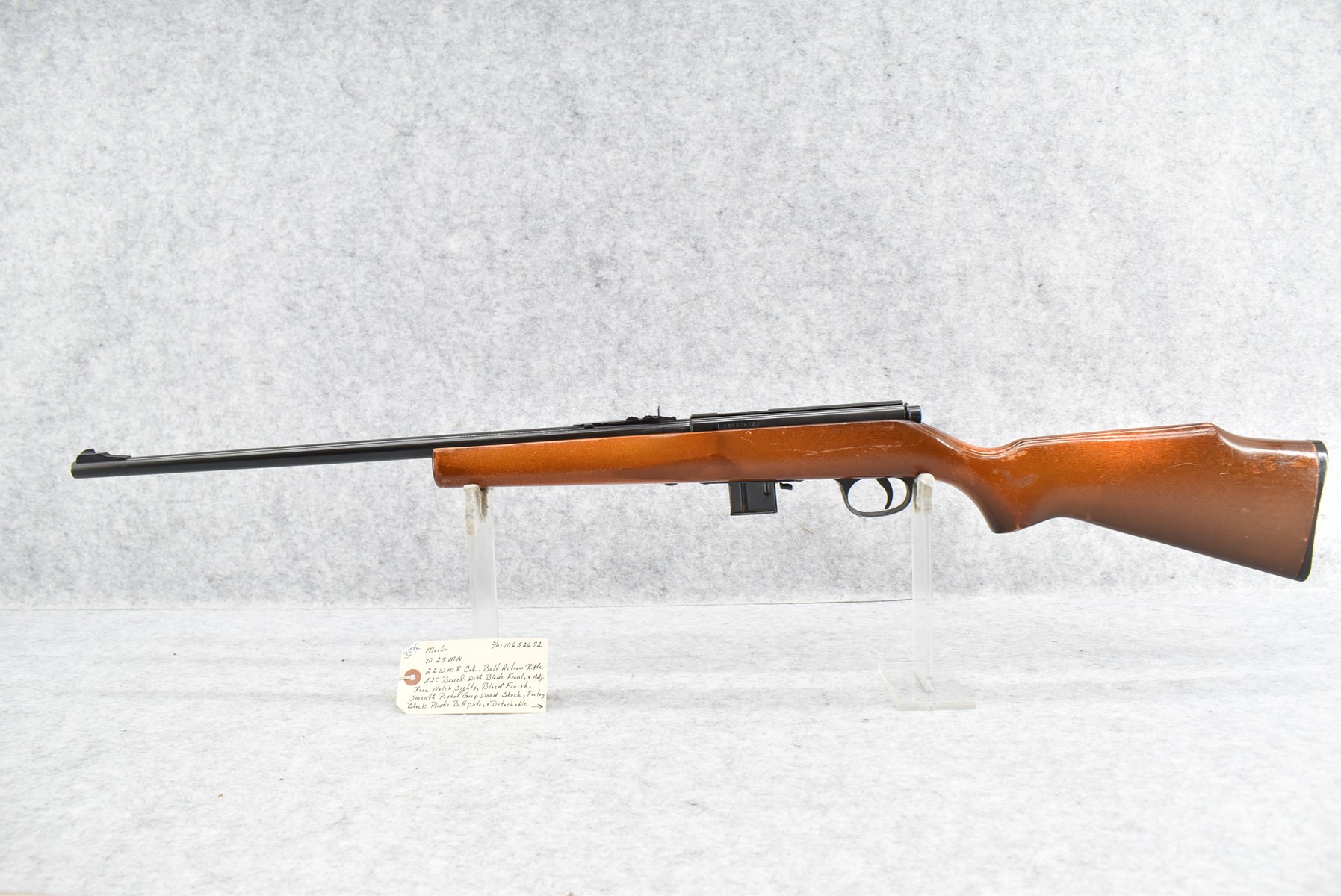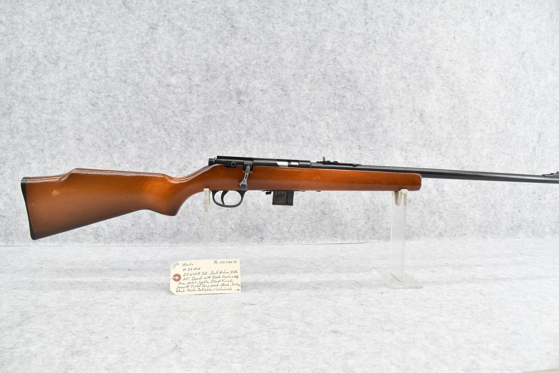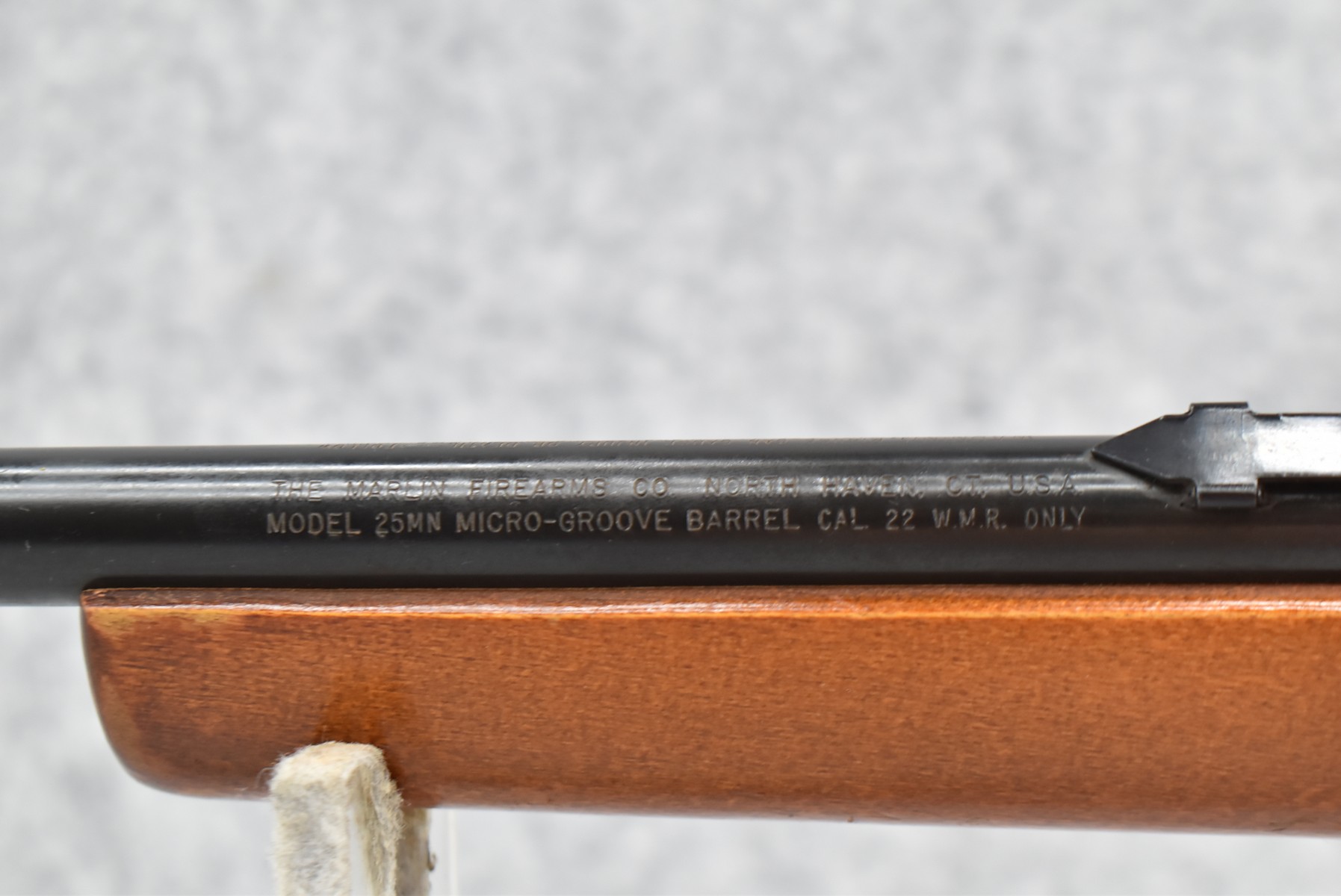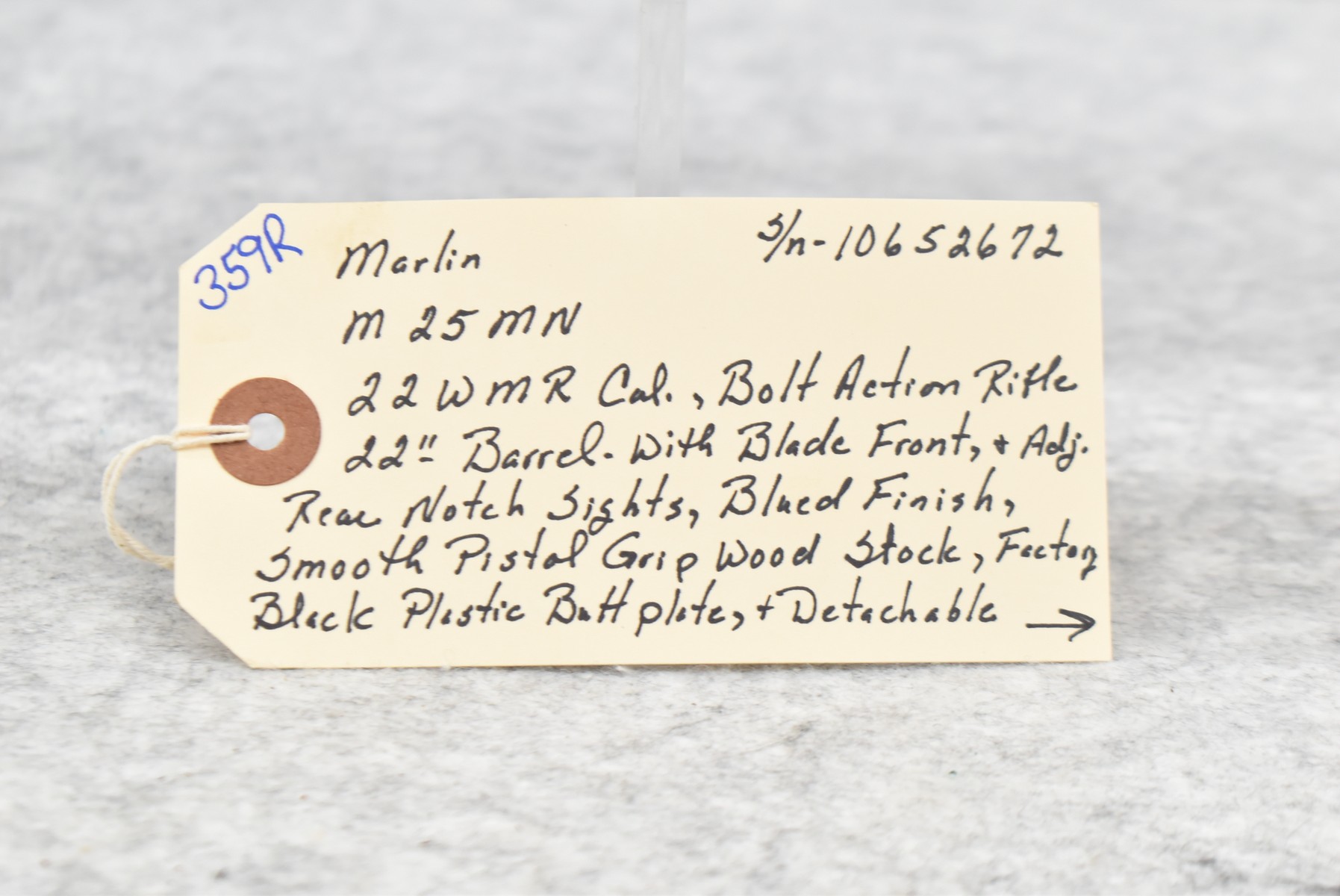 359R.     Marlin – Mod. 25MN – 22 WMR Cal. Bolt Action Rifle – w/22” Barrel w/Blade Front & Adj. Rear Notch Sights – Blued Finish – w/Smooth Pistol Grip Wood Stock w/Factory Butt Plate – w/Detachable Magazine