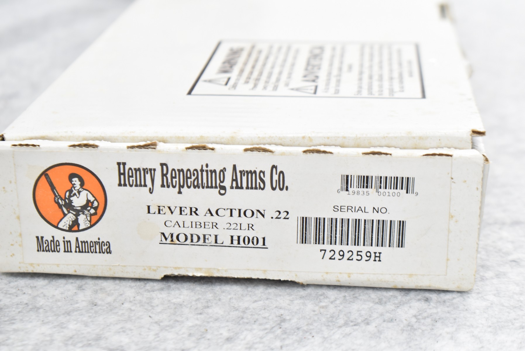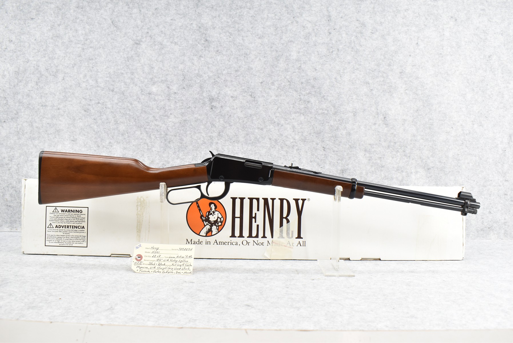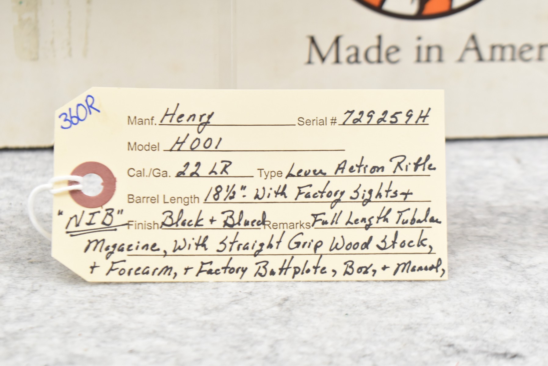360R.     Henry – Mod. H001 – 22LR Cal. Lever Action Rifle – w/18 ½” Barrel w/Factory Sights & Full Length Tubular Magazine – Blued Finish – w/Straight Grip Wood Stocks w/Factory Butt Plate – New w/Box & Manual