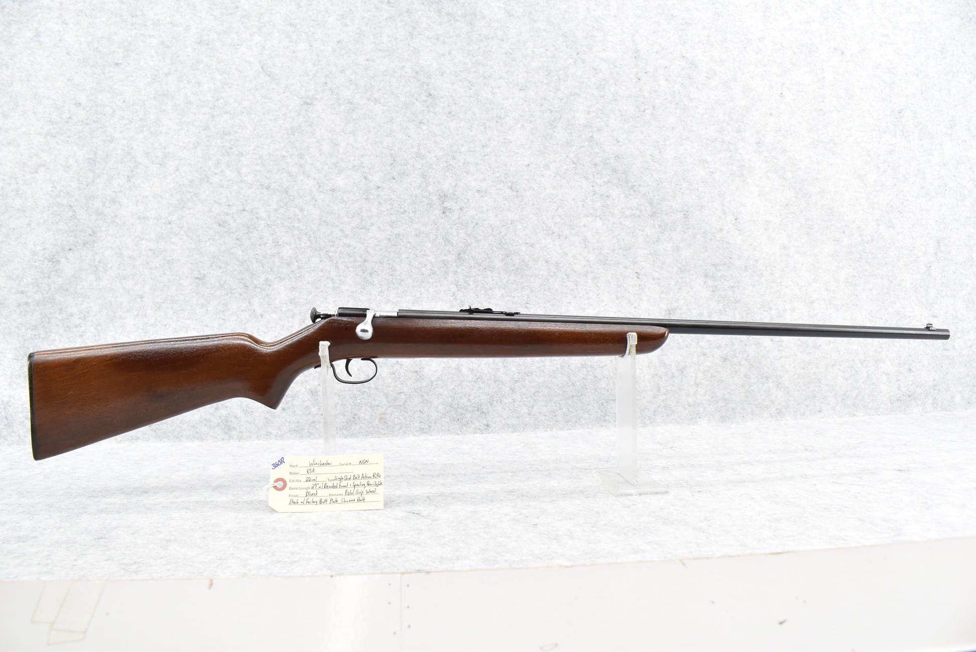 360R. Winchester – Mod. 67A – 22 Cal. Single Shot Bolt Action Rifle – w/27” Barrel w/Beaded Front & Sporting Rear Sights – Blued Finish – w/Pistol Grip Wood Stock w/Factory Butt Plate – w/Scarce Chrome Bolt